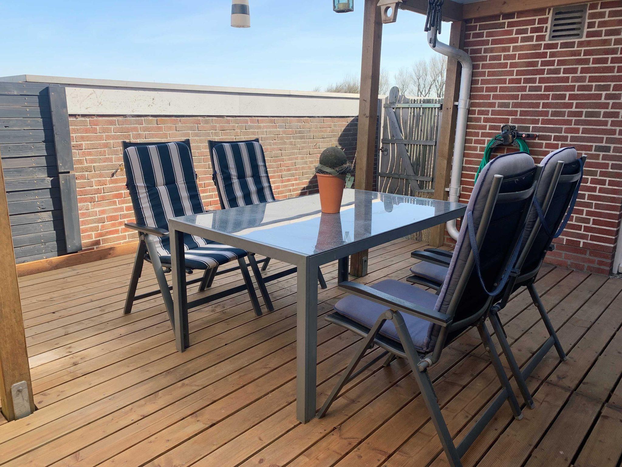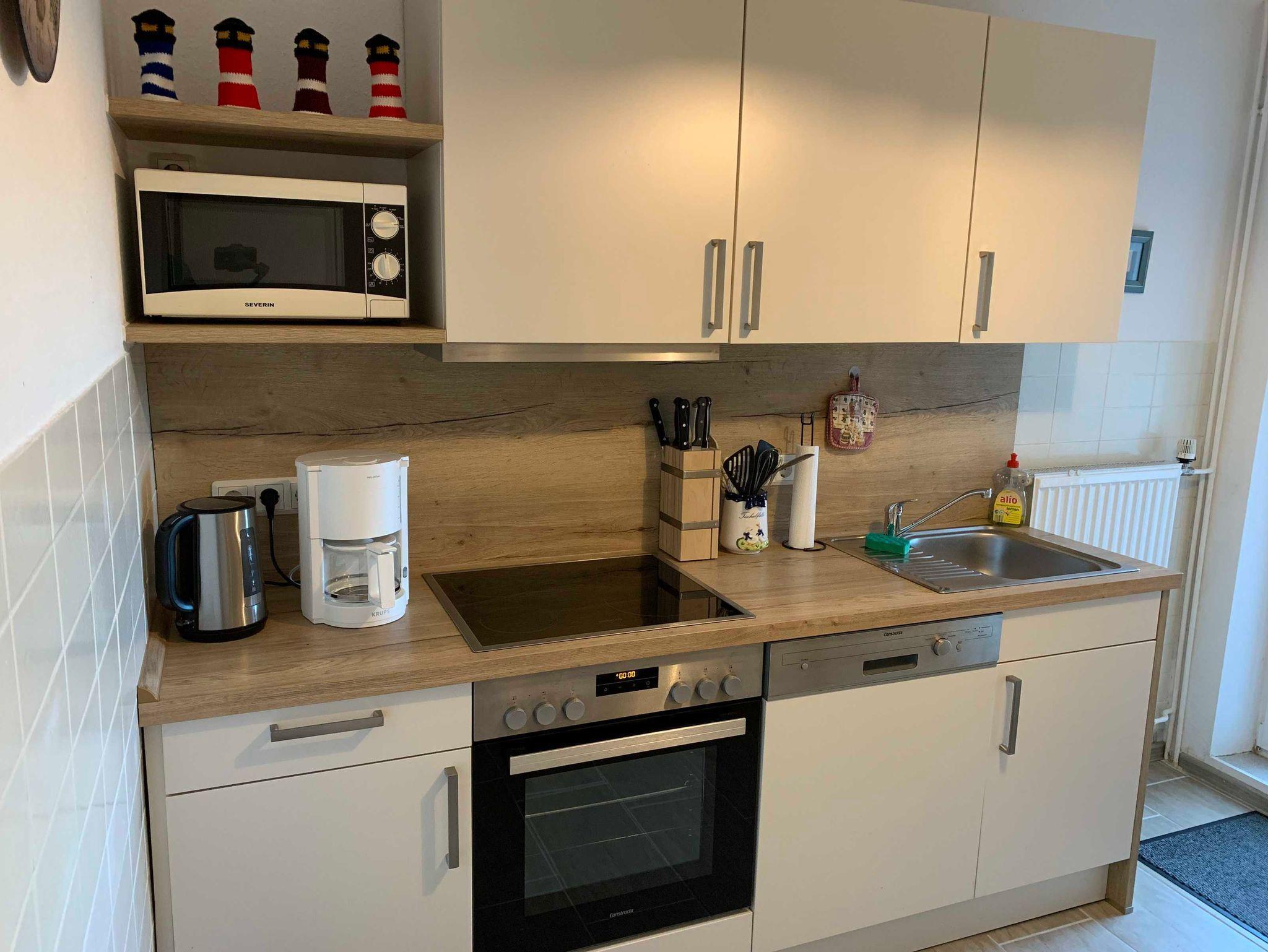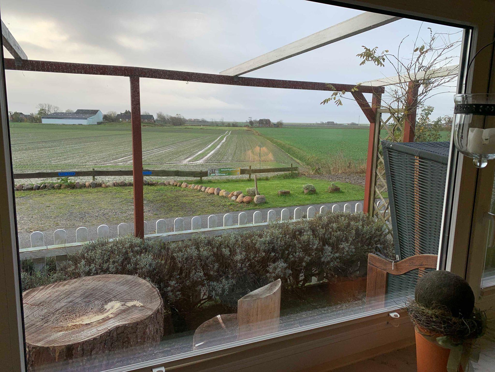 Das Wohnzimmer mit Essecke und Schreibtisch ist sehr geräumig und bietet einen Panoramablick auf die Felder und Wiesen Nordstrands. Die Küche, von der aus man auf die teilüberdachte Terrasse betreten kann, ist voll ausgestattet inklusive Backofen und Geschirrspüler.