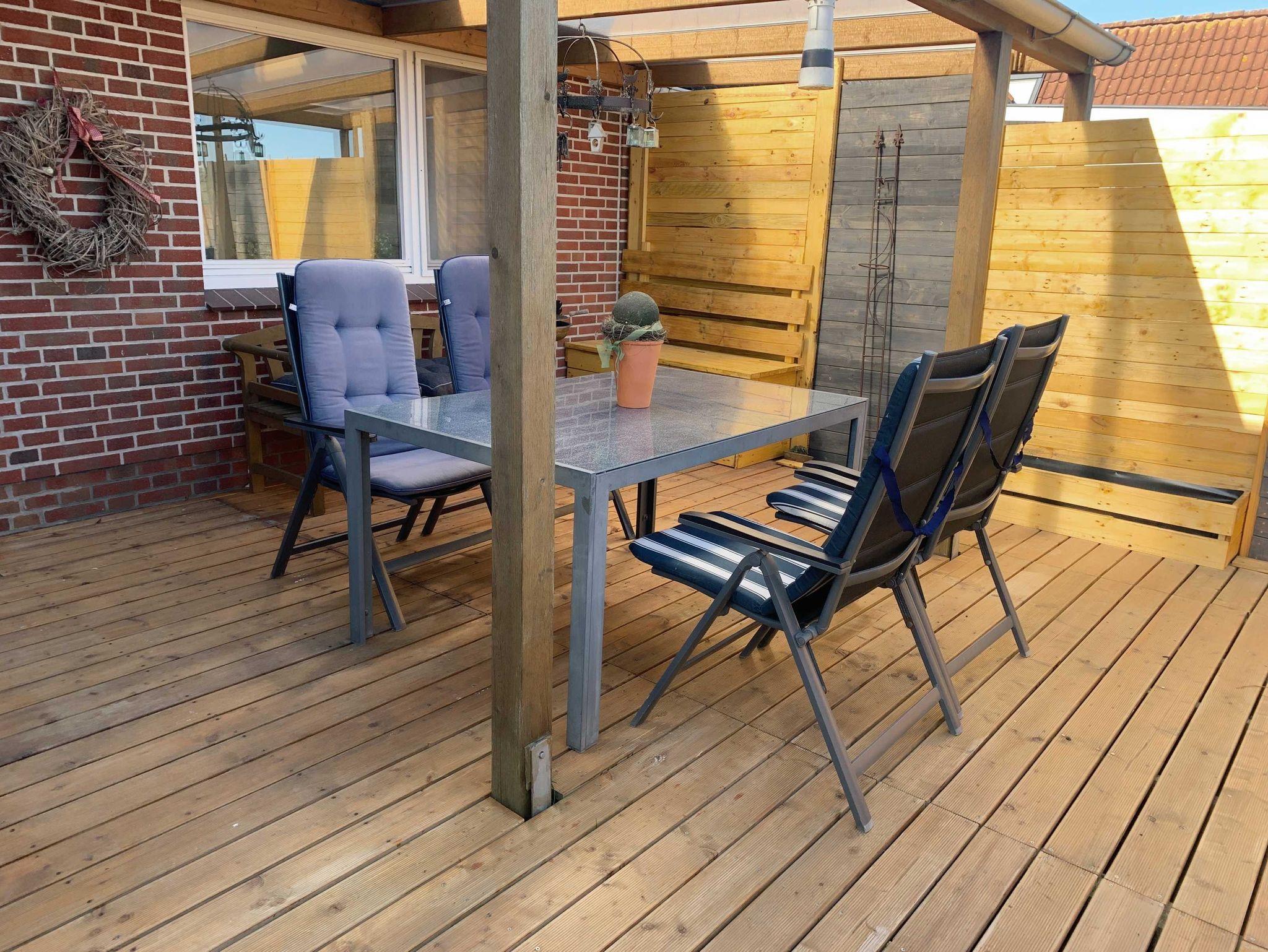 Gemütliche Erdgeschosswohnung mit Deichblick auf Nordstrand, ideal für erholsame Tage in der Natur.