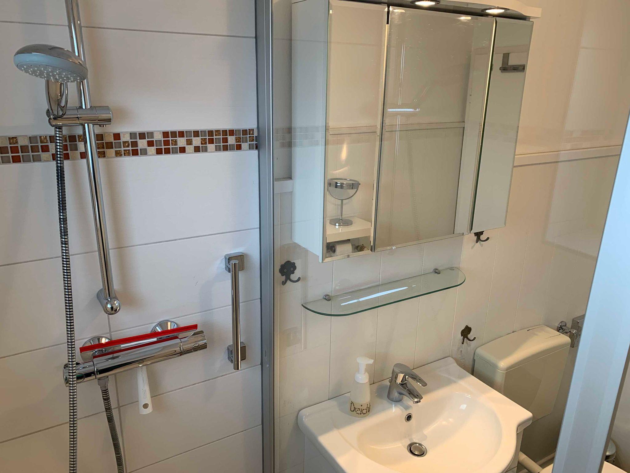 Unser Haus am Deich - Wohnung Deichblick, direkt am Nordstrander Aussendeich gelegen bietet Platz für bis zu 4 Personen. Die Erdgeschoßwohnung hat zwei Schlafzimmer, eines mit Doppelbett und eines mit zwei Einzelbetten.