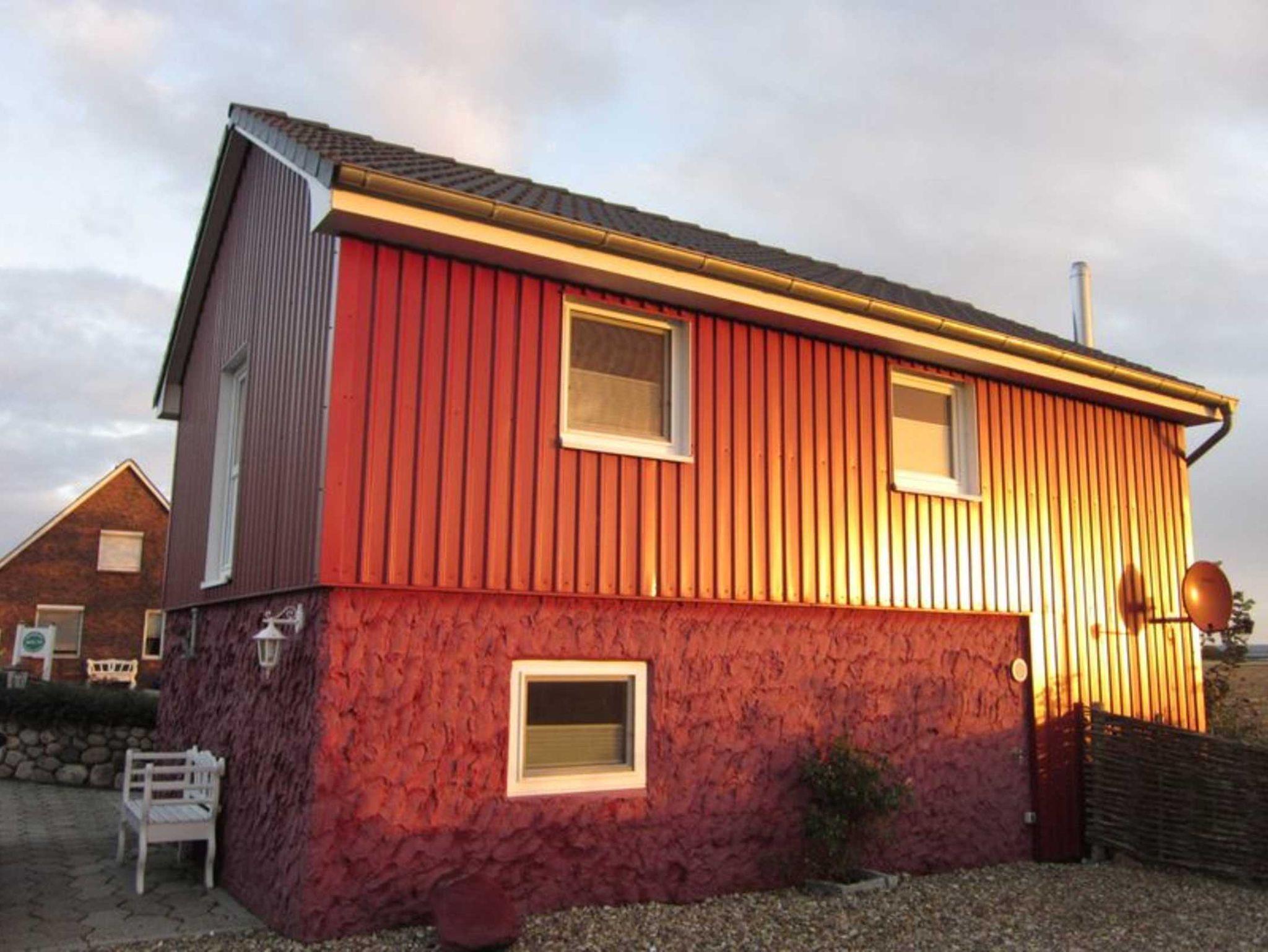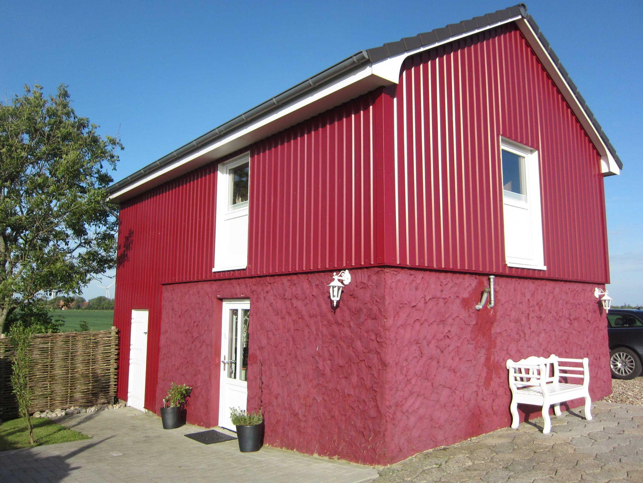 Das Rote Atelierhaus Nordseenest auf Nordstrand bietet modernen Komfort und idyllischen Garten mit Strandkorb.
