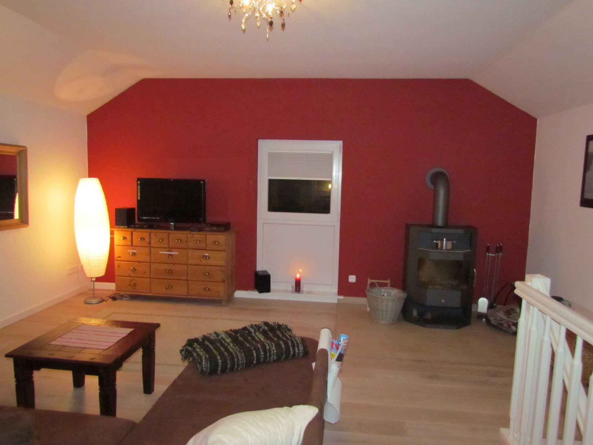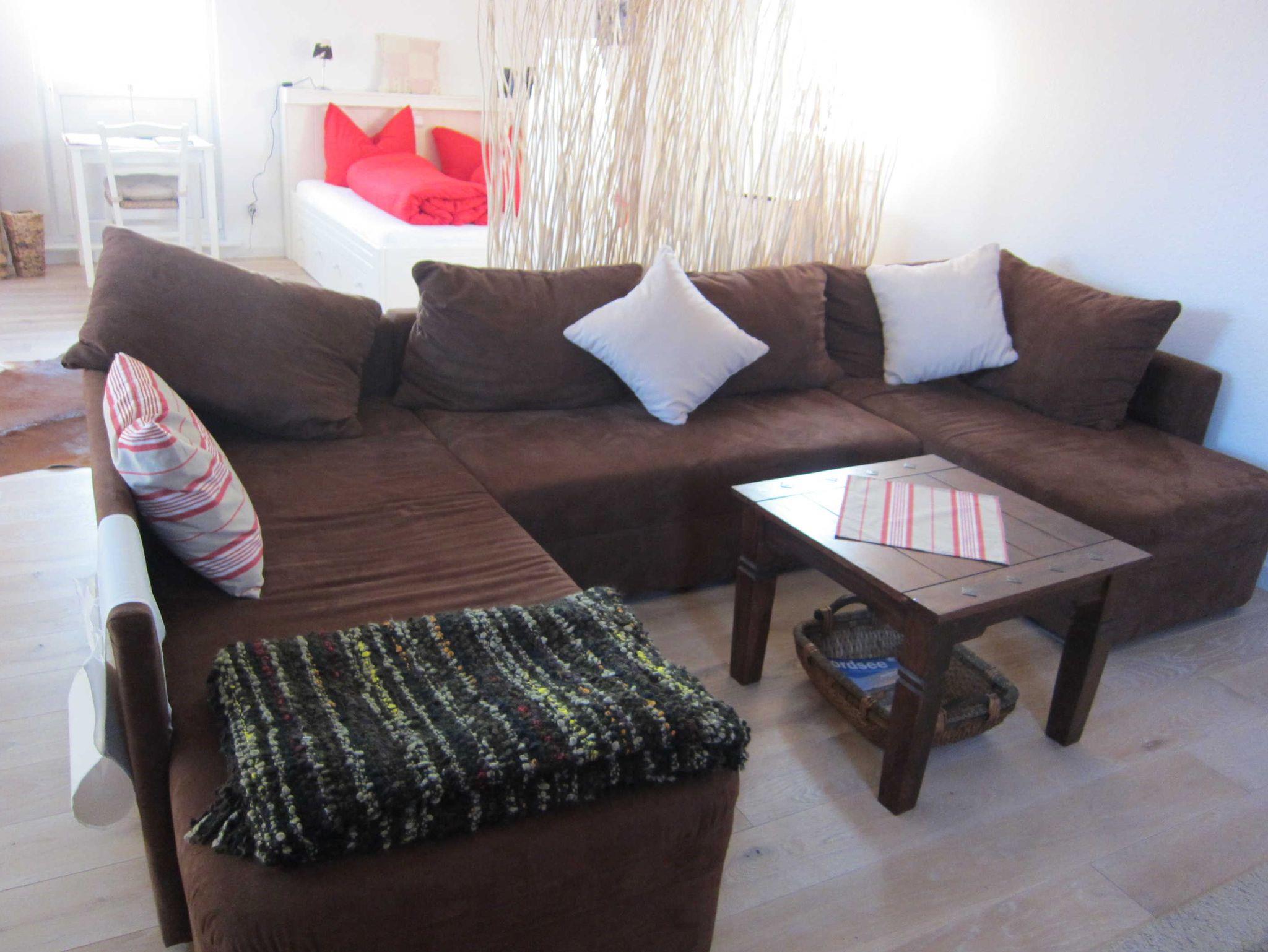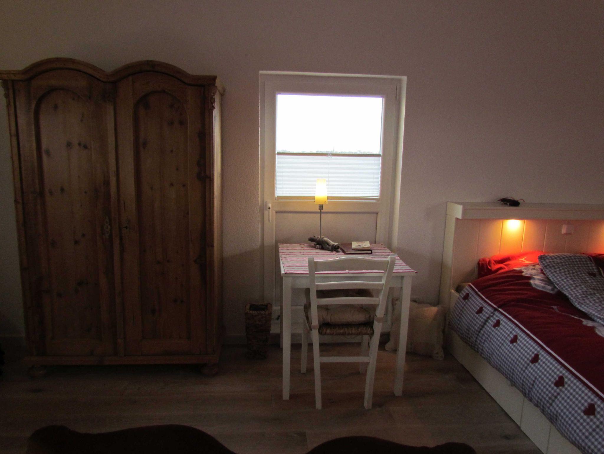 Der großzügige und lichtdurchflutete Wohn-Schlafraum ist unterteilt durch einen Sichtschuz und bietet ein stilvoll eingebautes Doppelbett (Liegefläche: 160 x 200 cm, 2 Matratzen à 80 cm Breite) sowie einen außergewöhnlich freundlich und hochwertig eingerichteten Atelier-Wohnraum mit Massivholzfußboden, LED-SAT-TV, DVD, Stereo-Anlage mit iPod-Dockingstation, Radio, CD- und DVD-Player sowie eine schnelle WLAN-Verbindung. Das, ein heimeliger Ofen, sowie Bücher und Spiele tragen dazu bei, dass auch bei Schietwettertagen für Wohlbefinden und Unterhaltung zu Hause gesorgt ist. Ein Kinderbett sowie ein Kinderhochstuhl, Toilettenaufsatz und ein Trittschemel können zur Verfügung gestellt werden.