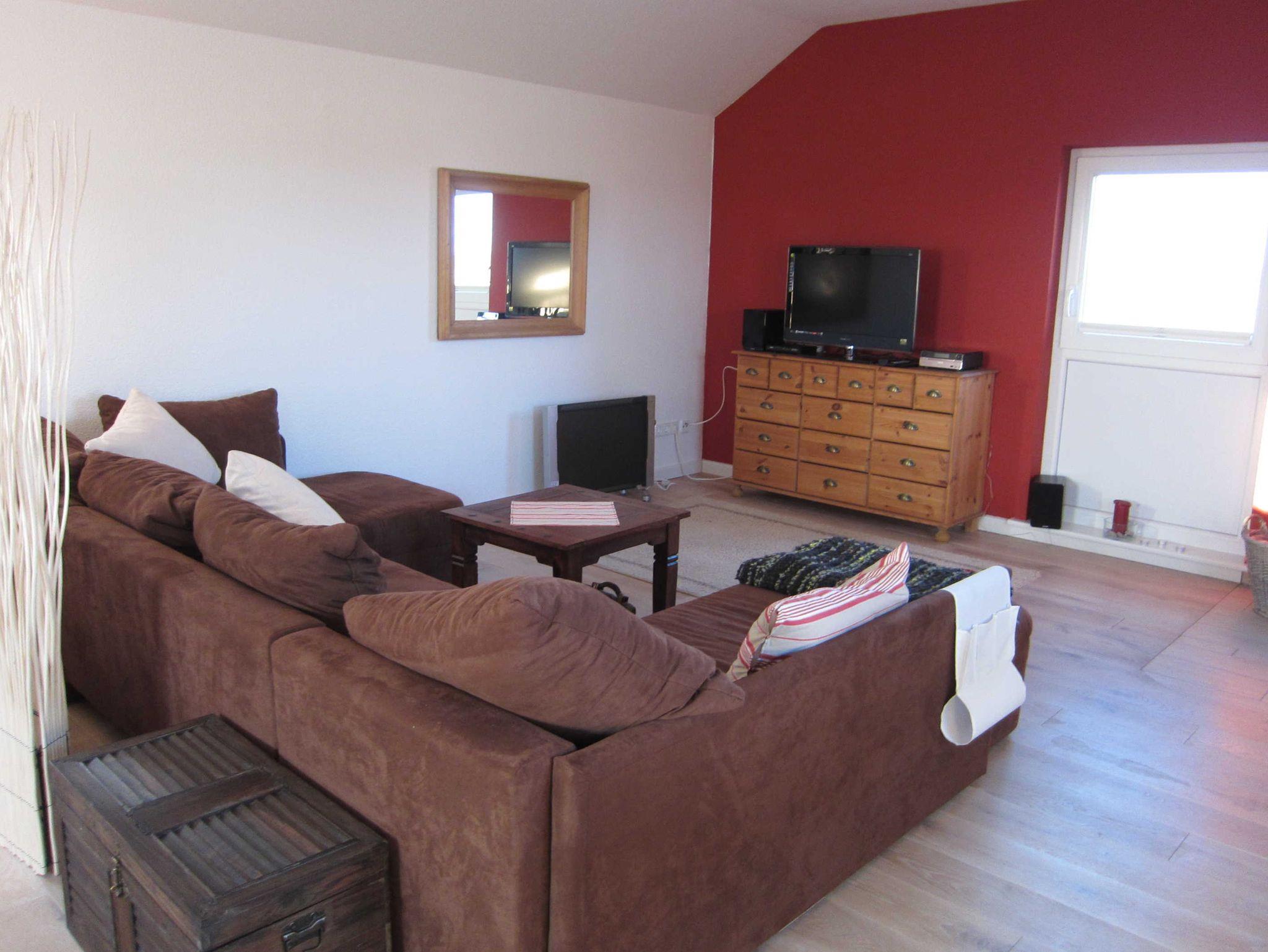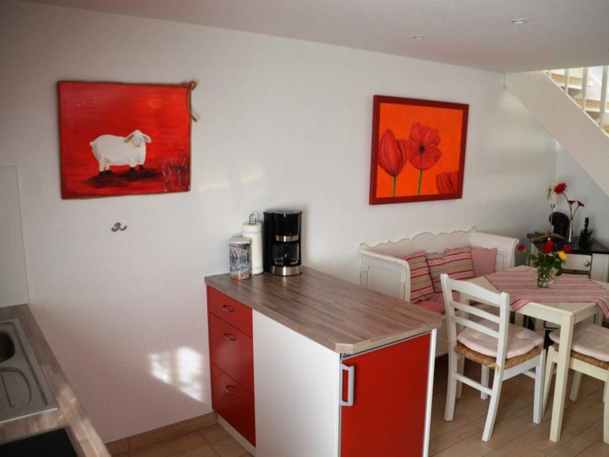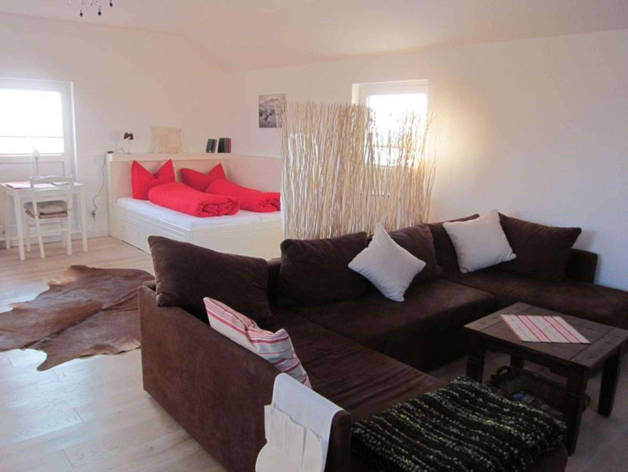 Der großzügige und lichtdurchflutete Wohn-Schlafraum ist unterteilt durch einen Sichtschuz und bietet ein stilvoll eingebautes Doppelbett (Liegefläche: 160 x 200 cm, 2 Matratzen à 80 cm Breite) sowie einen außergewöhnlich freundlich und hochwertig eingerichteten Atelier-Wohnraum mit Massivholzfußboden, LED-SAT-TV, DVD, Stereo-Anlage mit iPod-Dockingstation, Radio, CD- und DVD-Player sowie eine schnelle WLAN-Verbindung. Das, ein heimeliger Ofen, sowie Bücher und Spiele tragen dazu bei, dass auch bei Schietwettertagen für Wohlbefinden und Unterhaltung zu Hause gesorgt ist. Ein Kinderbett sowie ein Kinderhochstuhl, Toilettenaufsatz und ein Trittschemel können zur Verfügung gestellt werden.