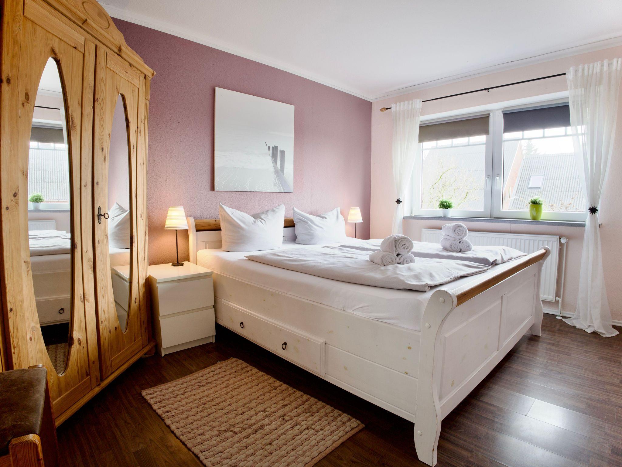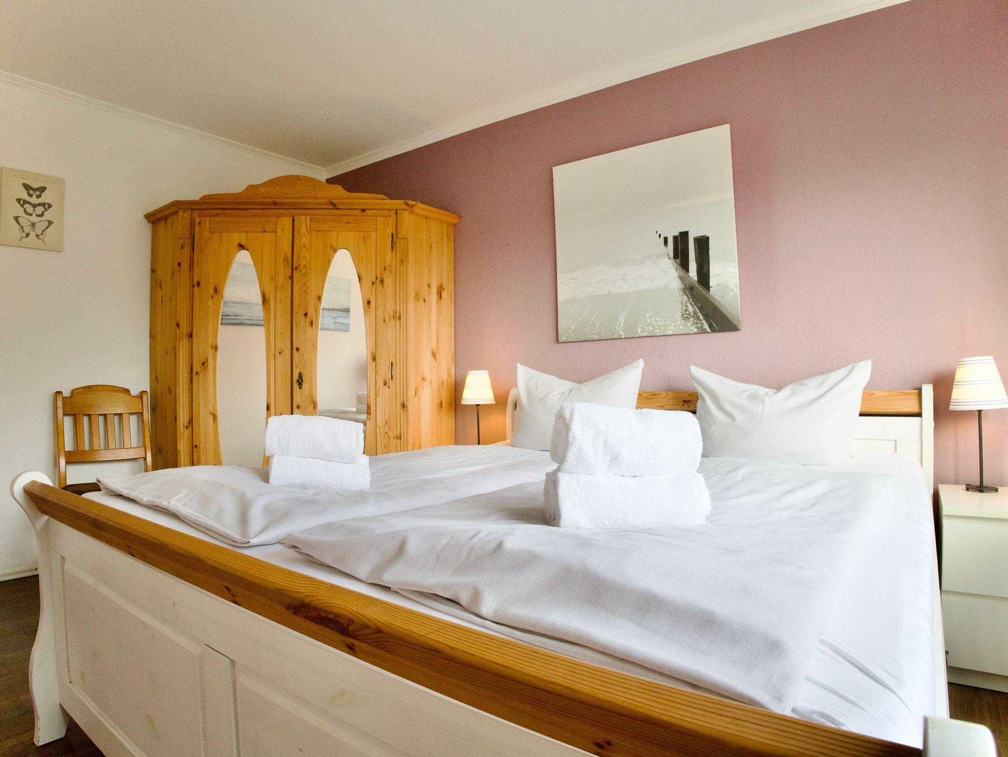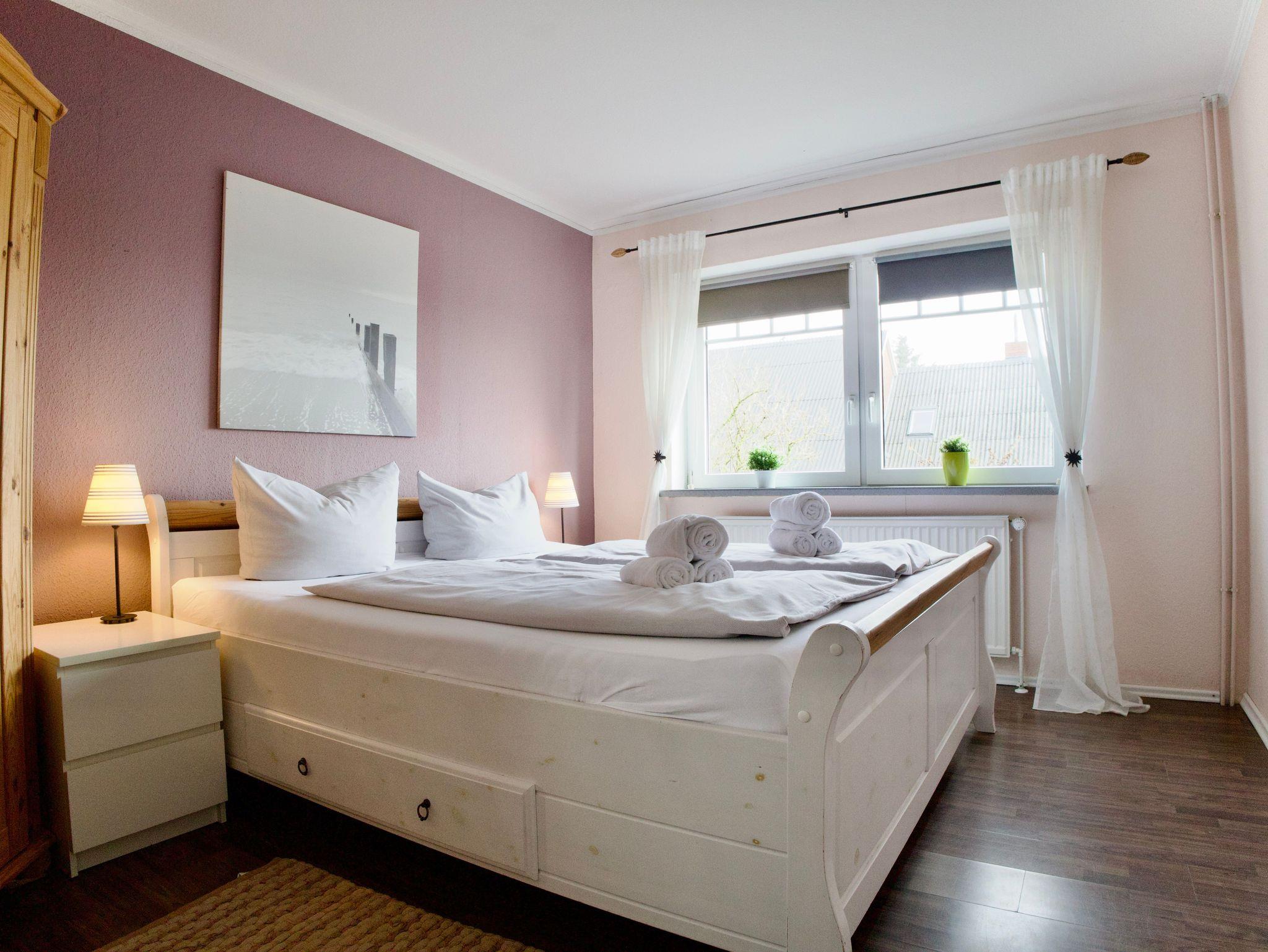 Die Wohnung verfügt über zwei Schlafzimmer. Eines ist mit einem Doppelbett ausgestattet, das zweite bietet zwei Einzelbetten. Beide Schlafräume sind hell, klar gestaltet und schaffen ruhige Rückzugsorte für erholsame Nächte.