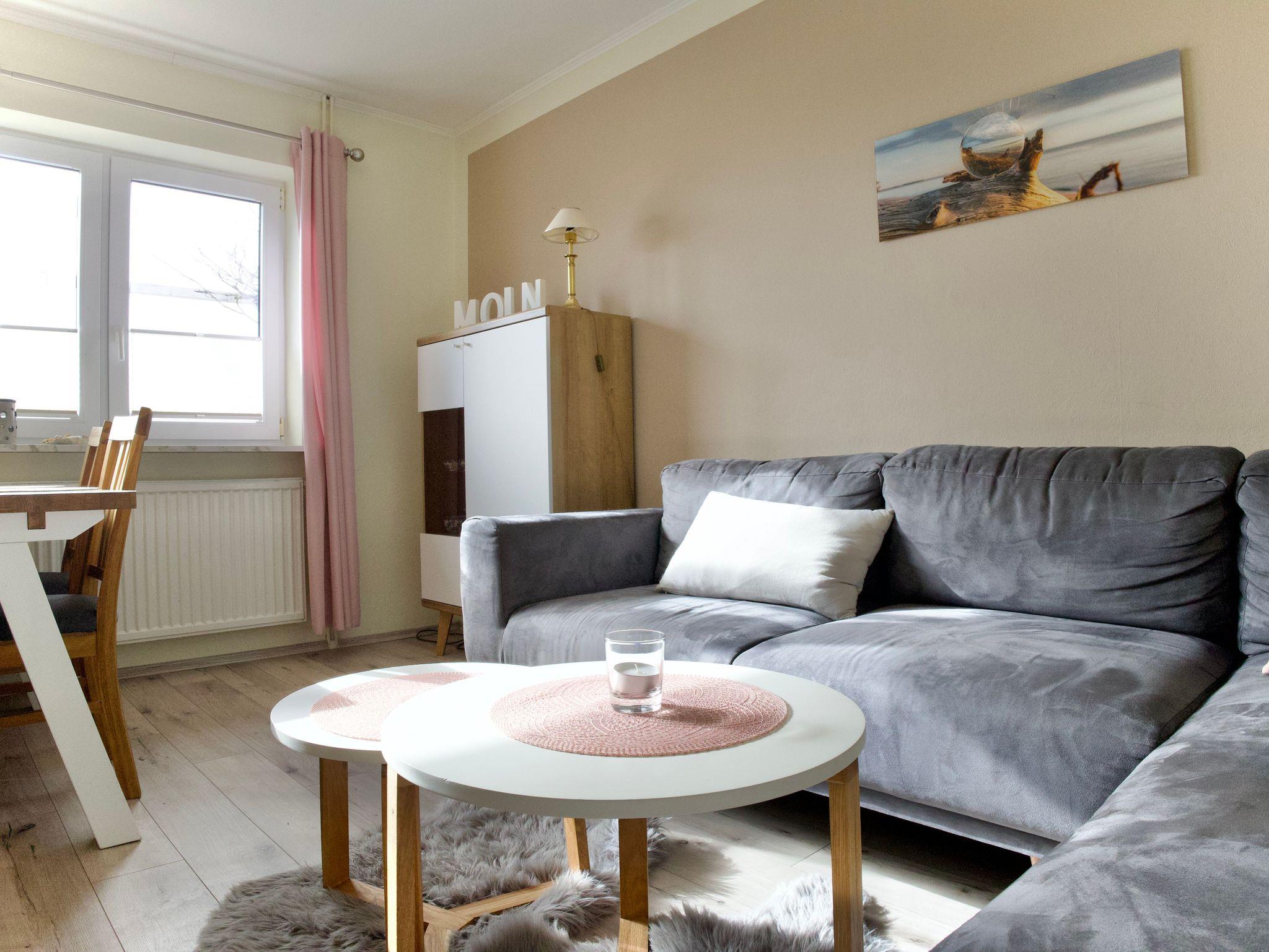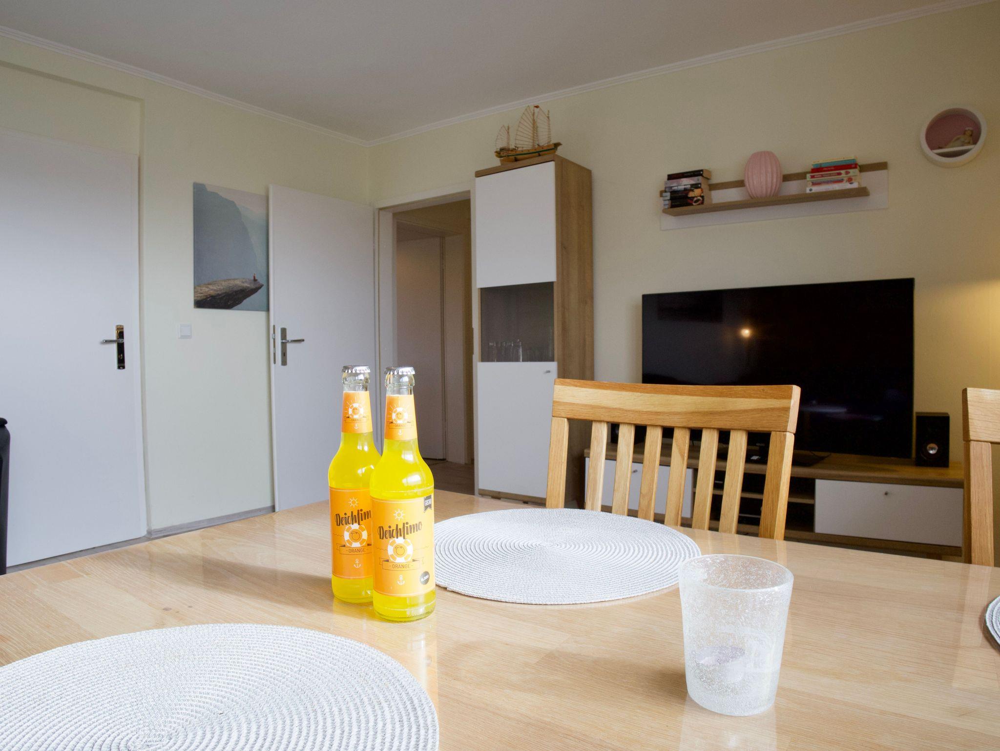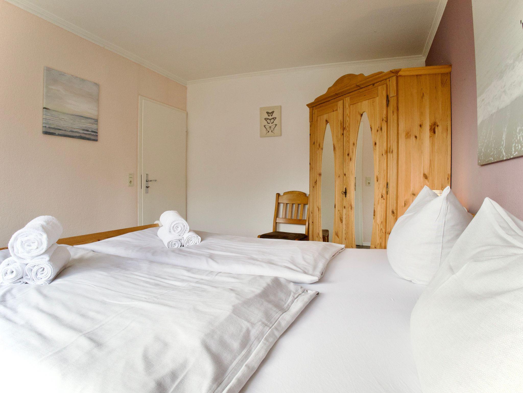 Die Wohnung verfügt über zwei Schlafzimmer. Eines ist mit einem Doppelbett ausgestattet, das zweite bietet zwei Einzelbetten. Beide Schlafräume sind hell, klar gestaltet und schaffen ruhige Rückzugsorte für erholsame Nächte.