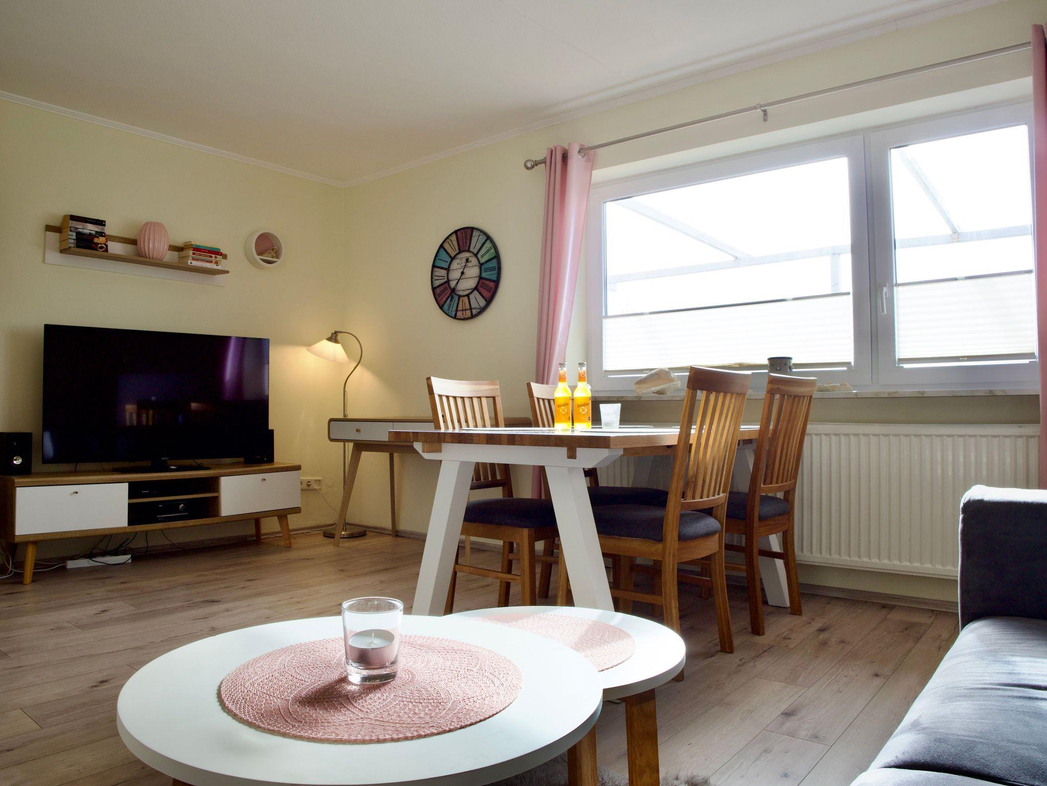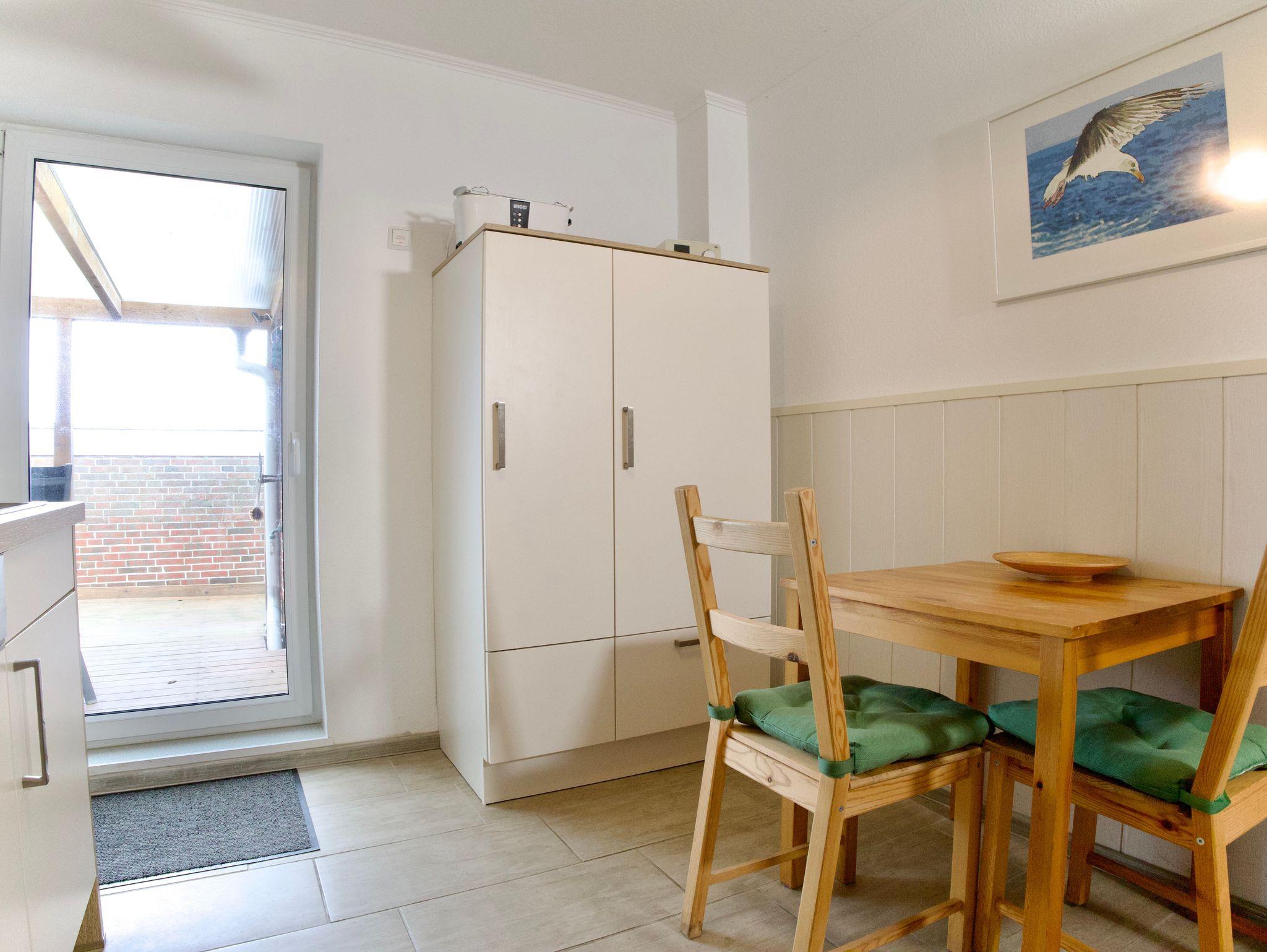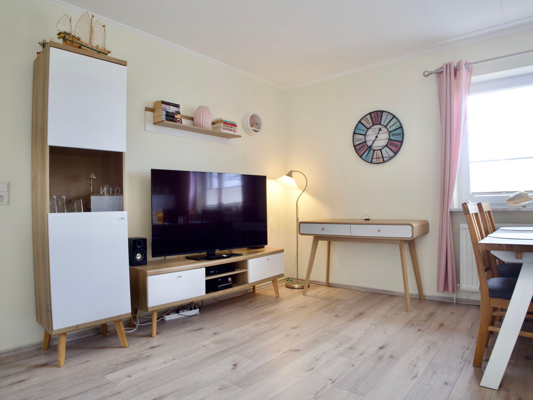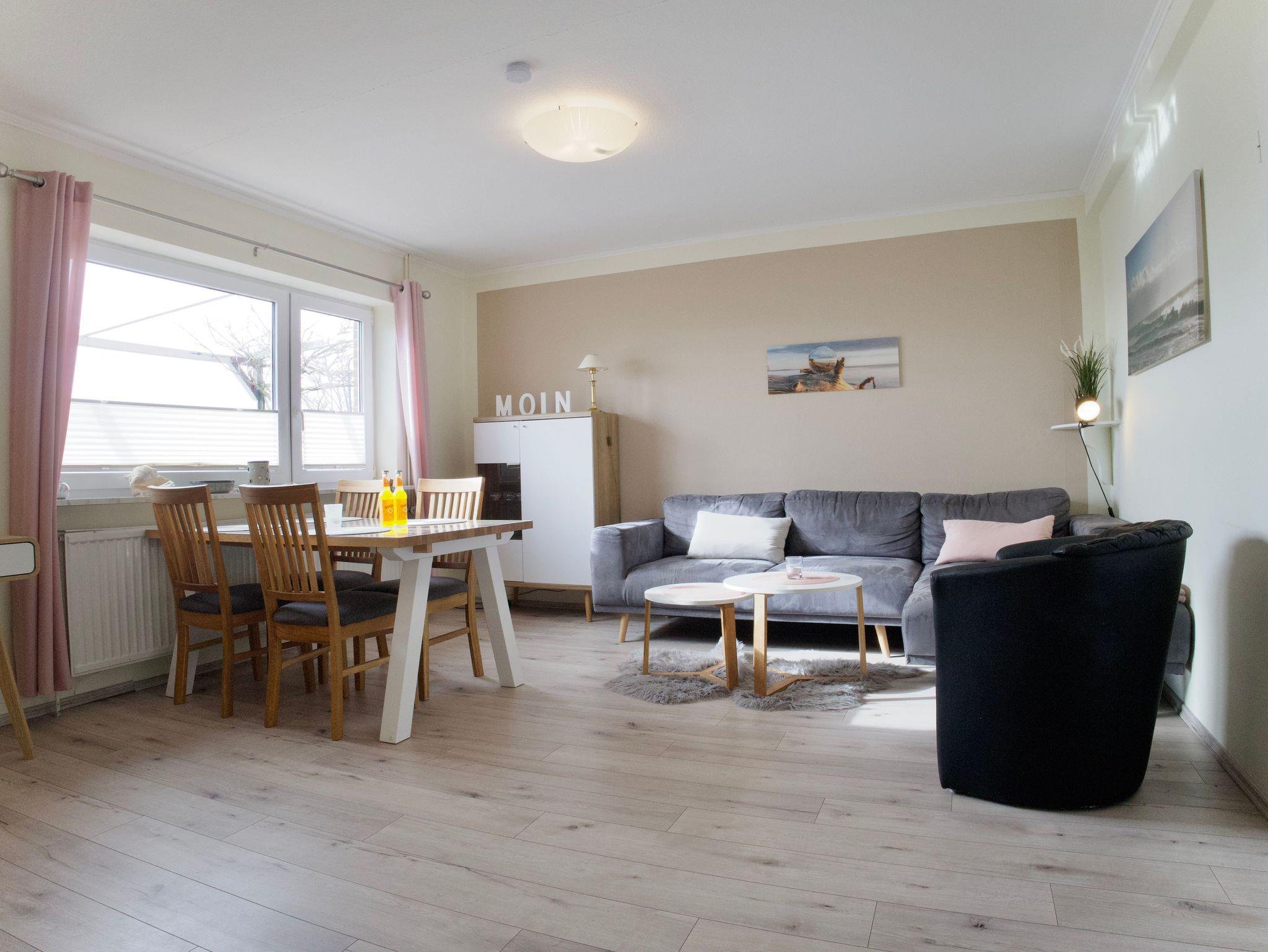 Herzstück der Wohnung ist das großzügige Wohnzimmer mit Essecke und Schreibtisch. Große Fenster lassen viel Tageslicht herein und eröffnen einen weiten Blick über die grünen Felder und Wiesen Nordstrands. Holzakzente unterstreichen die freundliche, ruhige Atmosphäre und machen den Wohnbereich zu einem angenehmen Ort für gemeinsame Zeit.
