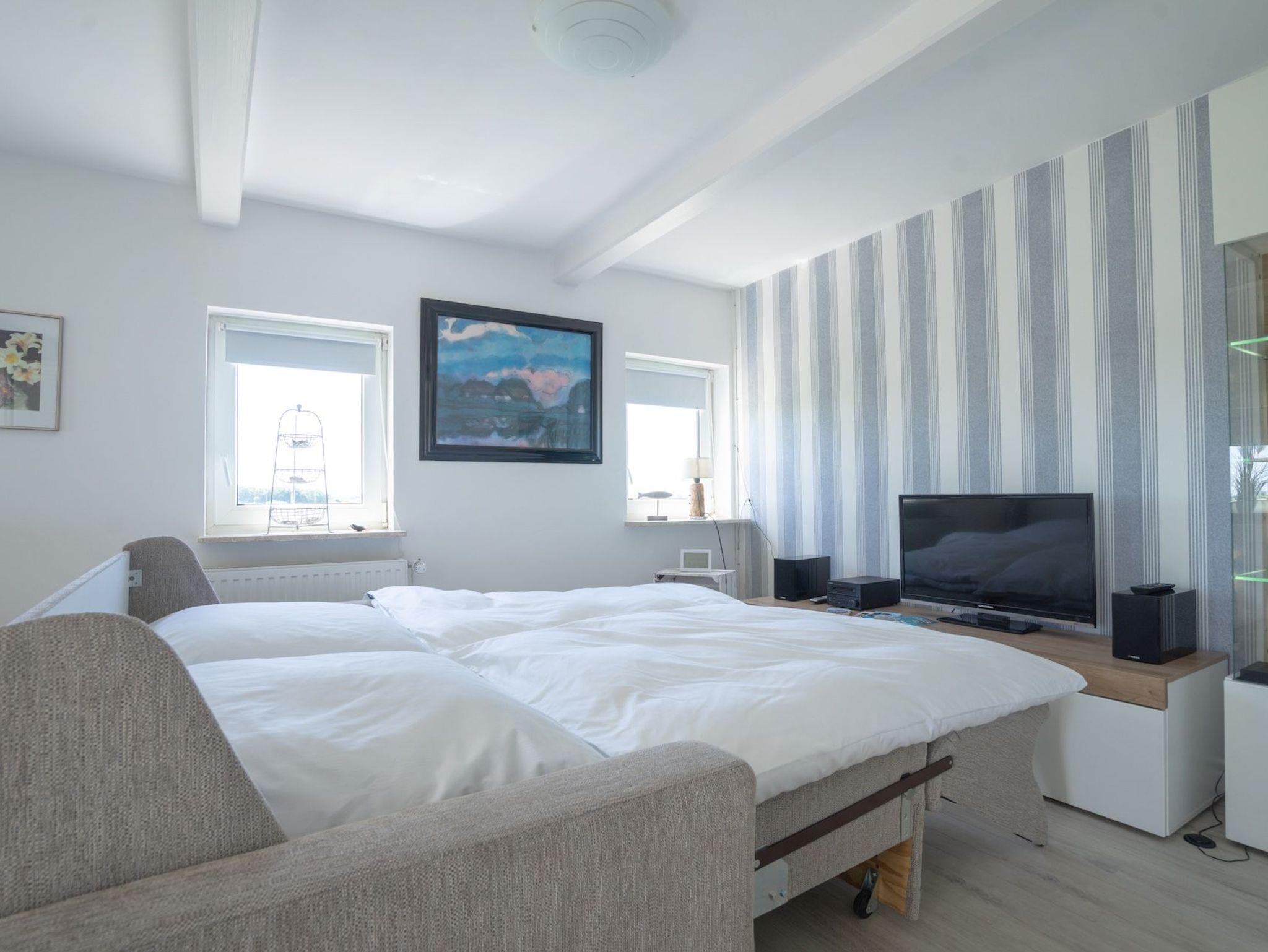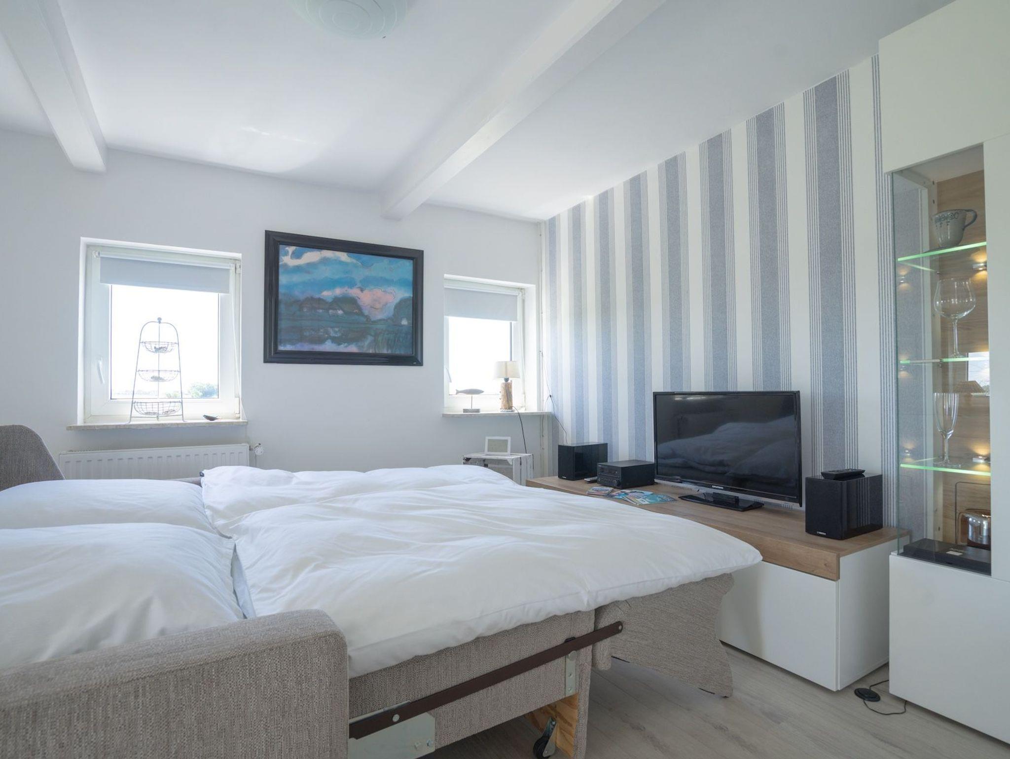 Das 30 qm große Studio empfängt Sie mit einem hellen Wohn-/Schlafraum, ausgestattet mit einem komfortablen Doppelbett und einer kleinen Sitzecke am Fenster. Durch die großen Glasflächen haben Sie freie Sicht auf die Marschen.