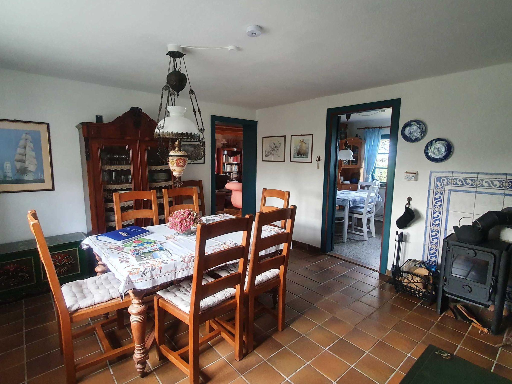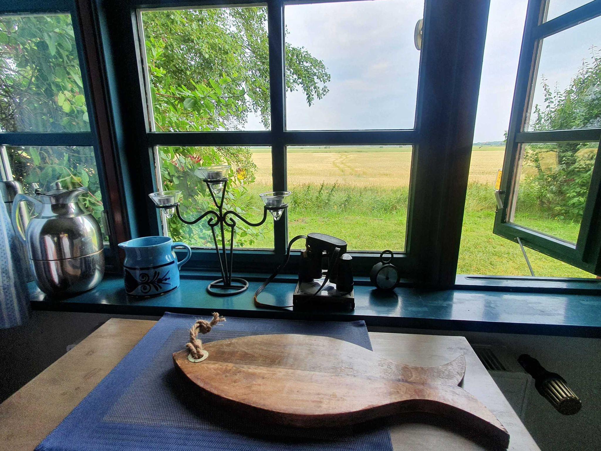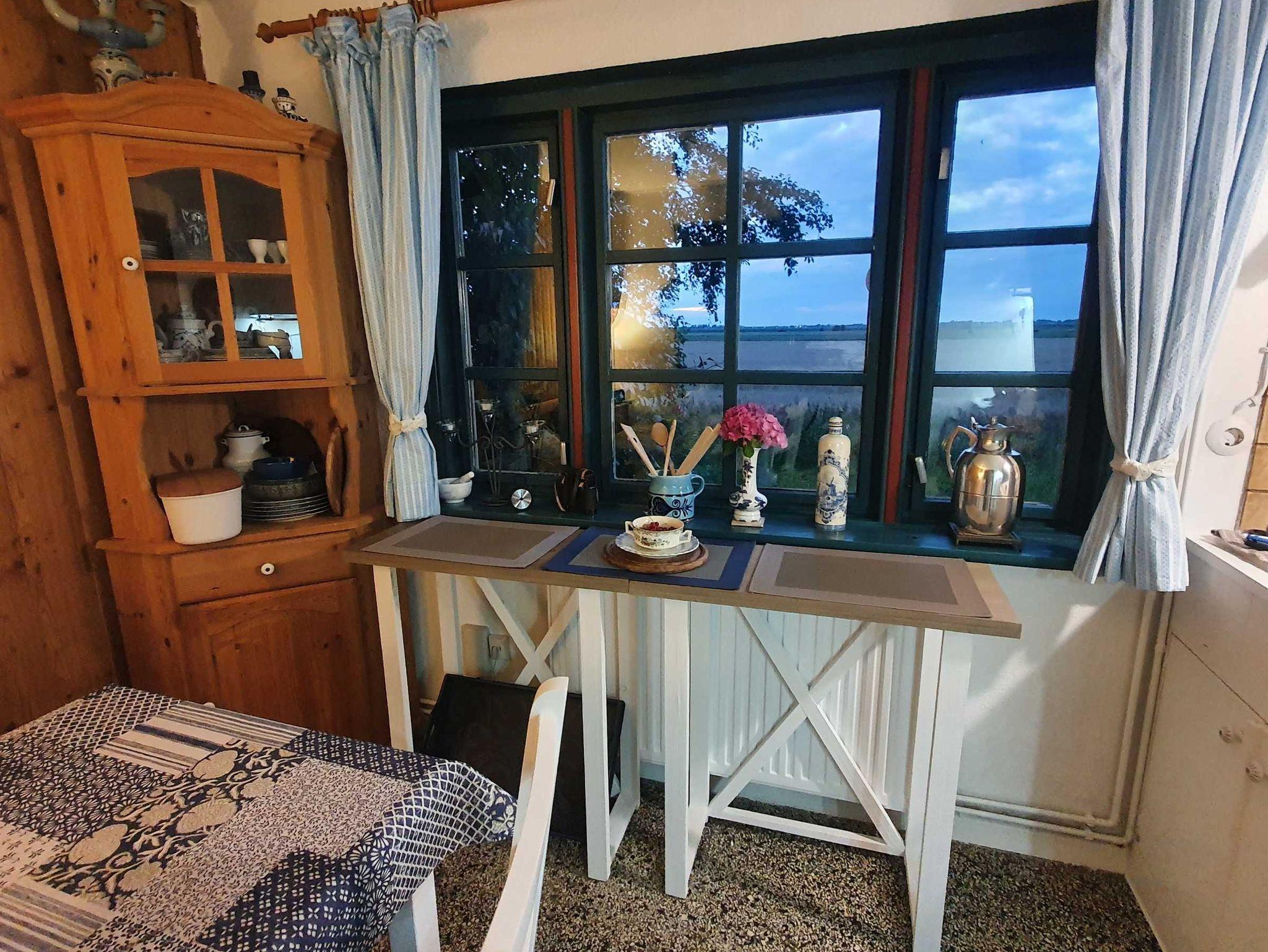 Das Besondere im EG ist der Original Alkoven mit somit einem weiteren Bett (180 x 90), Holzofen, großem Essbereich mit ausgesucht wertigem Geschirr sowie sehr gut und Detail-verliebt ausgestattete Küche mit Essecke, Küchenblock, Retro-Herd und nostalgischer Haube sowie unendlich weit schweifendem Blick über den Deich und die Felder bis dorthin, wo man das Meer schon ganz in der Nähe weiß.