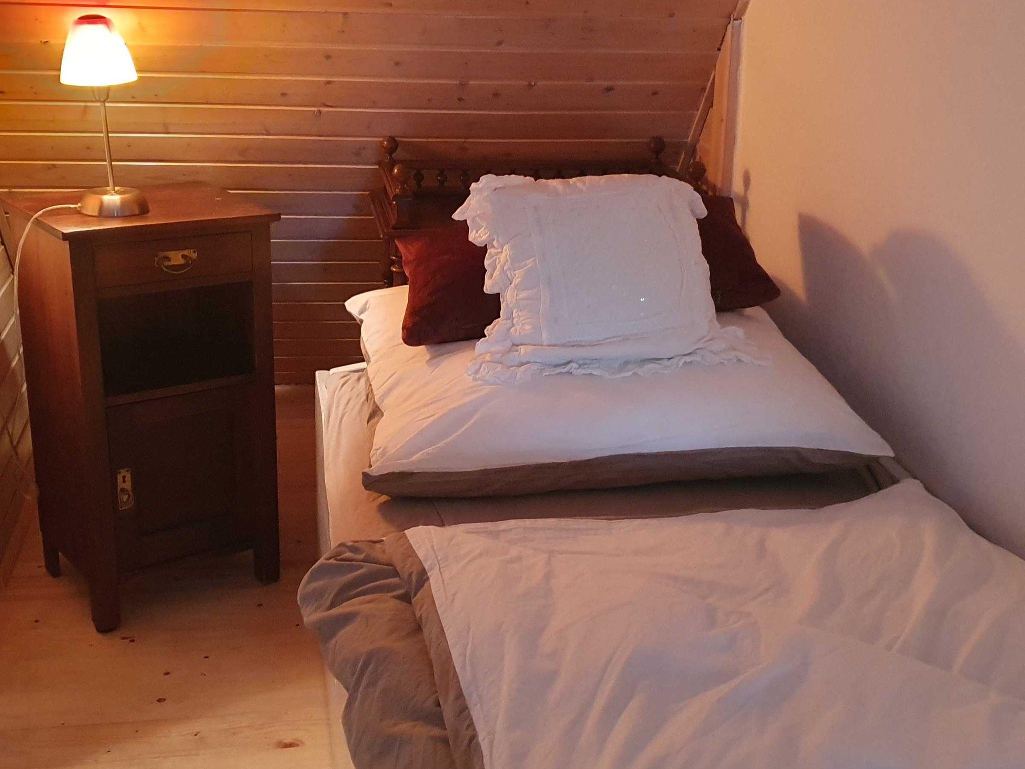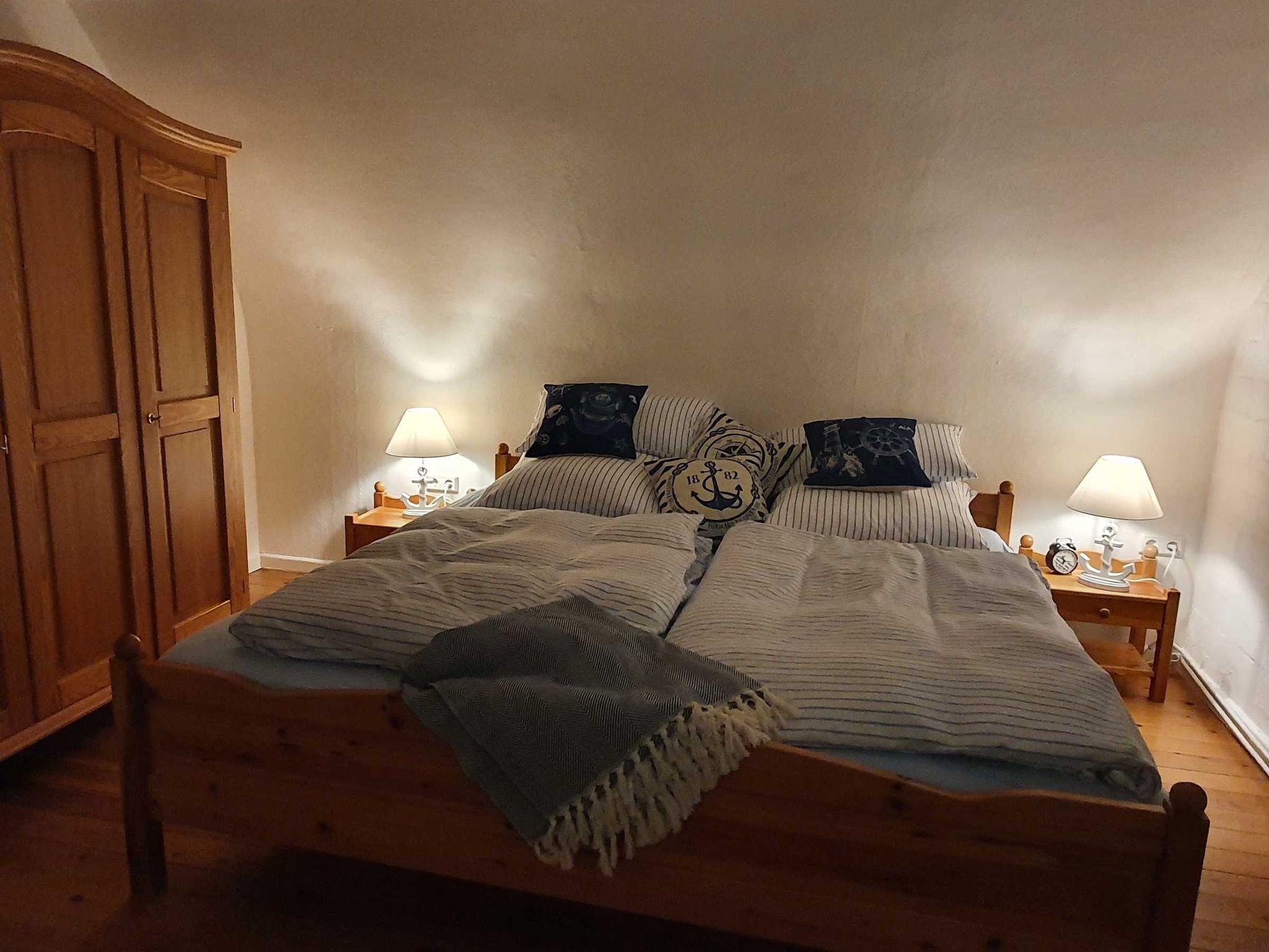 Zur Verfügung stehen im 1. OG: 1 geräumiges Doppelzimmer mit großem Doppelbett (2 x 200 x 100, in dem sich unendlich ruhig schläft), großem Schrank, elegantem Sekretär und Rosenbänkchen sowie 1 kleineres SZ (für 2 weitere Personen) mit 1 Bett (200 x 80) und einer Schlaf-Recamiere (190 x 90), hintereinander.