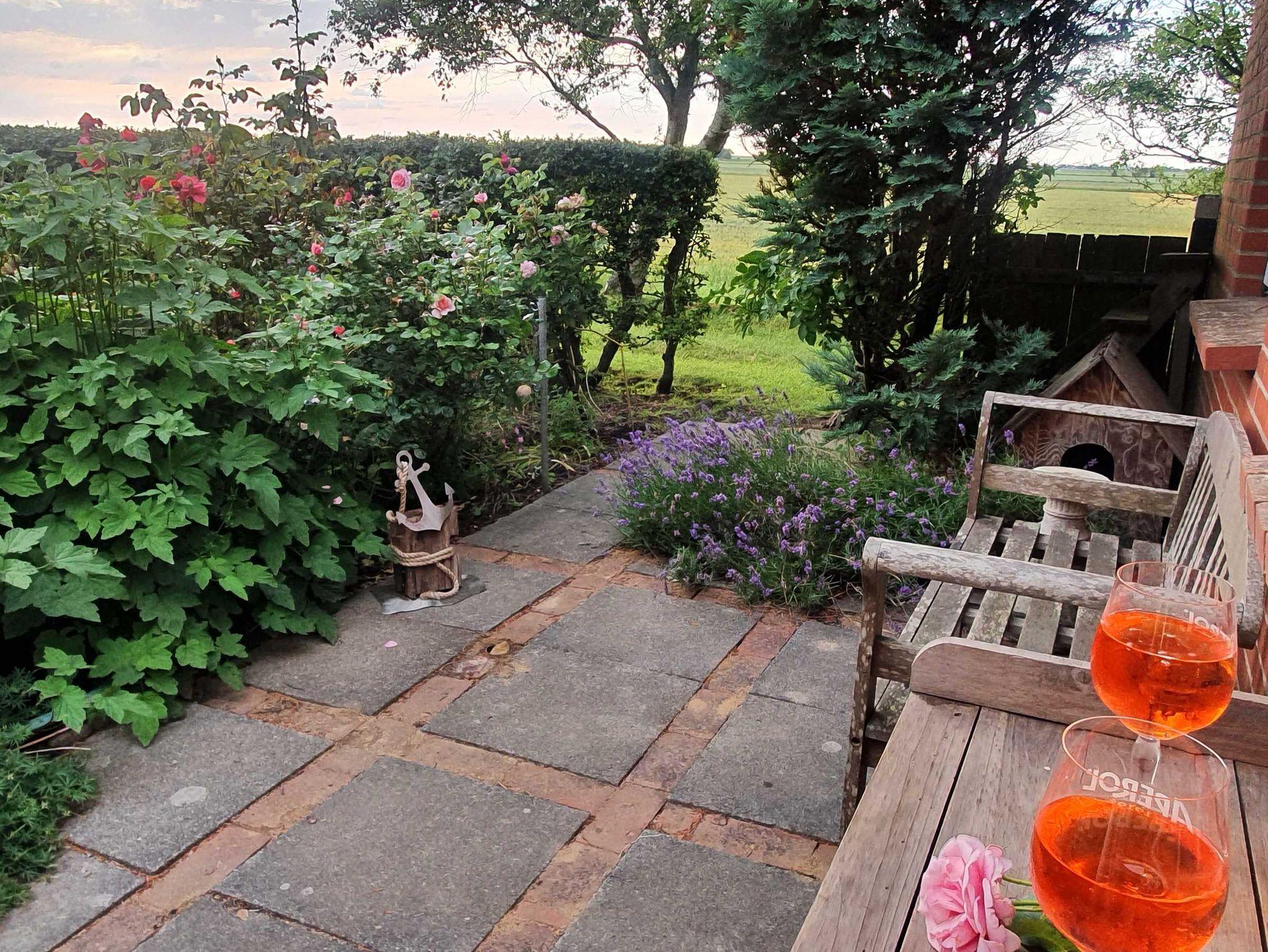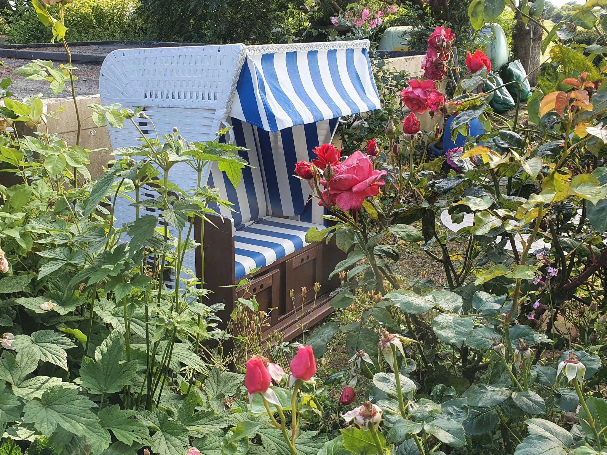 Der Strandkorb bzw. der Ankerplatz hinter dem Haus sorgen für einen traumhaften Blick auf den Sonnenuntergang, und der üppigst blühende Garten lädt dazu ein, ihn mit allen Sinnen zu genießen, besonders windgeschützte Ecken laden dazu ein.