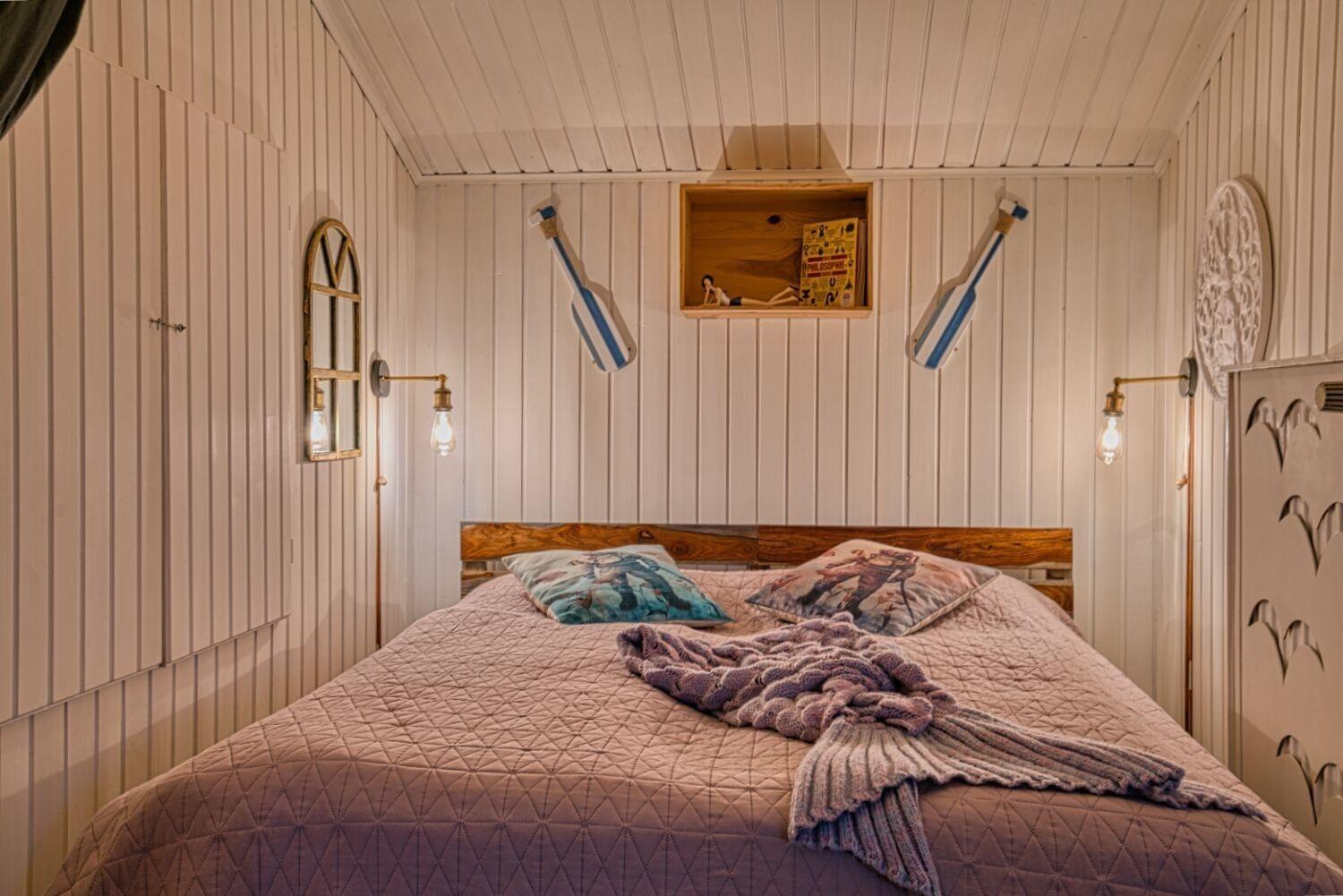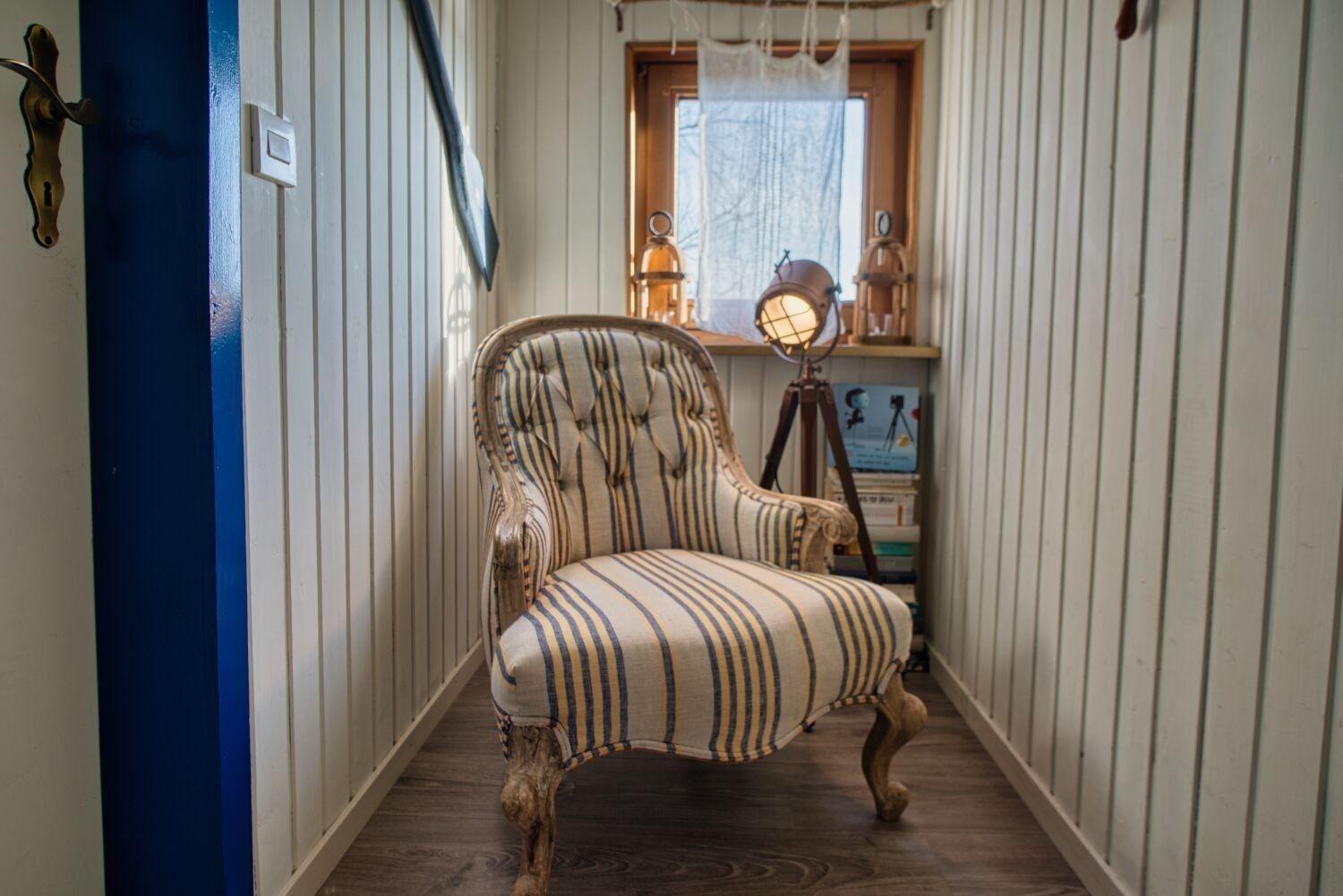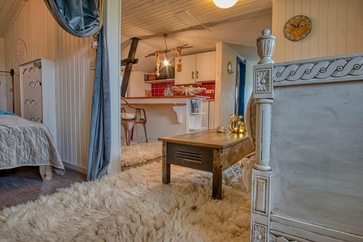 Diese kleine 35 qm große Wohnung befindet sich im ersten Stock, sie ist bestens geeignet für zwei Personen. Die Schlafnische lässt sich durch einen abdunkelnden Vorhang schließen. Das Bett ist 1,60 m breit und hat zwei super Weltbett-Matratzen. Vom Bett aus könnte man