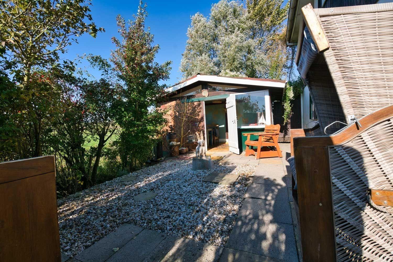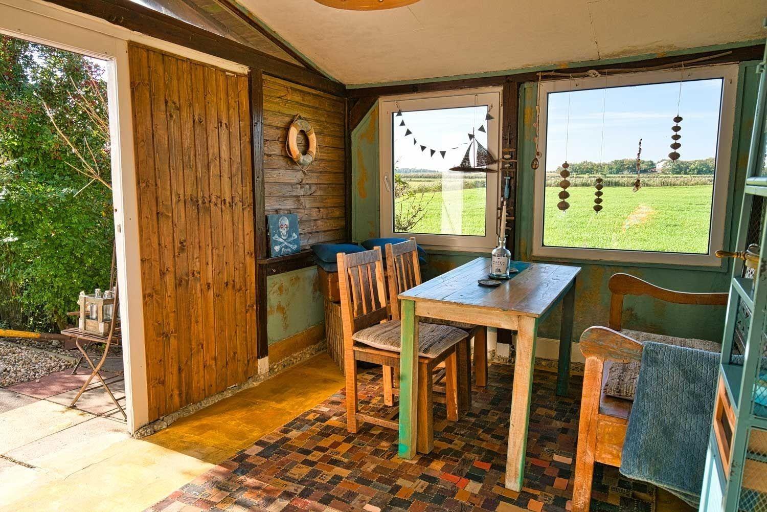 Der Außenbereich gehört sowohl zur oberen als auch zur unteren Wohnung. Auf der Terrasse stehen zwei tolle Strandkörbe und die Nordstrandbar mit einem Tisch und Bestuhlung. Diese ist jedoch NICHT beheizt. In der Bar gibt es einen Keramikgrill und eine Feuerstelle, die draußen benutzt werden darf. Von der Nordstrandbar aus sieht man in die nordfriesische Weite. Vor dem Zaun gibt es einen weiteren Außenbereich mit einem Tisch und Bänken - und Blick in die nordfriesische Weite. Liegestühle gehören ebenfalls zur Vermietung dazu.