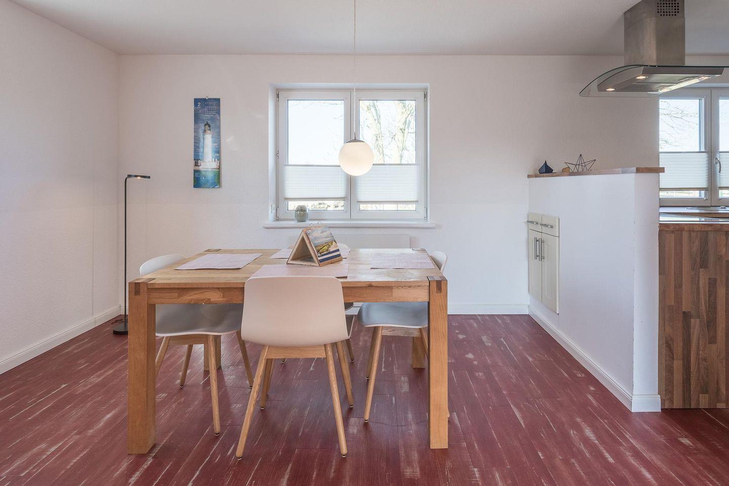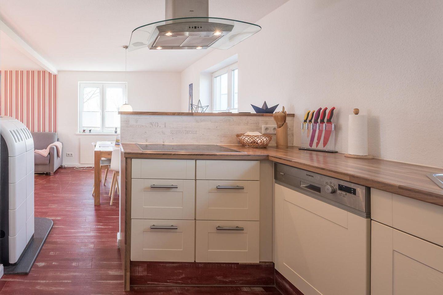Das Ferienhaus "Altes Schäferhaus" bietet Ihnen zwei Schlafzimmer (1 Doppelbett, 180 × 200 und 2 Einzelbetten). Die offene Küche ist sehr gut ausgestattet: Ceranfeld, Backofen, Geschirrspülmaschine und Kaffeemaschine (Filtergröße 4). Der Wohnbereich verfügt über eine Sitzecke, einen Kaminofen und einen Flachbild-TV. Das moderne Badezimmer ist mit einer ebenerdigen Dusche und Waschbecken eingerichtet, eine Waschmaschine steht für Sie bereit. Das WC befindet sich in einem separaten Bad.