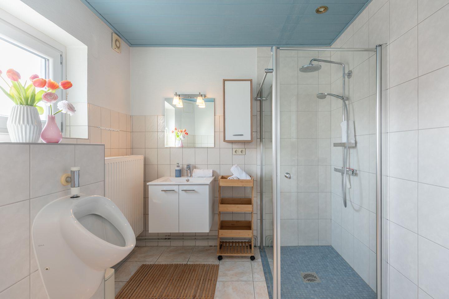 Das moderne Badezimmer ist mit einer Dusche, WC, Pissoir und Waschbecken eingerichtet.