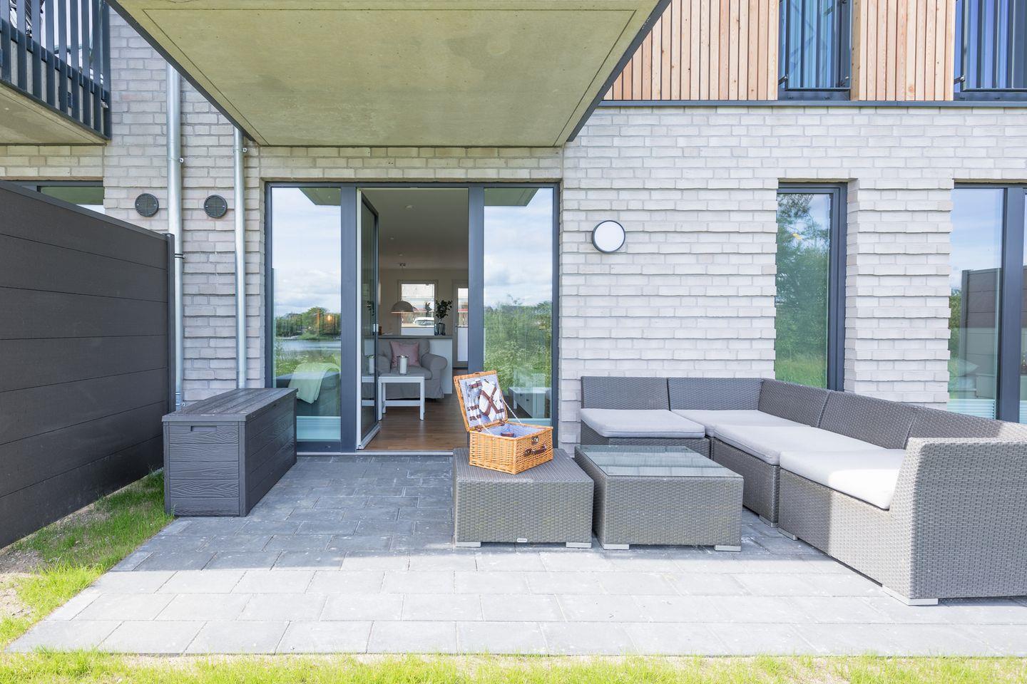 Über das Wohnzimmer haben Sie Zugang zu der sonnigen und geschützten Terrasse mit Gartenmöbeln für gemütliche, sonnige Stunden.