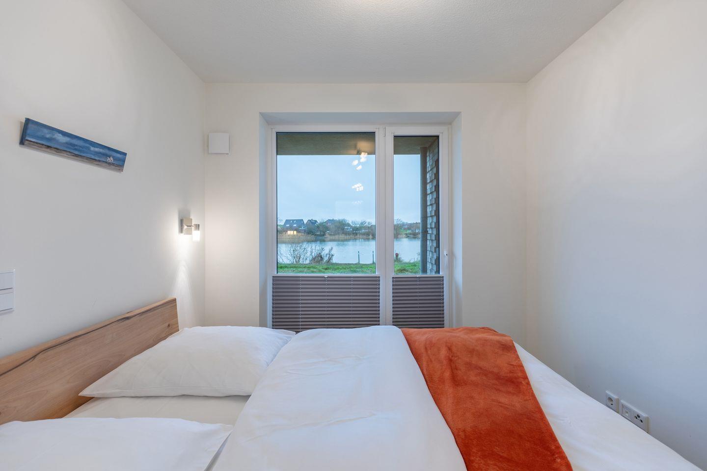 Ruhige Nordsee-Idylle in Norderhafen: Ferienwohnung Halligstork mit Seeblick am Forellensee. Wohnzimmer, gut ausgestattete Küche, Schlafzimmer mit Doppelbett, Schlafsofa, modernes Duschbad, Terrasse. Hunde willkommen, WLAN, Kfz-Stellplatz, Fahrradschuppen, Fußbodenheizung. Erstausstattung Bettwäsche und Handtücher inklusive.