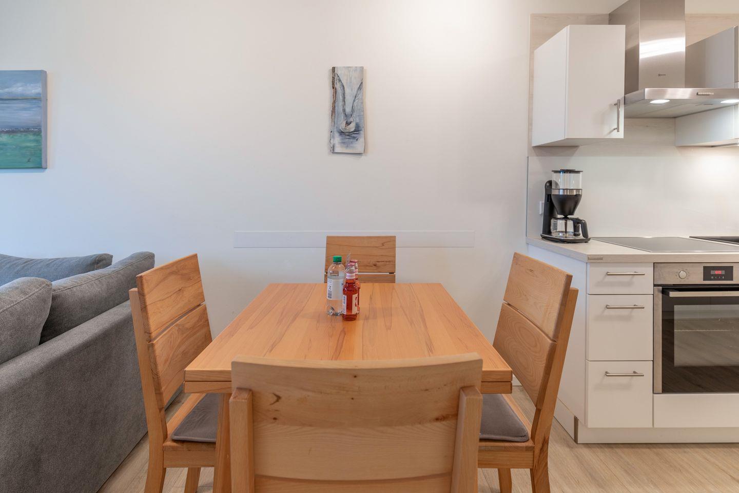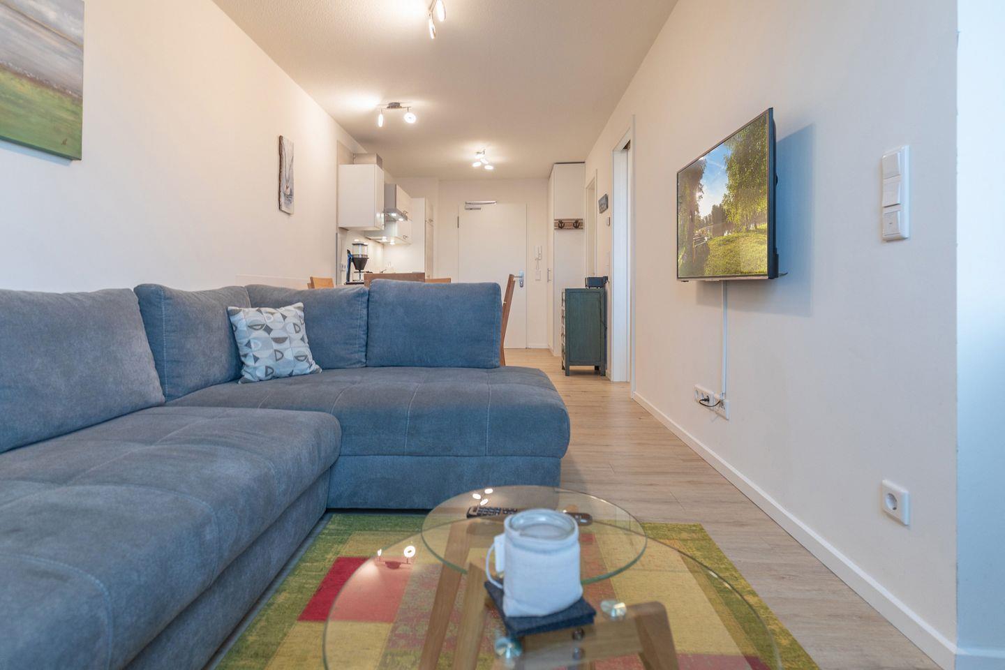 Die 39 qm große Ferienwohnung lädt Sie ein zu einem erholsamen Nordseeurlaub: helles, gemütliches Wohnzimmer mit Schlafsofa (Boxspringbett, für 2 Kinder geeignet), SAT-TV und Internetradio, einer gut ausgestatteten Einbauküche mit Induktionsfeld, Backofen, Geschirrspülmaschine, Kühlschrank mit Gefrierfach und einer Filterkaffee-Maschine. Das Schlafzimmer ist mit einem Doppelbett (180 x 200) ausgestattet, die Fenster lassen sich verdunkeln. In dem modernen Duschbad steht Ihnen ein Waschtrockner zur Verfügung.