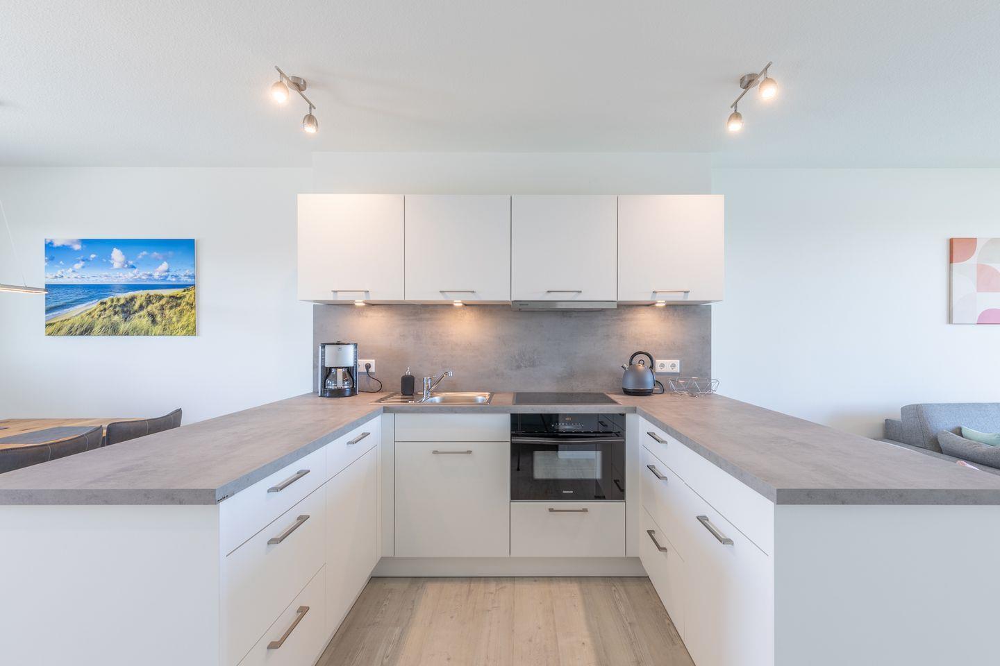 Die 73 qm große Ferienwohnung lädt zu einem erholsamen Nordseeurlaub ein: helles, gemütliches Wohnzimmer mit Schlafsofa (160 x 200) und Sessel, SAT-TV, eine gut ausgestattete Einbauküche mit Cerankochfeld, Backofen mit integrierter Mikrowelle, Geschirrspüler und Kühlschrank. Das erste Schlafzimmer hat ein bequemes Doppelbett (180 × 200) in Komforthöhe sowie Verdunkelungsmöglichkeiten, wie auch Insektenschutz für die Fenster. Das zweite Schlafzimmer ist ebenfalls mit einem Doppelbett (180 × 200) ausgestattet und verfügt über ein eigenes Bad mit Waschbecken, WC und Dusche. Beide Schlafzimmer sind mit einem Flachbildfernseher ausgestattet. Das andere Badezimmer verwöhnt Sie zusätzlich mit einem modernen Dampfbad.