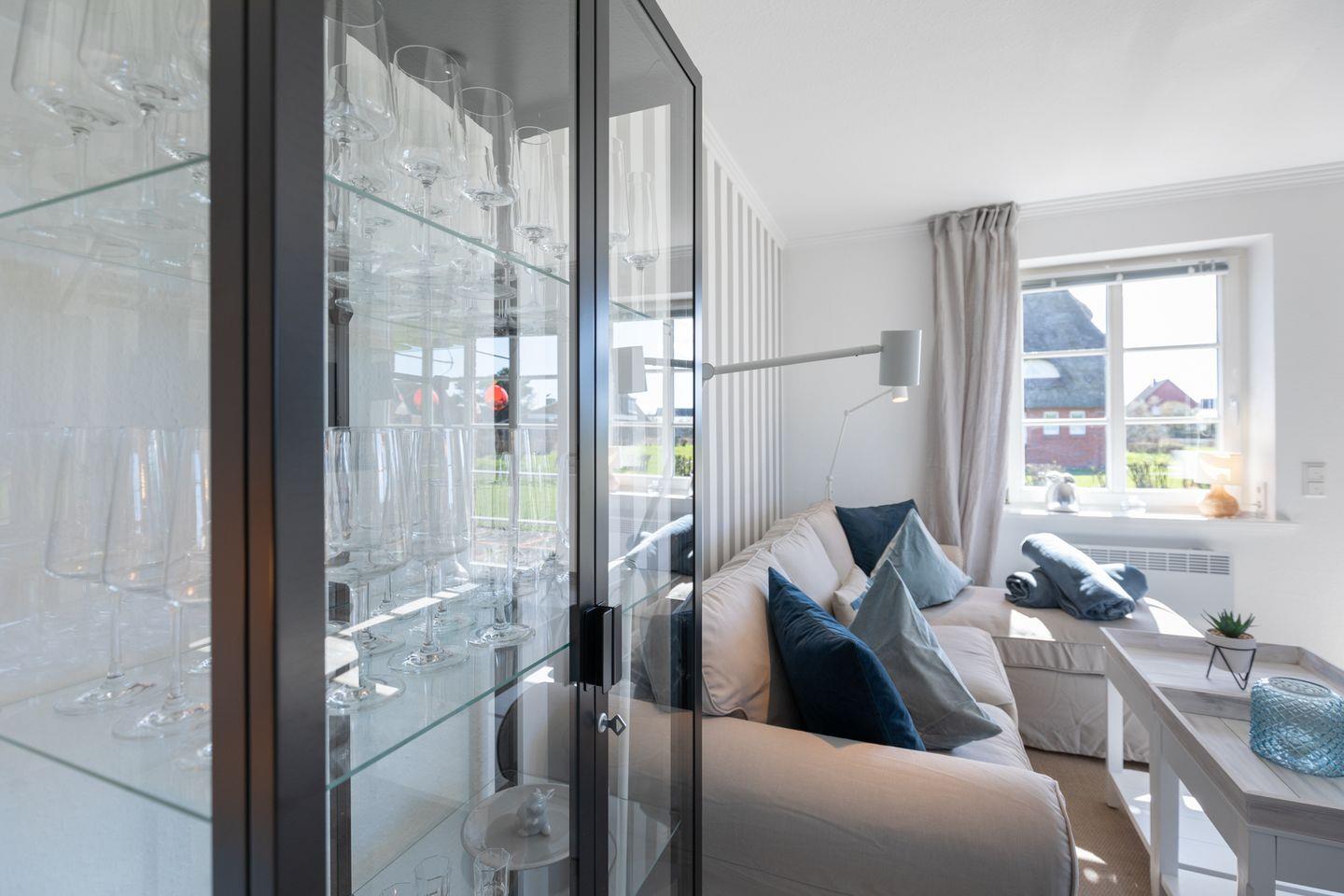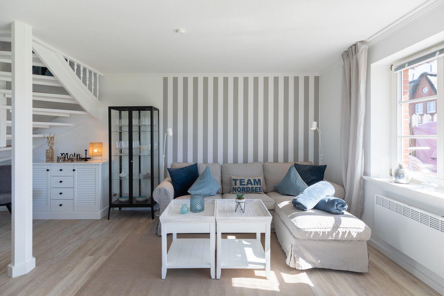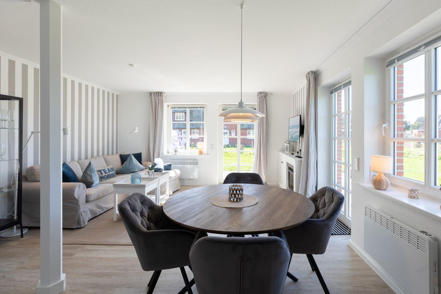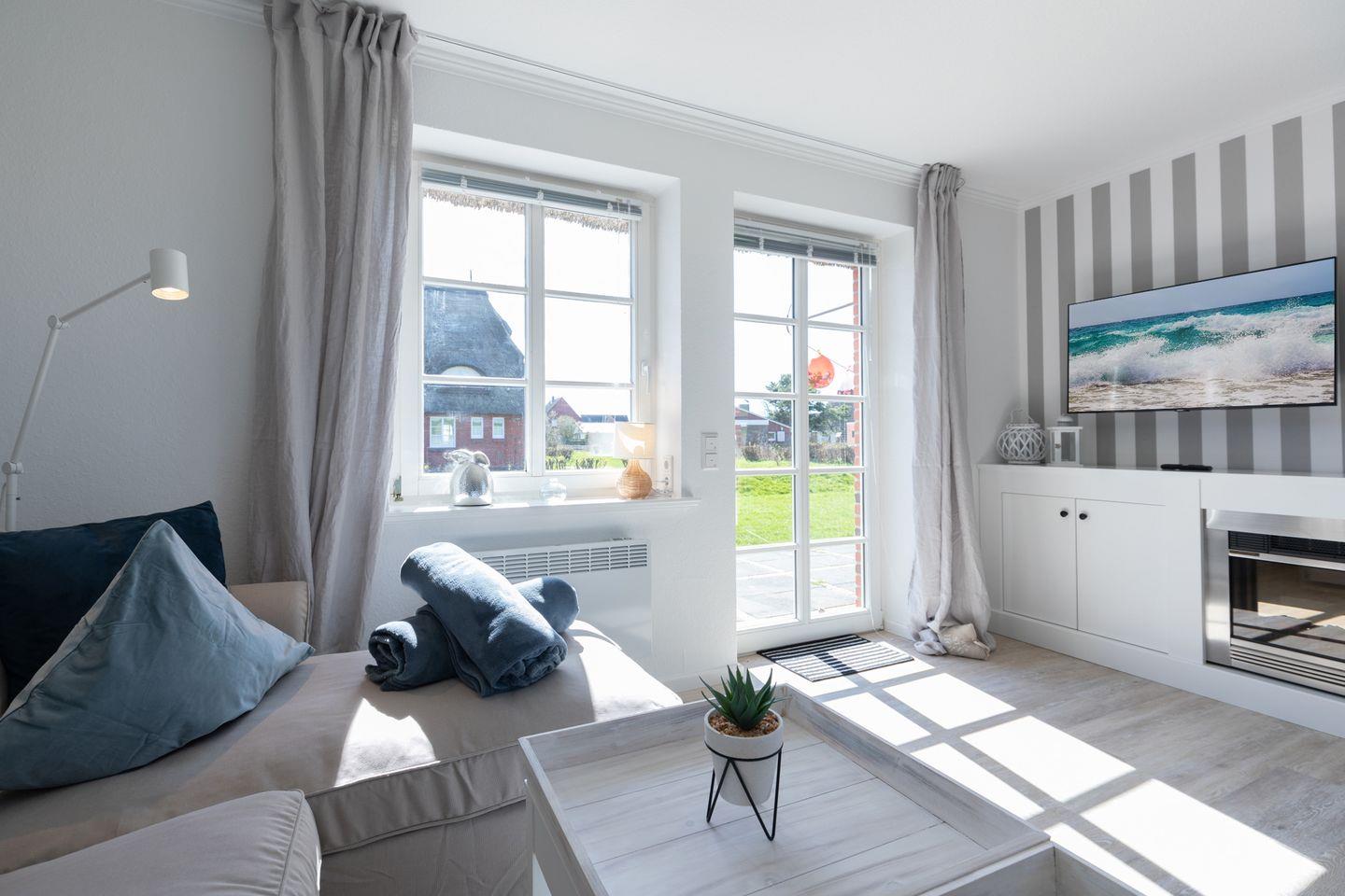 Über das Wohnzimmer haben Sie Zugang zu der sonnigen und geschützten Terrasse mit Gartenmöbeln und einem Strandkorb für gemütliche, sonnige Abendstunden.