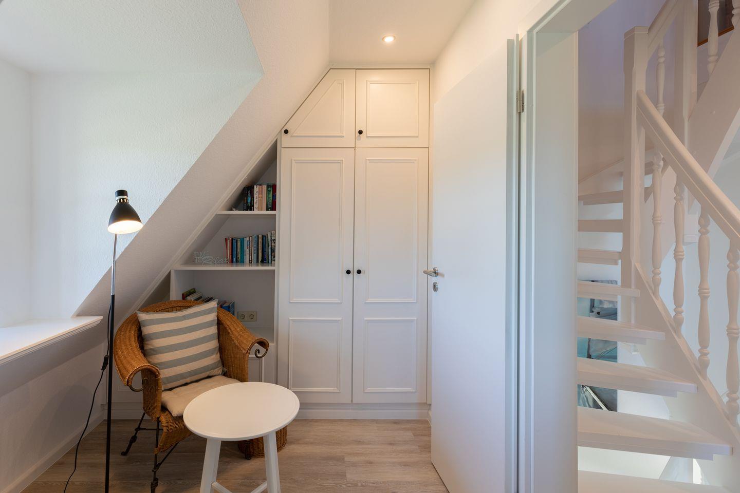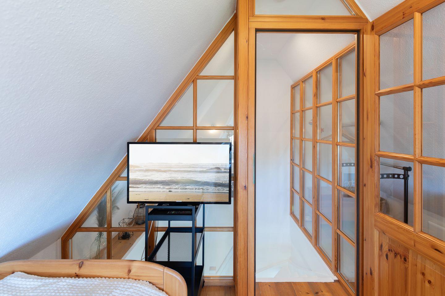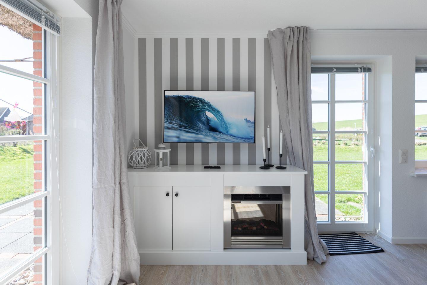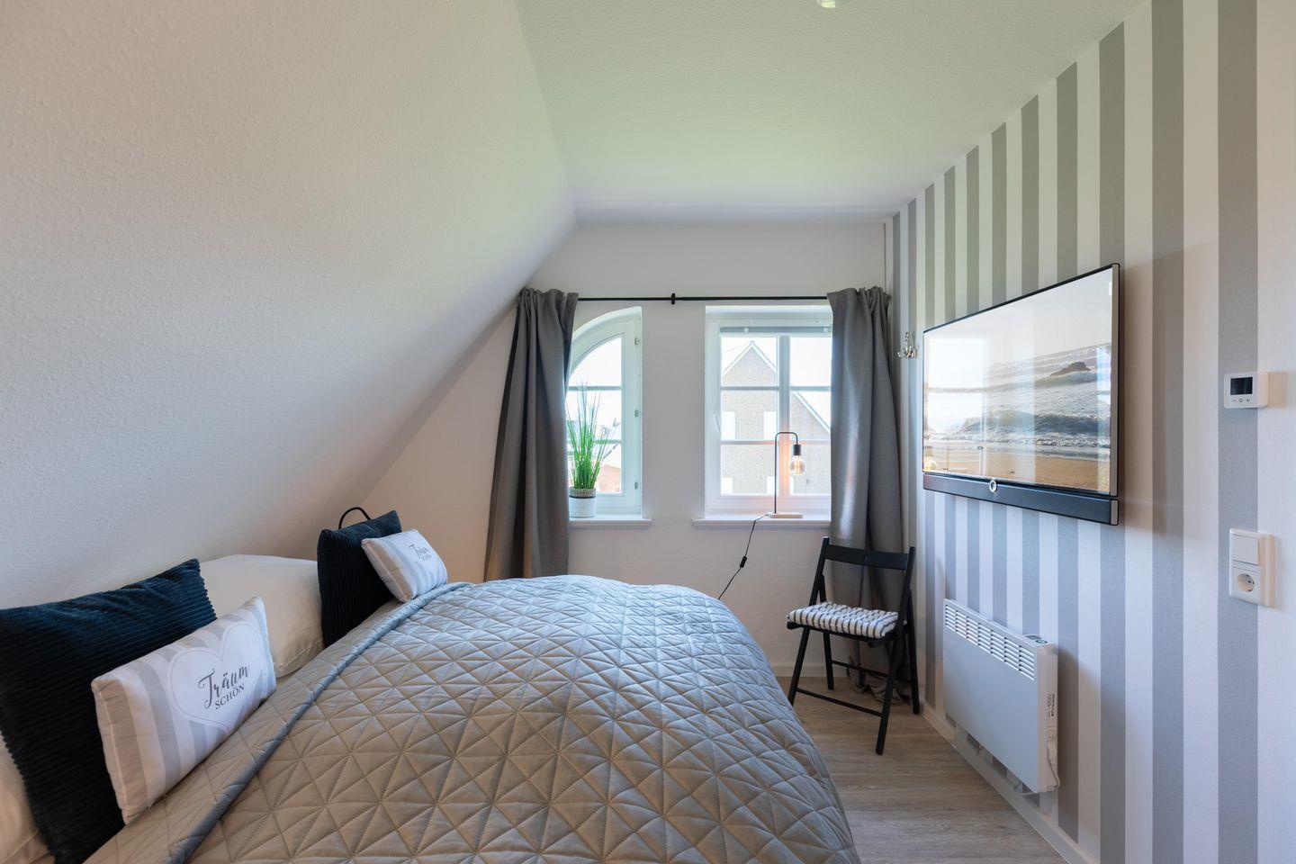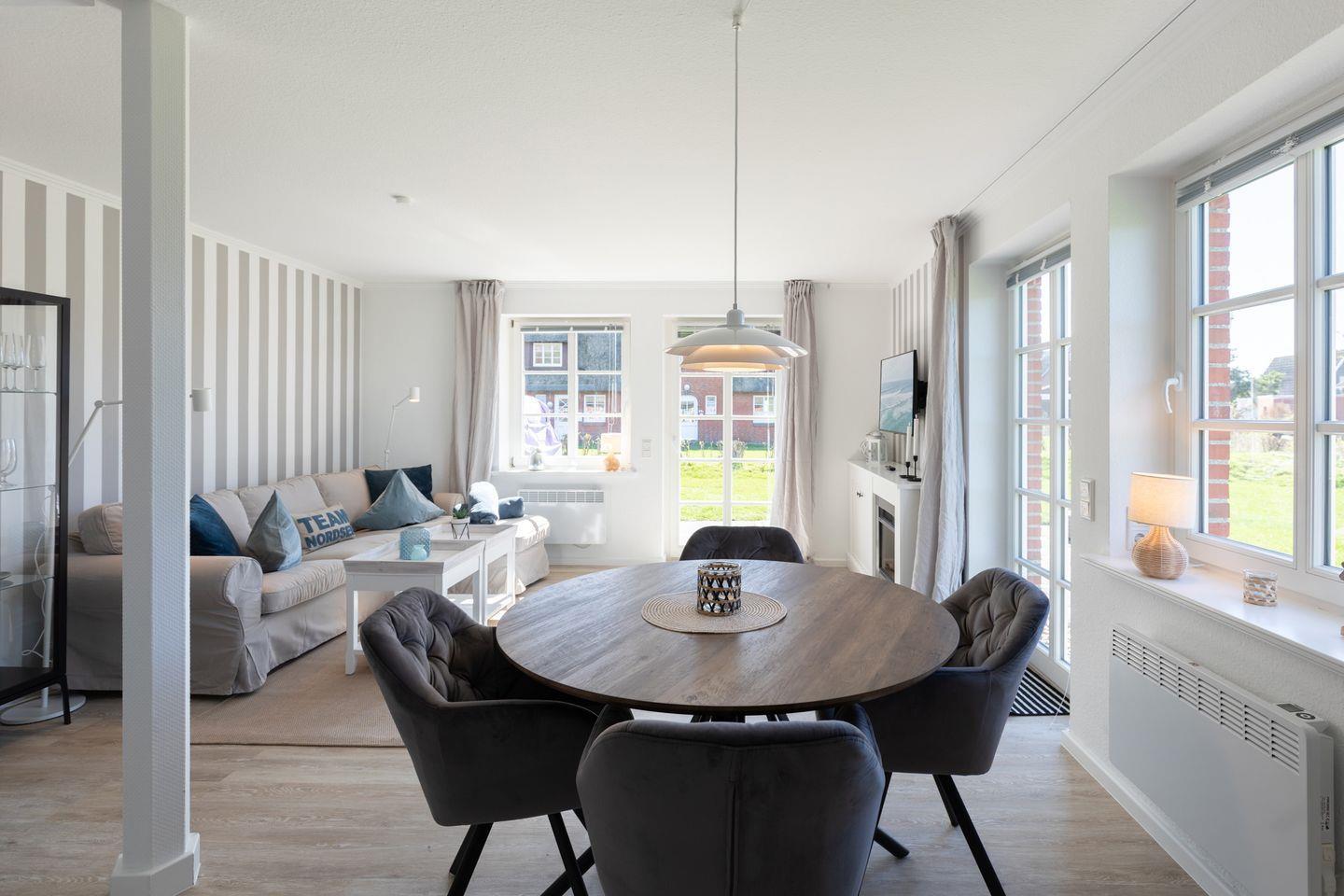 Die Ferienhaushälfte lädt Sie ein zu einem erholsamen Nordseeurlaub: gemütliches Wohnzimmer mit Sofa, SAT-TV, Musikanlage, einer gut ausgestatteten Einbauküche mit Ceranfeld, Backofen, Geschirrspülmaschine, Waschmaschine, einer Kaffeemaschine (Filtergröße 4) und einer Nespresso-Maschine.Im 1. Stock befinden sich ein großes Schlafzimmer mit einem Doppelbett (160 x 200) und einem Fernseher, ein Schlafzimmer mit einem Einzelbett, sowie das Wannenbad mit Duschvorrichtung und WC. Ein weiteres Schlafzimmer mit zwei Einzelbetten und TV befindet sich im 2. Stock.