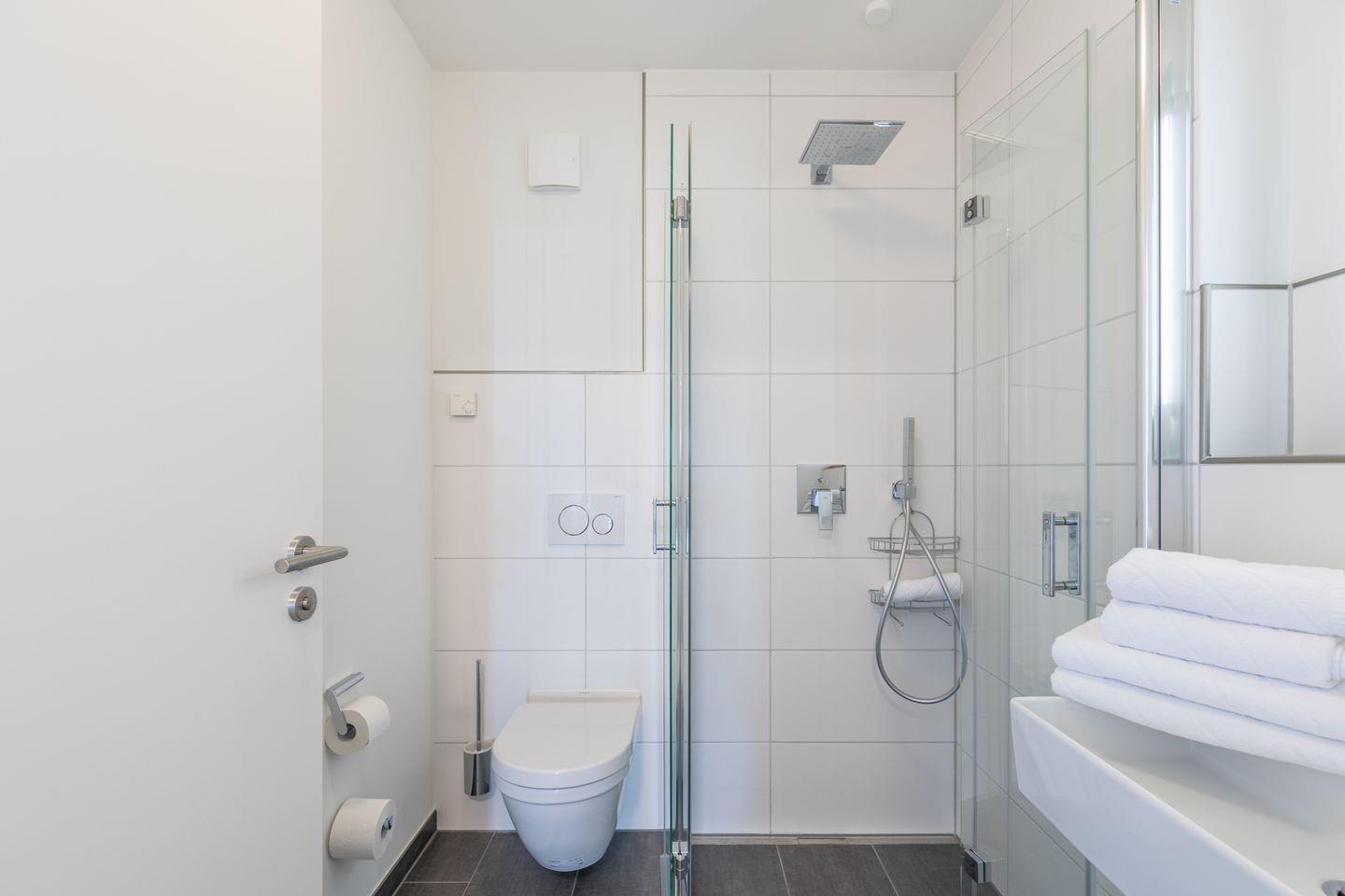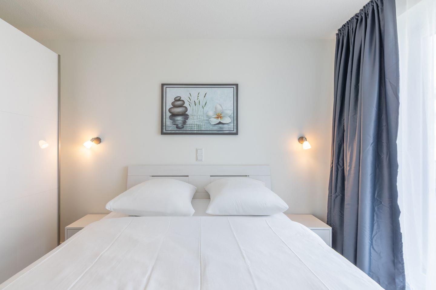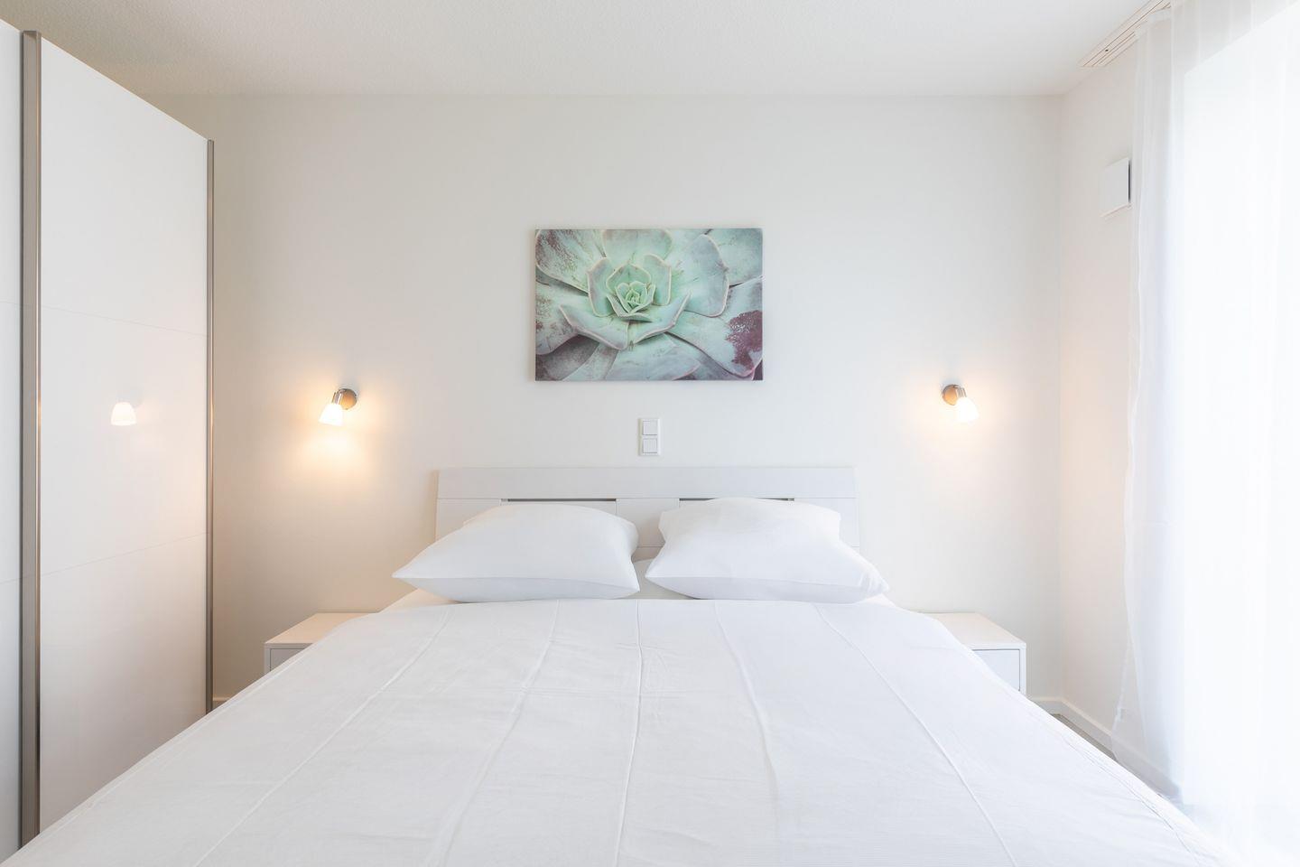 Die beiden Schlafzimmer sind mit je einem Doppelbett (160 x 200) ausgestattet und haben jeweils Zugang zu einem eigenen Duschbad.