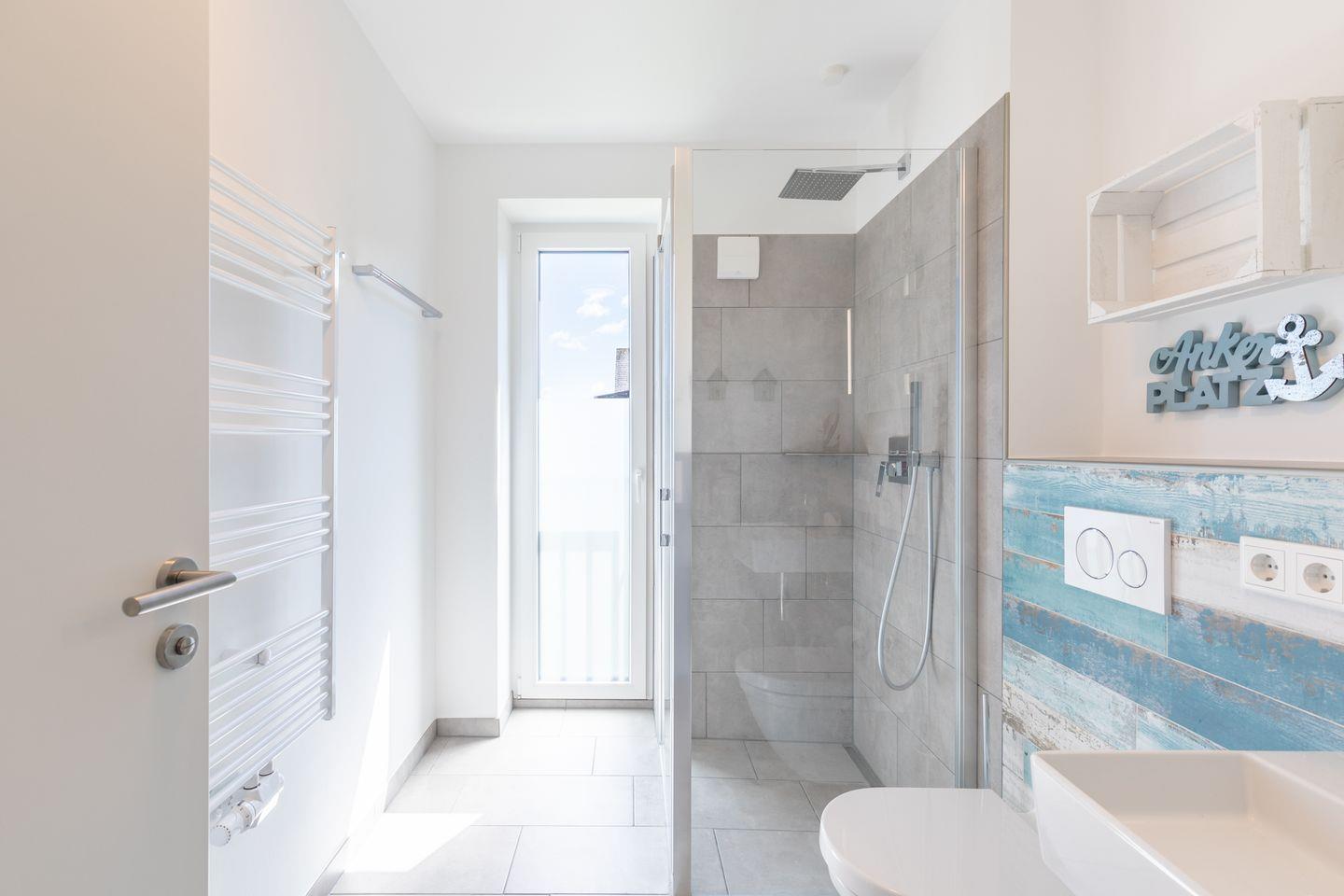 Moderne Ferienwohnung Ankerplatz No. 7 auf Nordstrand mit Seeblick, Balkon und Fußbodenheizung für erholsamen Nordseeurlaub.
