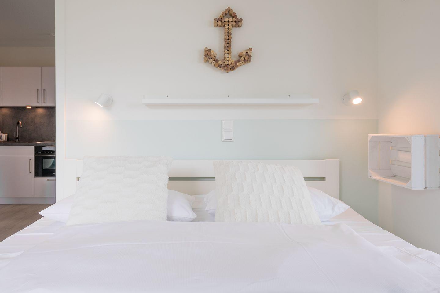 Genießen Sie Nordsee-Idylle in der Ferienwohnung "Ankerplatz No. 7" mit Seeblick. 38 qm, Wohnzimmer mit Schlafsofa, gut ausgestattete Küche, Schlafzimmer mit Doppelbett, tageshelles Duschbad. Sonniger Balkon, WLAN, Parkplatz, Fahrradschuppen, Fußbodenheizung. Erholung pur!