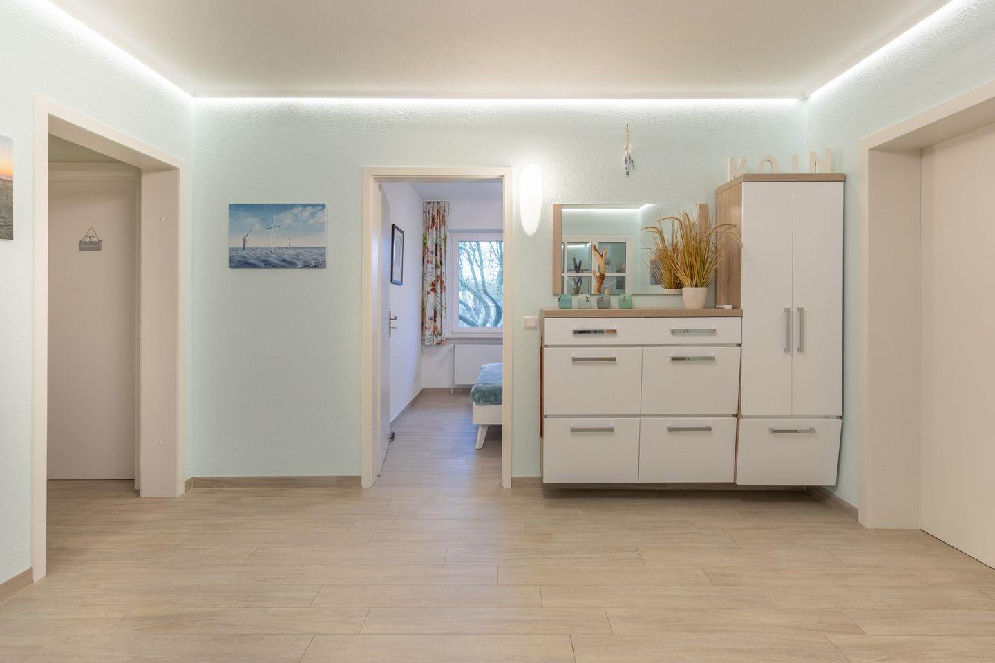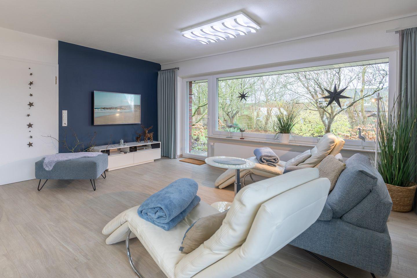 Das Ferienhaus empfängt Sie mit einem großen Flur mit Garderobe. Von hier aus gelangen Sie in den Wohn-Essbereich mit Zugang zur geschützten Terrasse. Das Wohnzimmer ist mit einem kleinen Sofa (nicht ausklappbar) und zwei bequemen Liegestühlen ausgestattet, von denen Sie entspannt das Programm auf dem großen internetfähigen Flachbildschirm-TV verfolgen können. Auch ein Blu-ray-Player mit einer Filmauswahl ist vorhanden. Bücherfreunden steht eine große Bibliothek zur Verfügung.