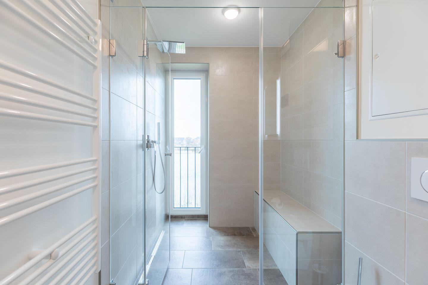 Beide Bäder bieten einladende und ebenerdige Regenduschen. Das Highlight ist die integrierte Dampfsauna mit bodentiefem Fenster.