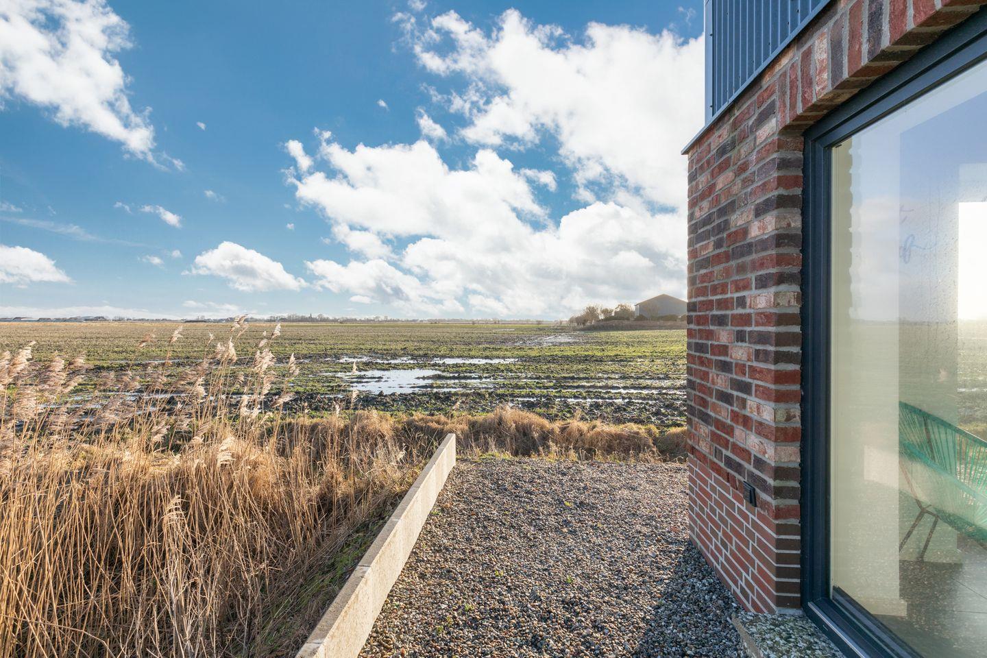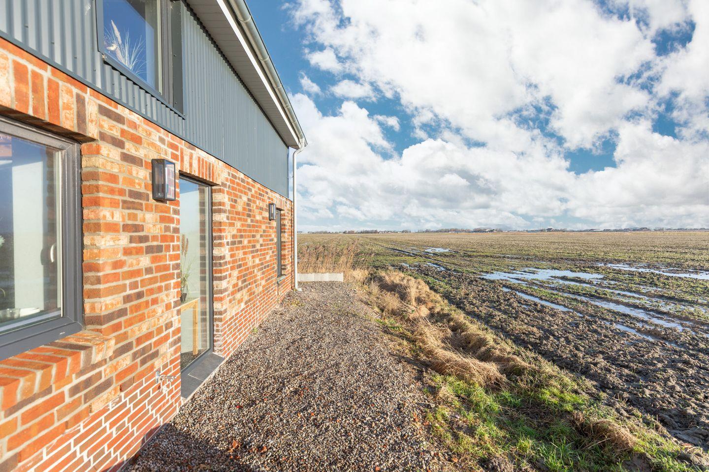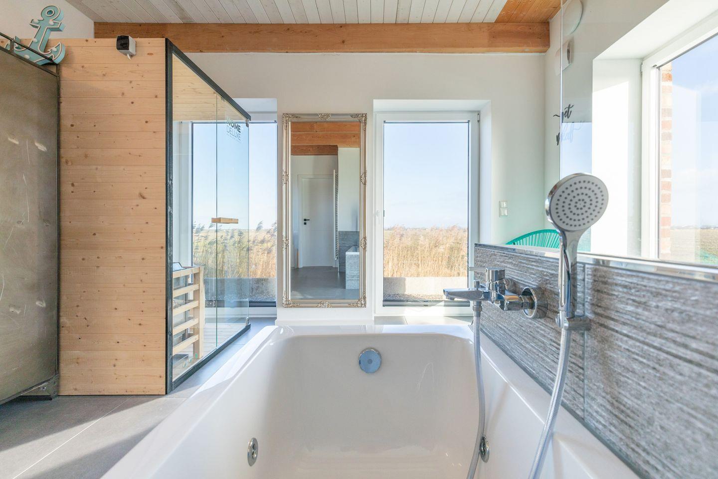 Modernes Tinyhouse auf Nordstrand mit Sauna und Blick auf die Natur, ideal für Erholung und Aktivitäten in ruhiger Insellage.