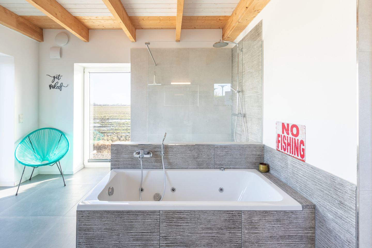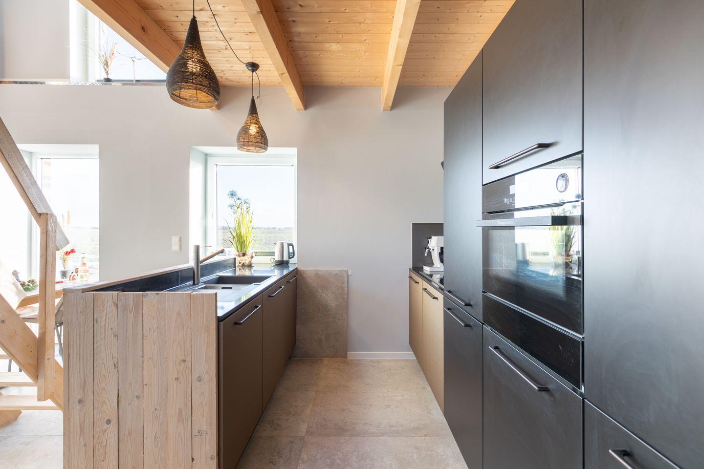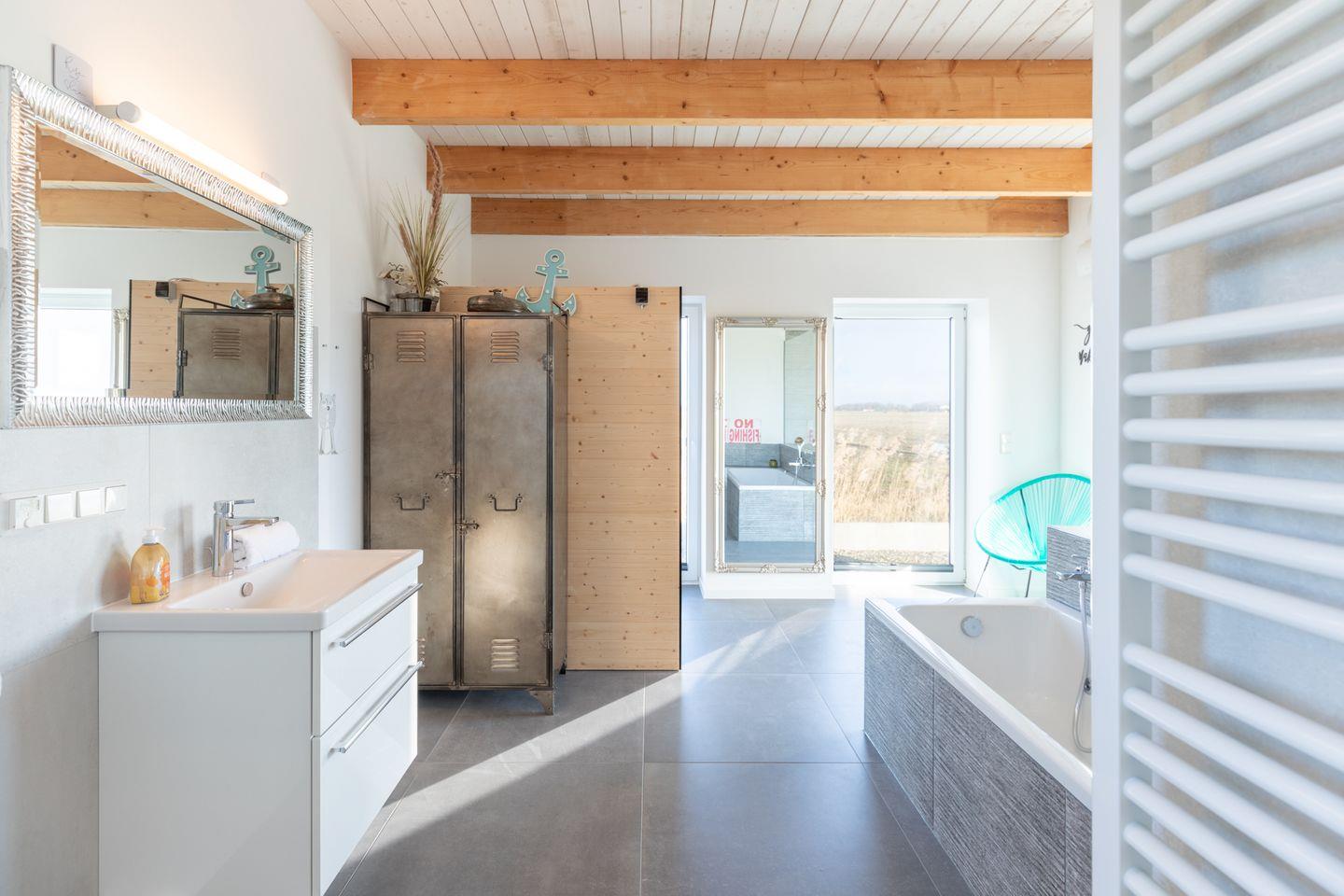 Modernes Tinyhouse auf Nordstrand mit Sauna und Blick auf die Natur, ideal für Erholung und Aktivitäten in ruhiger Insellage.