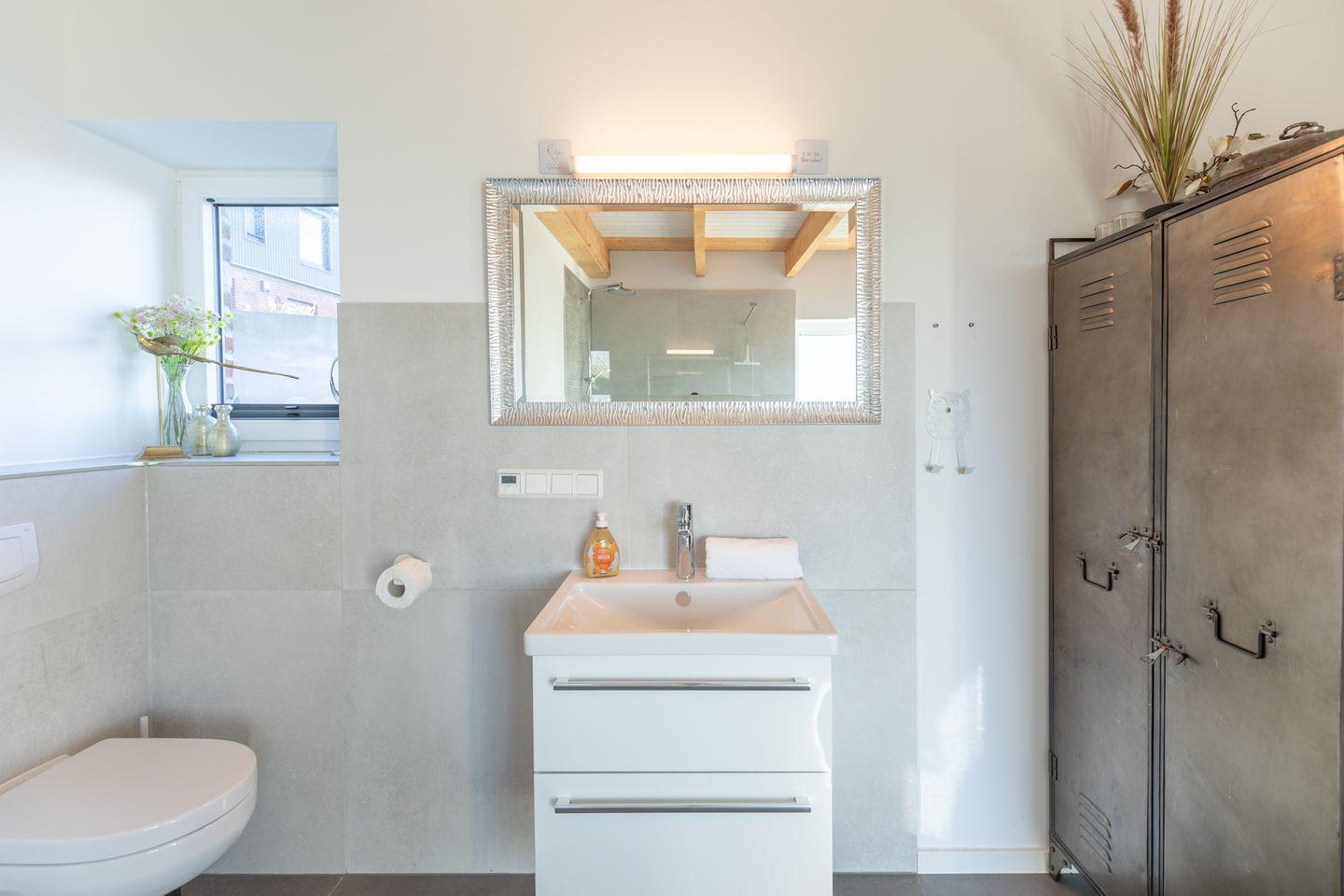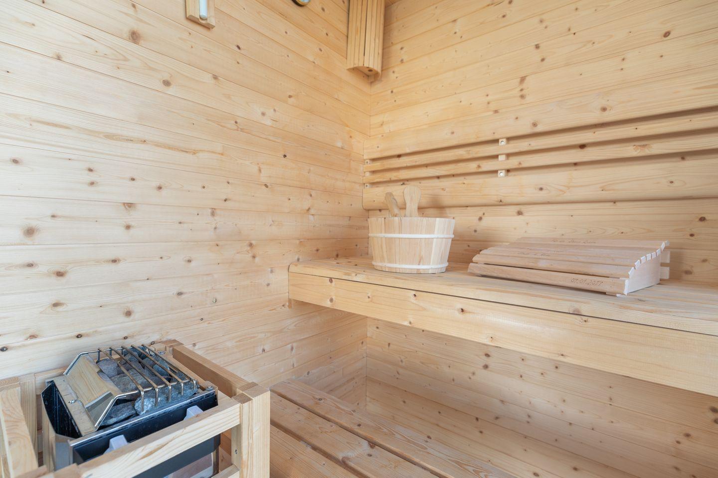 Im Erdgeschoss befindet sich ein lichtdurchflutetes Bad, das keine Wünsche offen lässt. Eine moderne Sauna lädt hier ebenso zum Entspannen ein wie eine geräumige Dusche und eine komfortable Whirlwanne.
