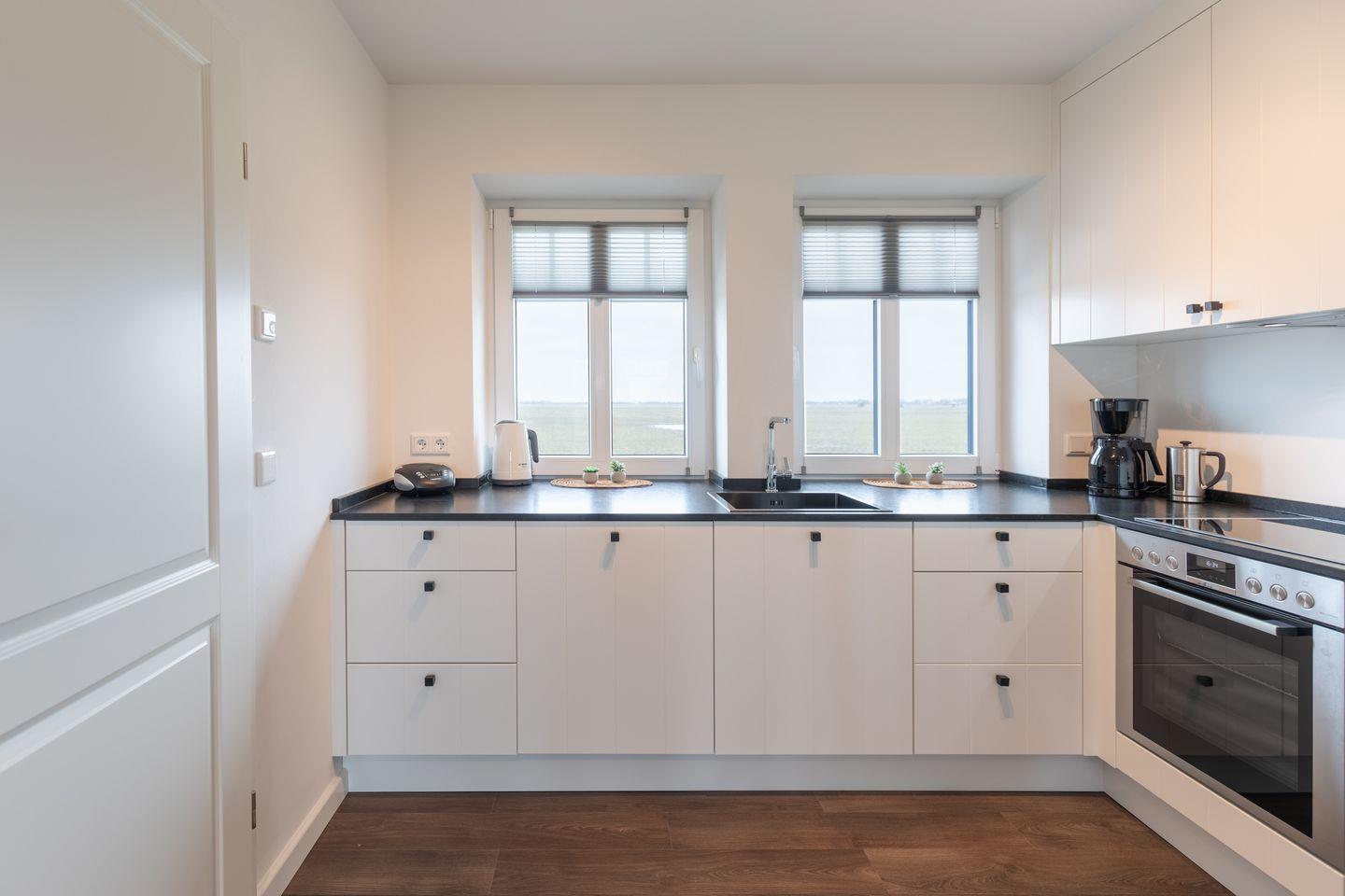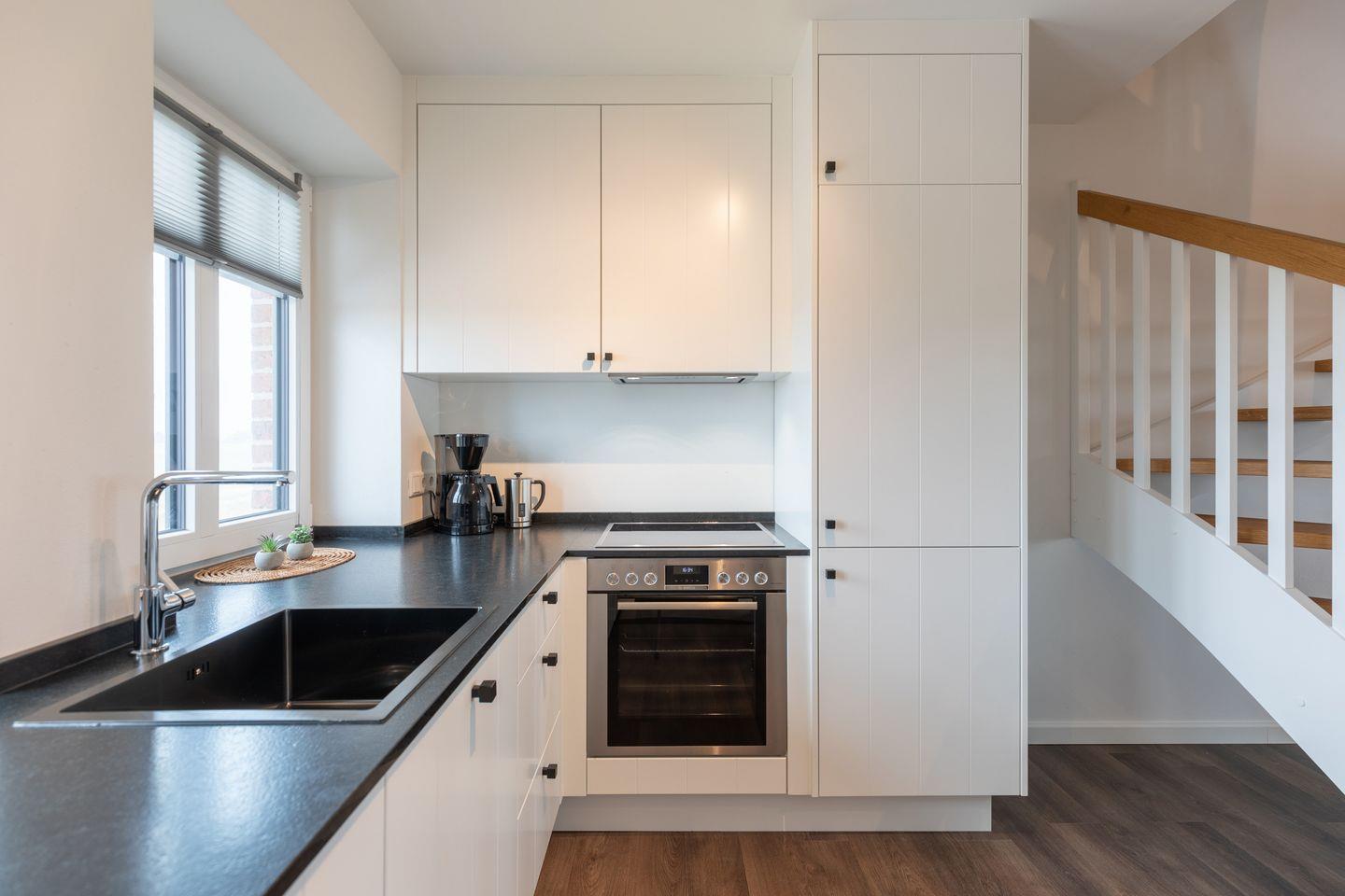 Die moderne Küche ist bestens für das gemeinsame Kochen ausgestattet: Ein 4-Plattenherd mit Cerankochfeld, Kühlschrank sowie Gefrierfach, Backofen und eine Kaffeemaschine sind hier zu finden. Die Küchenmaschine ist ein weiteres Highlight der Küchenausstattung. Nach getaner Arbeit erledigt die Spülmaschine den Abwasch für Sie.