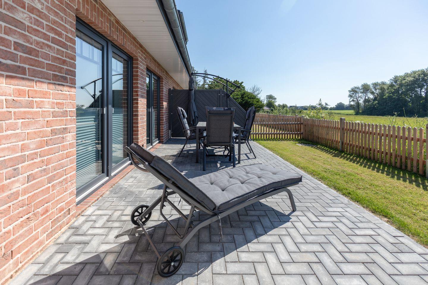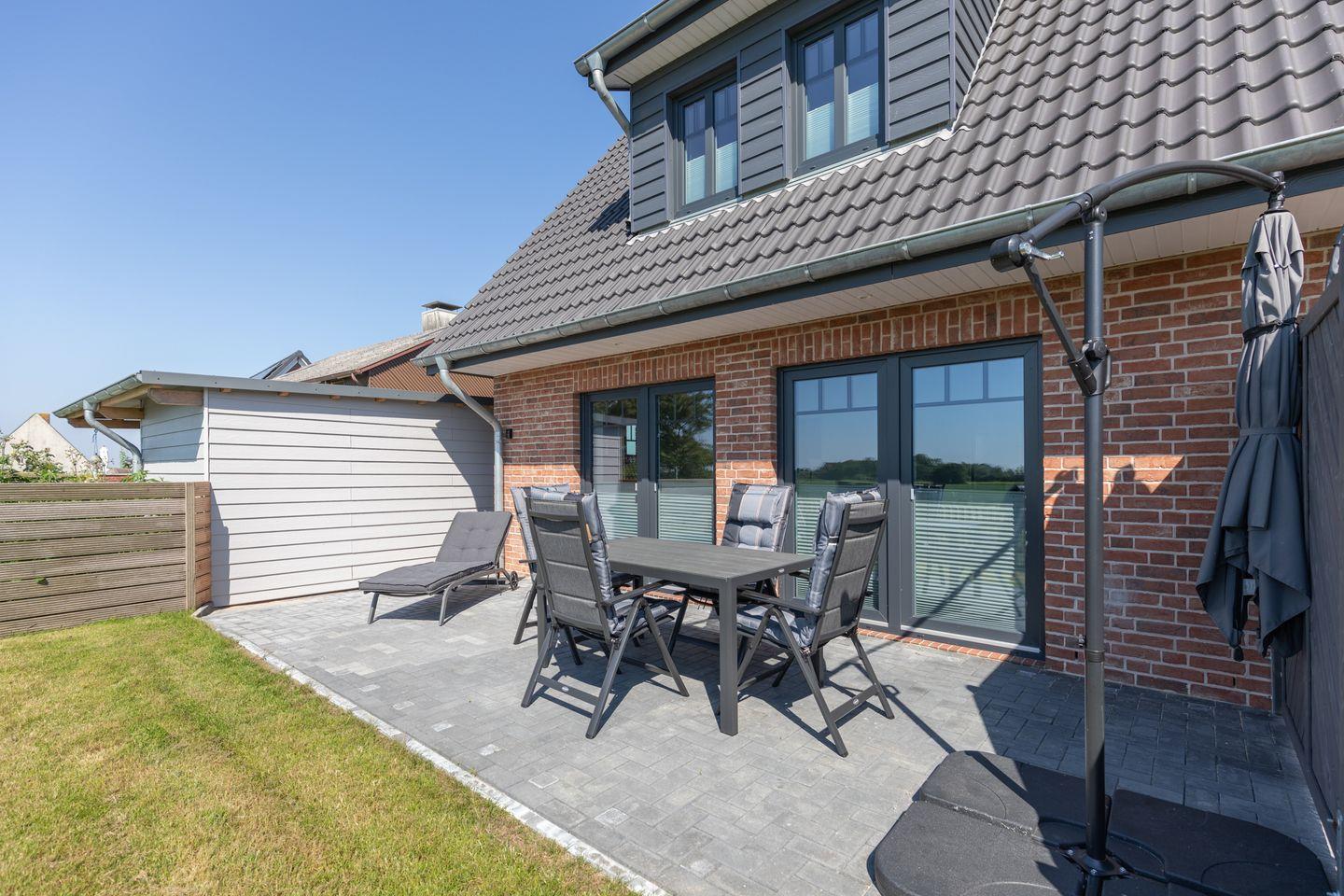 Moderne Doppelhaushälfte "Utblick" auf Nordstrand mit Sauna, Terrasse und Blick auf die Nordsee, ideal für Naturfreunde und Familien.