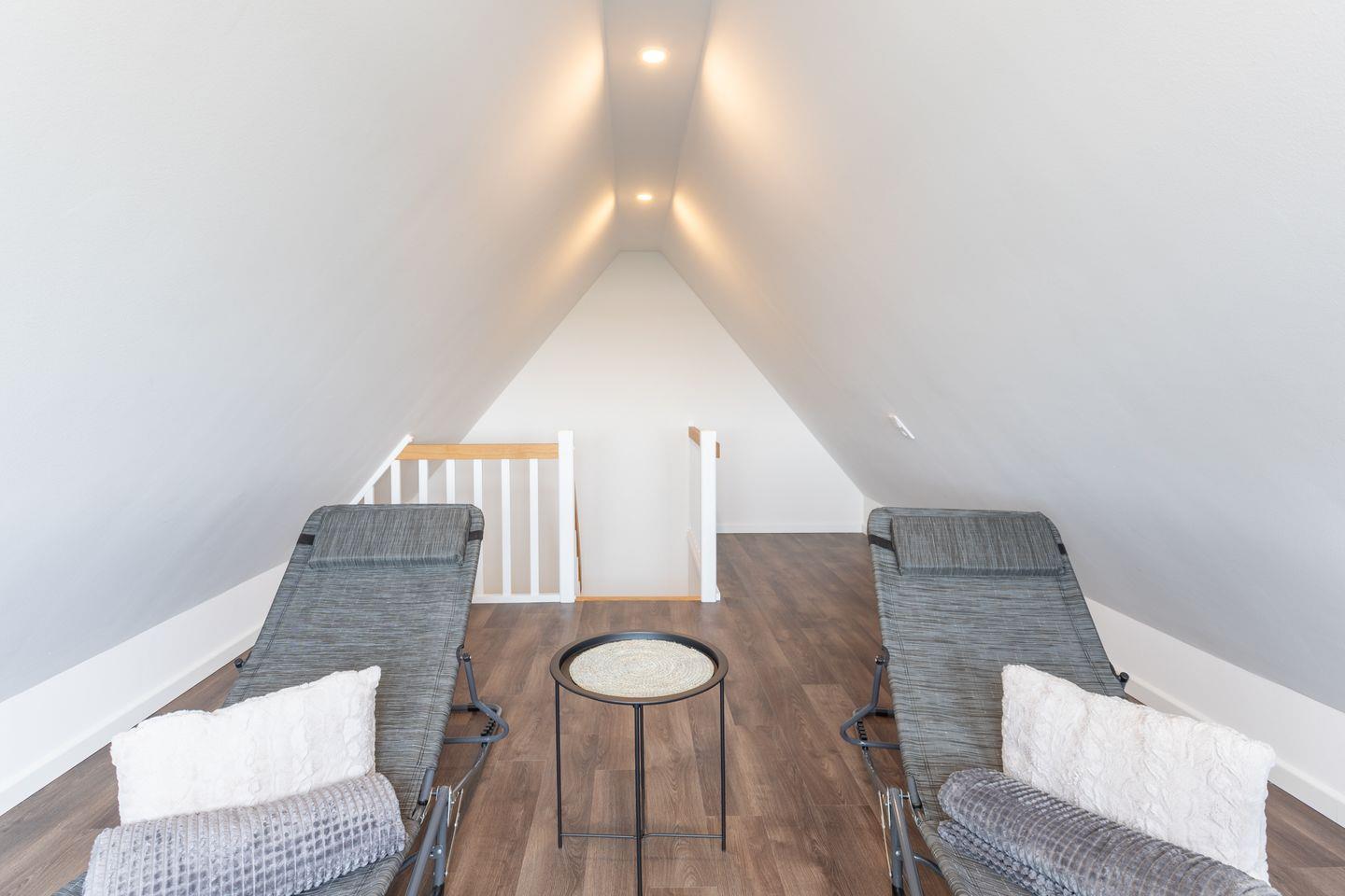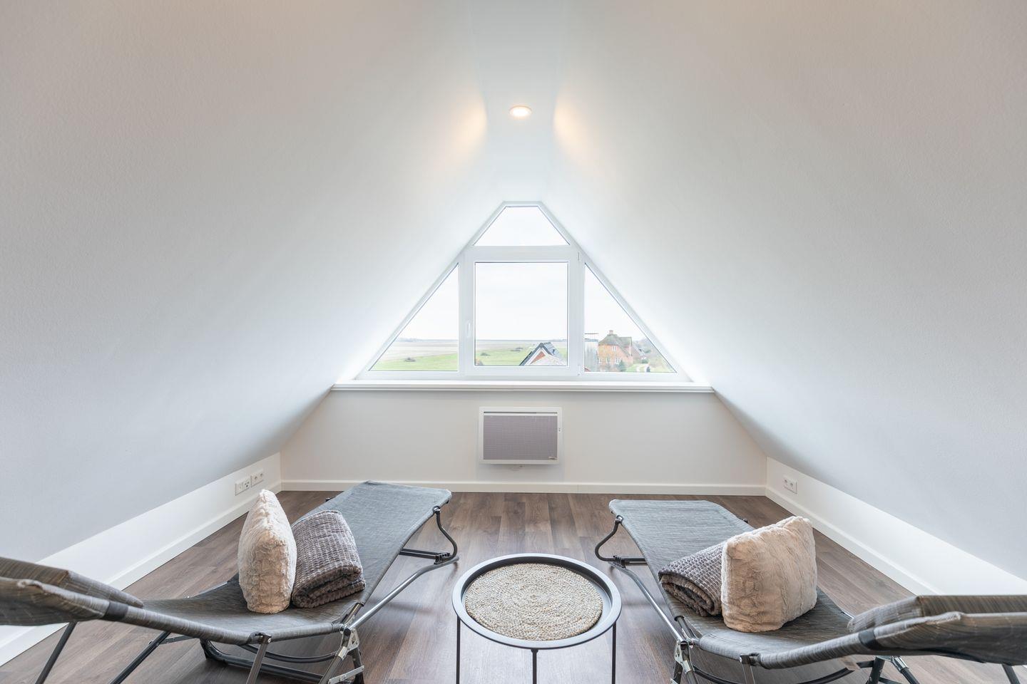 Nach dem Saunieren haben Sie die Möglichkeit, sich im zweiten Stockwerk auf zwei Liegen zu entspannen und durch ein großes Fenster die umliegende Landschaft zu bewundern.