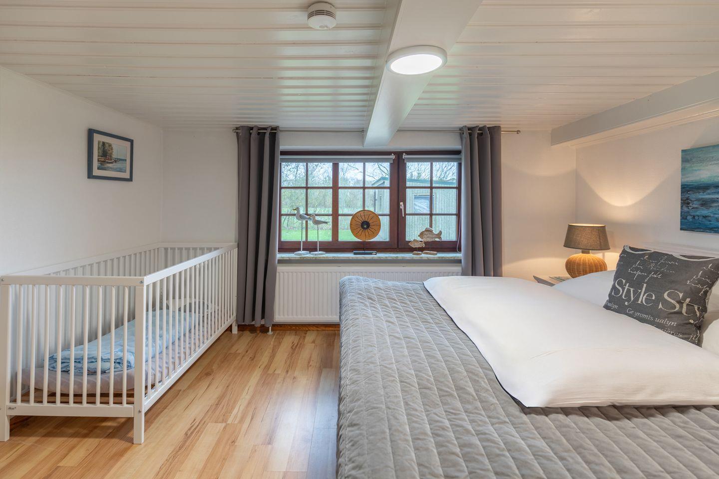 Das Schlafzimmer im Erdgeschoss ist direkt vom Wohnbereich aus zugänglich. Es ist mit einem gemütlichen Doppelbett (180 x 200 cm), zwei Nachttischen, einer Kommode und einem geräumigen Kleiderschrank ausgestattet. Für kleine Gäste steht ein Kinderbett bereit. Aufgrund des Alters des Hauses – über 250 Jahre – sollten größere Personen beim Passieren der Deckenbalken etwas vorsichtig sein, um den Kopf nicht zu stoßen. Dieser historische Charme verleiht dem Raum eine ganz besondere Atmosphäre.
