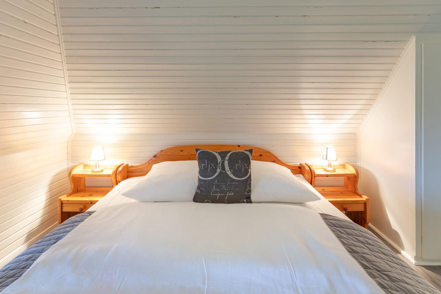 Über eine Treppe gelangen Sie zu den beiden weiteren Schlafräumen des Hauses. Das erste Schlafzimmer ist mit einem großen, robusten Kiefernbett aus Finnland (180 × 200 cm) ausgestattet, ergänzt durch zwei Nachttischschränke. Die tief liegenden Fenster ermöglichen einen direkten Blick in die Natur und laden dazu ein, den Sonnenuntergang zu genießen. Außerdem befindet sich im Obergeschoss ein kleines Kinderzimmer, das mit einem Stockbett (90 × 190 cm) eingerichtet ist. Ein Tisch mit zwei Stühlen bietet Platz zum Basteln und Spielen.