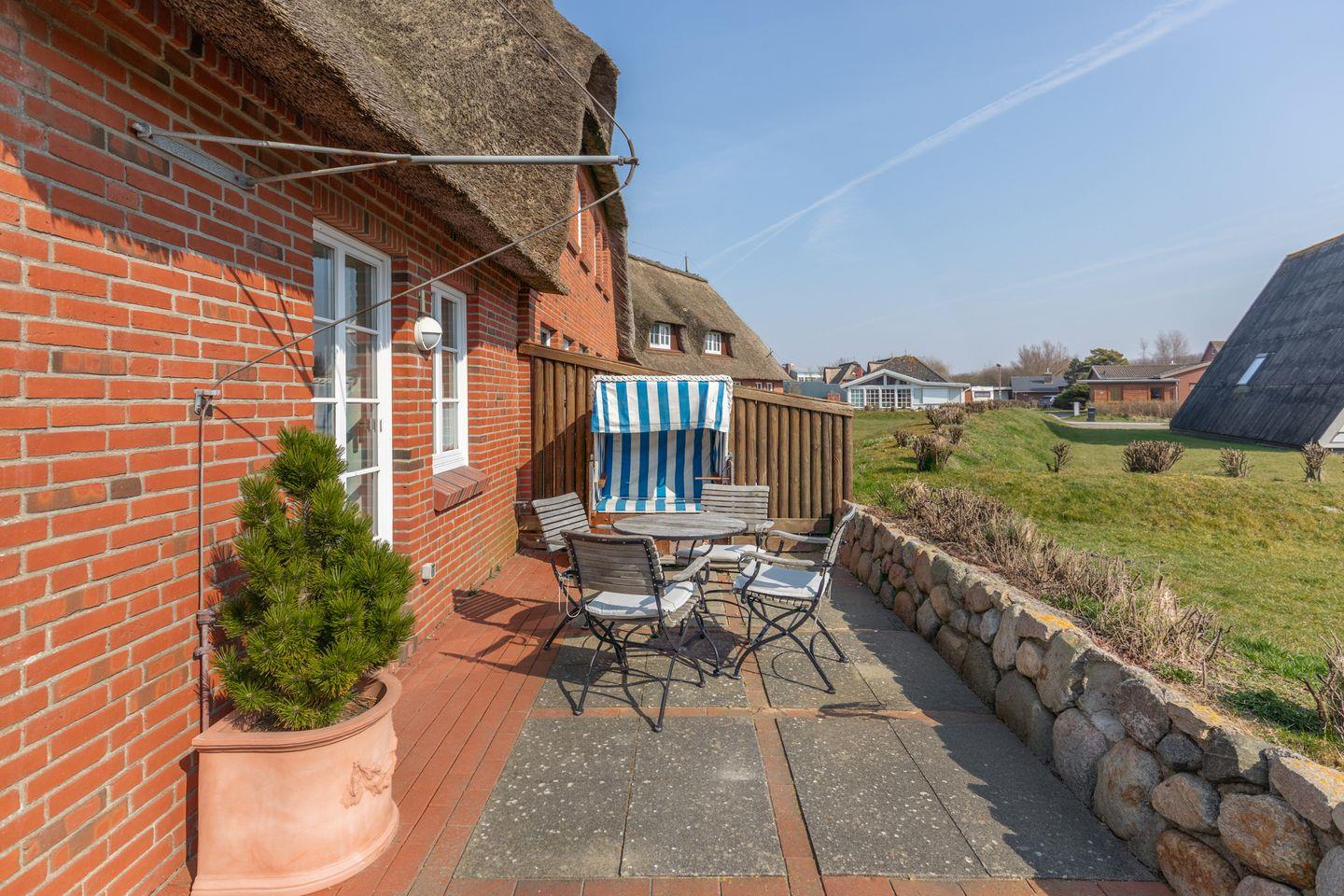 In dem Außenbereich der Unterkunft können Sie Ihren Tag auf der Terrasse in dem dazugehörigen Strandkorb gemütlich ausklingen lassen. Auf der Liegewiese können Sie in der Sonne entspannen oder aber auch hervorragend mit Ihrem Vierbeiner spielen.