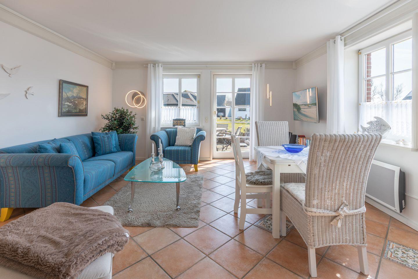Die 90 qm große Wohnung lädt zu einem erholsamen Nordseeurlaub ein: Das helle Wohnzimmer mit einem Zweisitzersofa und zwei Sesseln stellt den idealen Rückzugsort für entspannte Stunden dar.