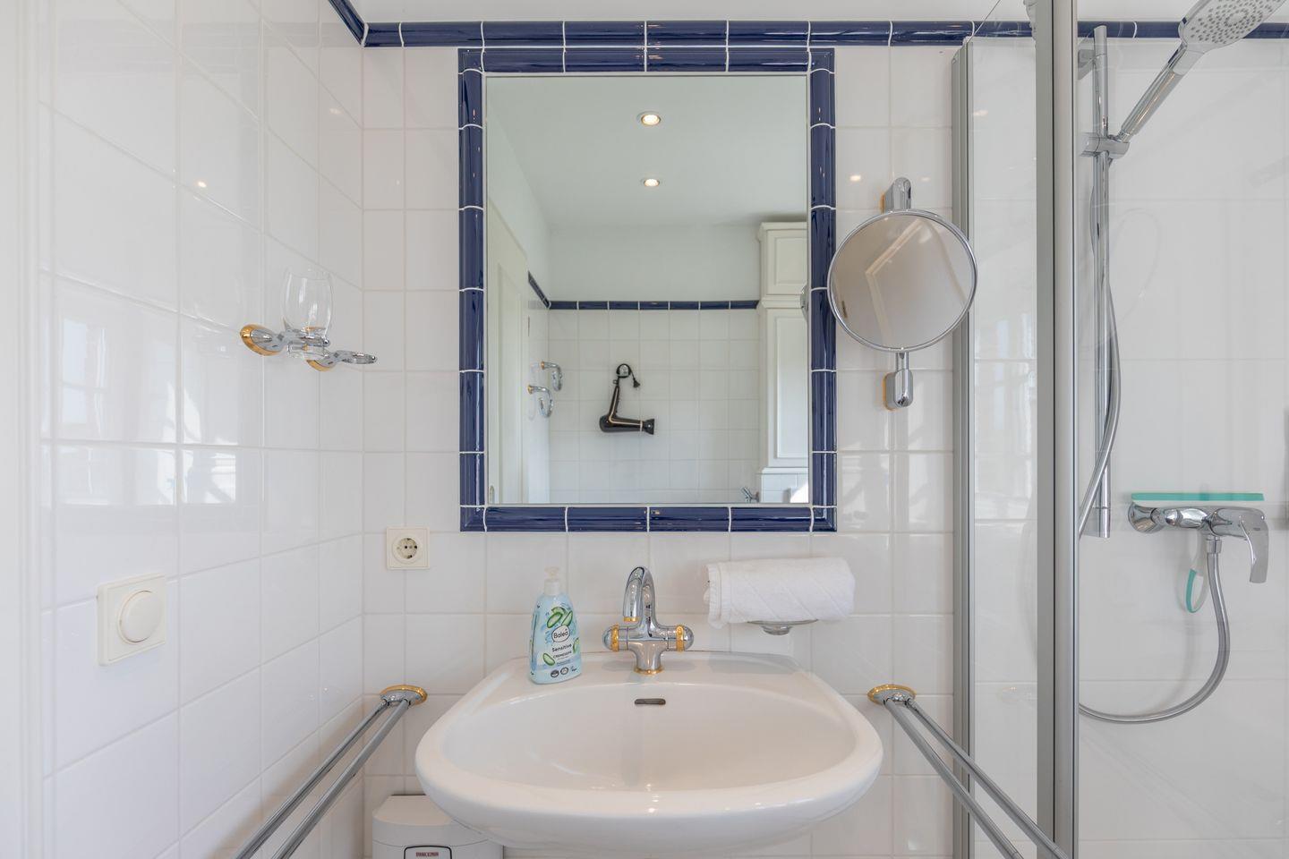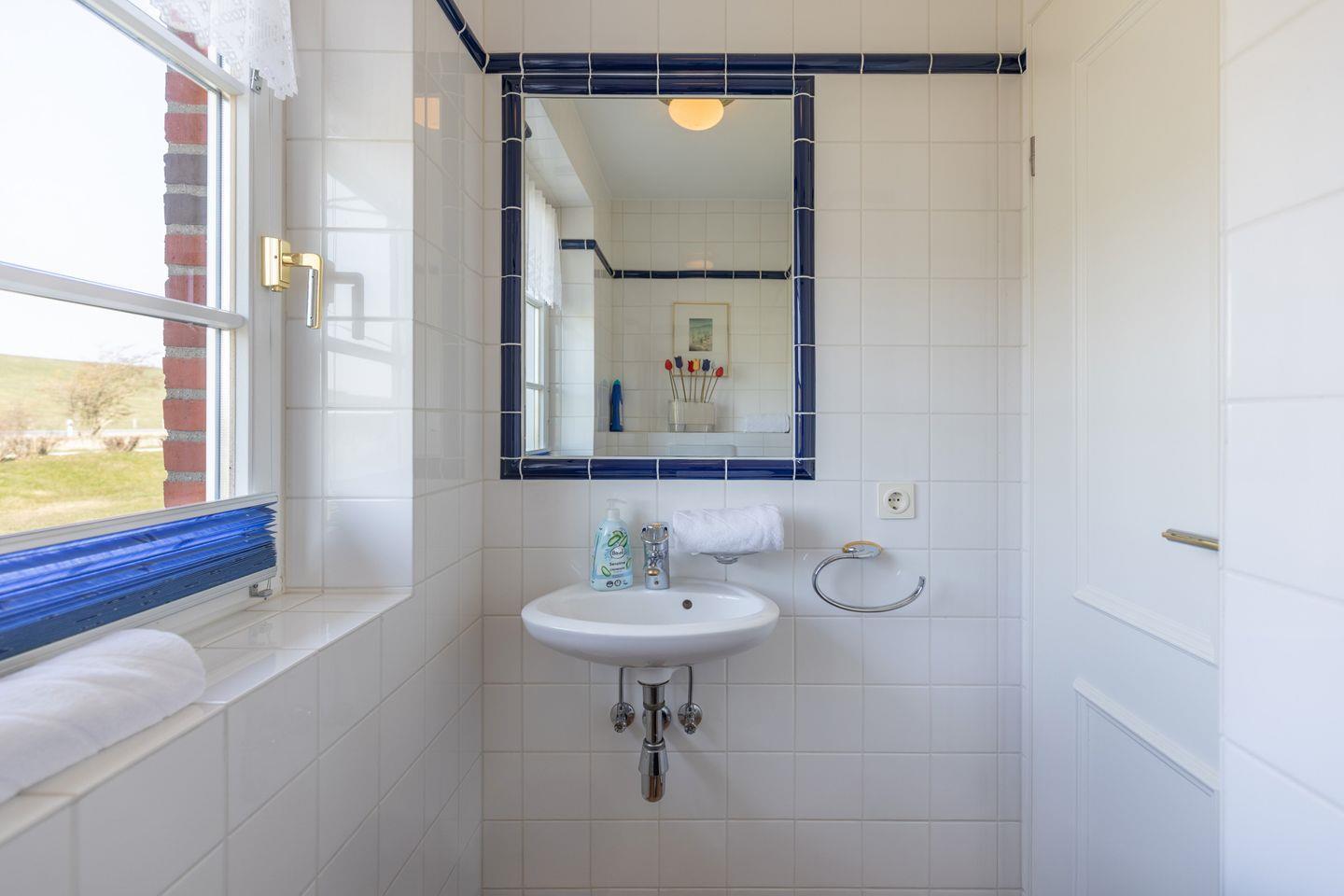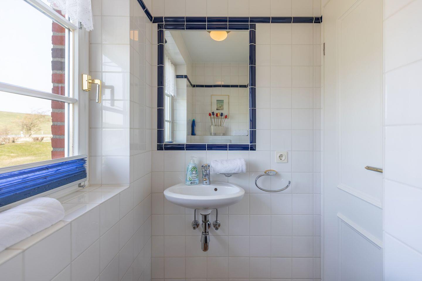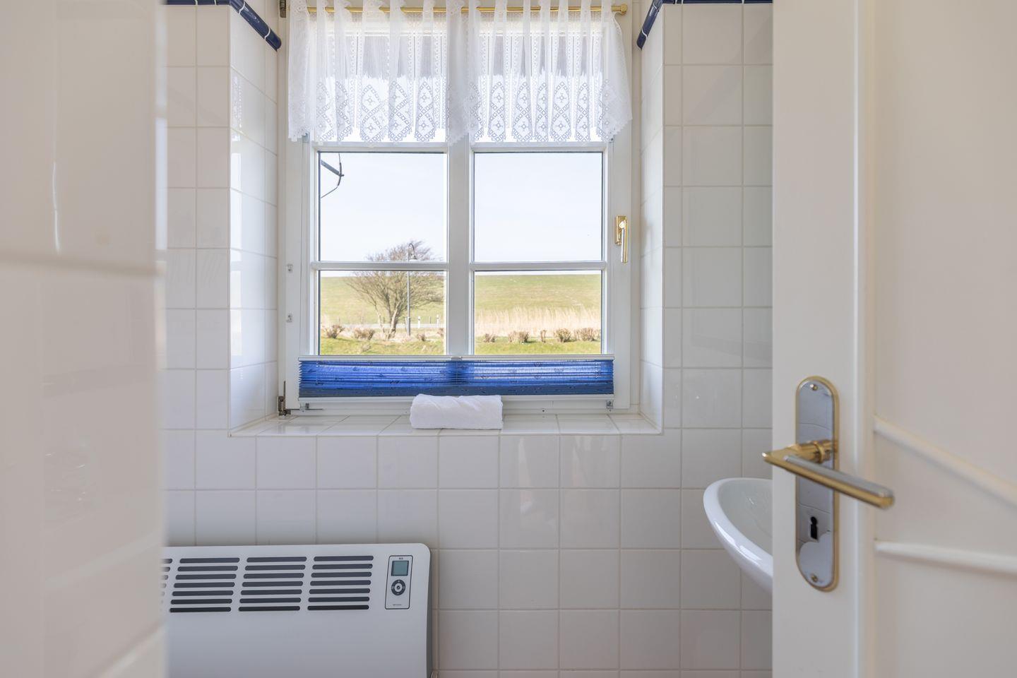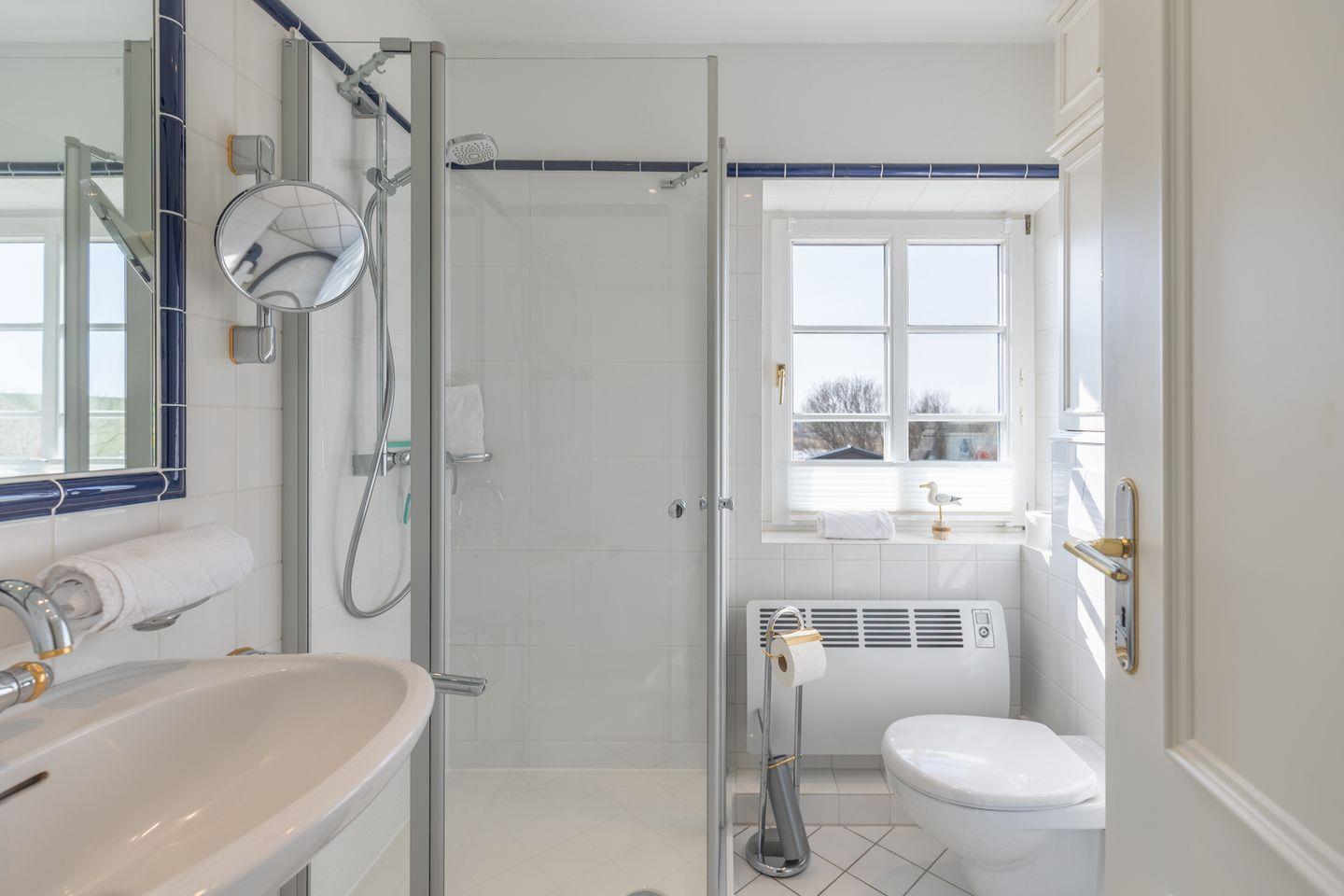 Das helle Badezimmer ist mit einer Dusche sowie einem Waschtrockner ausgestattet. Ein weiteres Gäste-WC mit Waschbecken befindet sich im Erdgeschoss.