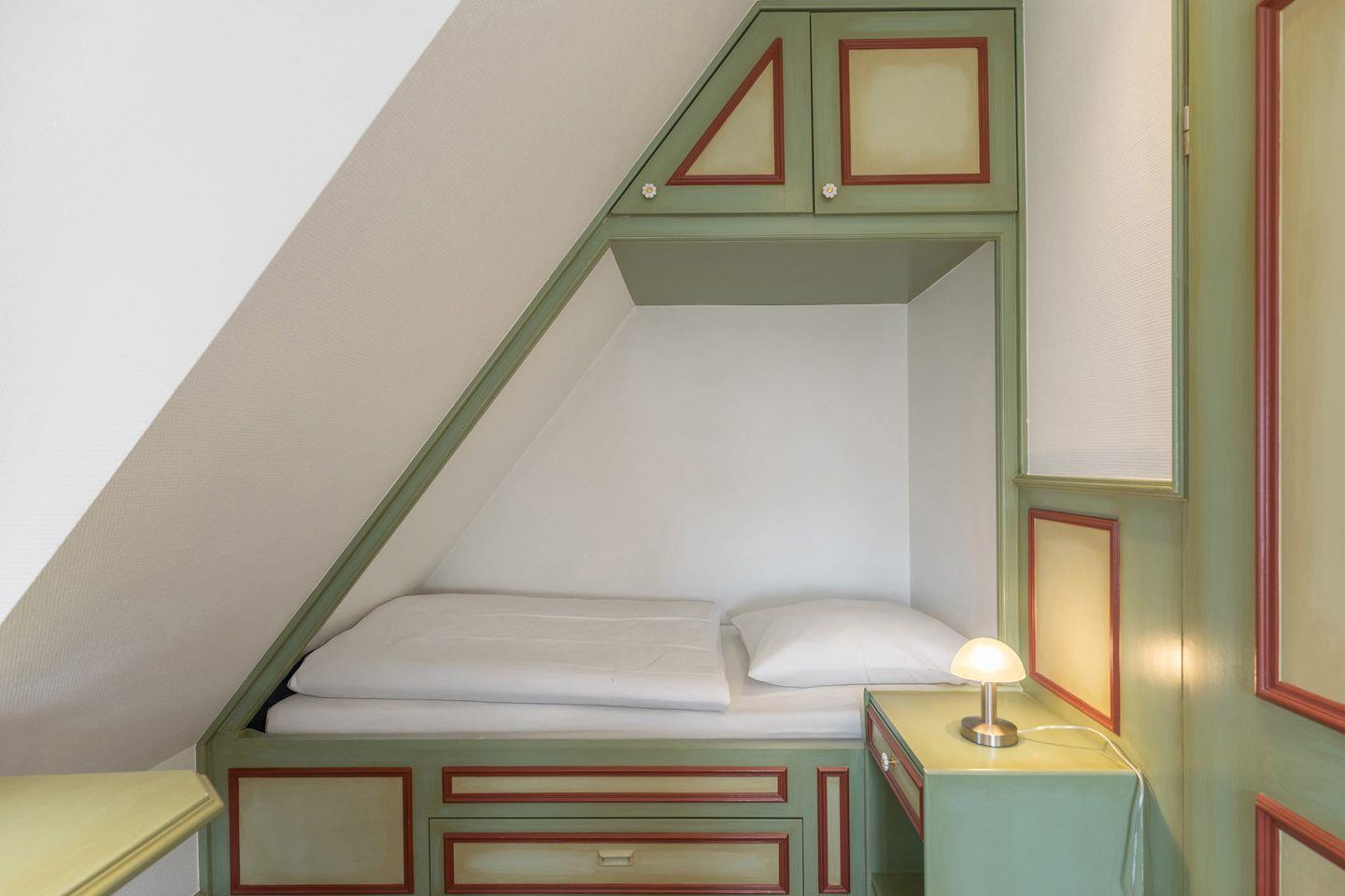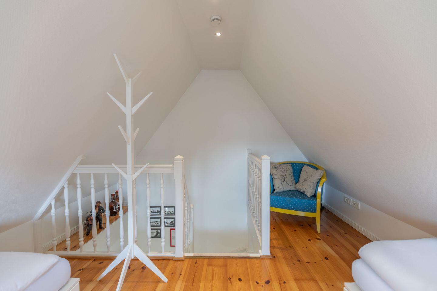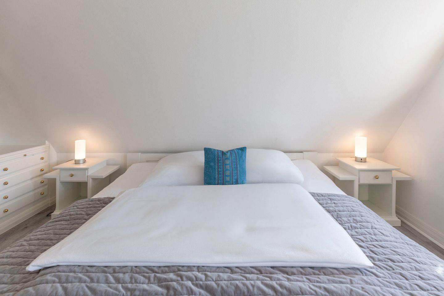 Im ersten Obergeschoss befindet sich neben einem gemütlichen Doppelbett (200 x 200) ein weiteres Schlafzimmer mit 2 Alkovenbetten (je 90 x 200). Im zweiten Obergeschoss finden zwei weitere Gäste in zwei Einzelbetten (je 90 x 200) einen Platz zum Träumen.