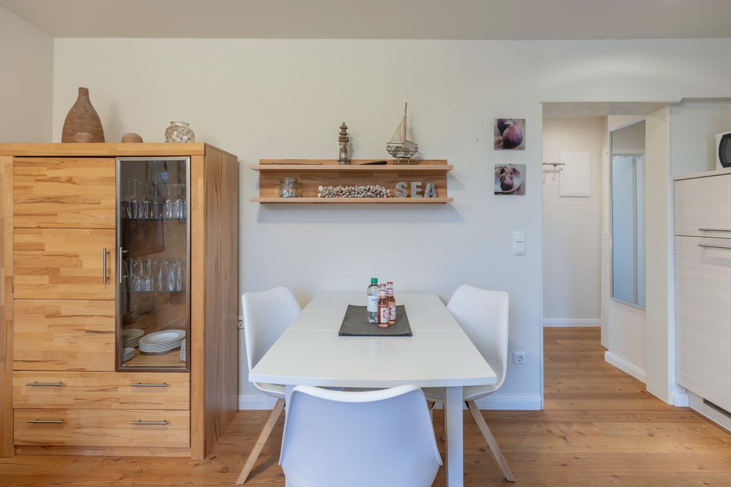 Auf 42 m² bietet die Ferienwohnung Platz für bis zu drei Personen und verfügt über zwei gemütliche Schlafzimmer. Die offene, voll ausgestattete Küche mit Ceranfeld, Backofen, Spülmaschine und Mikrowelle lädt zum gemeinsamen Kochen ein. Der angrenzende Essbereich sorgt für gesellige Stunden, während der Wohnbereich mit Sofa und TV zum Entspannen einlädt. Das moderne Badezimmer ist mit Dusche, Waschbecken und WC ausgestattet.
