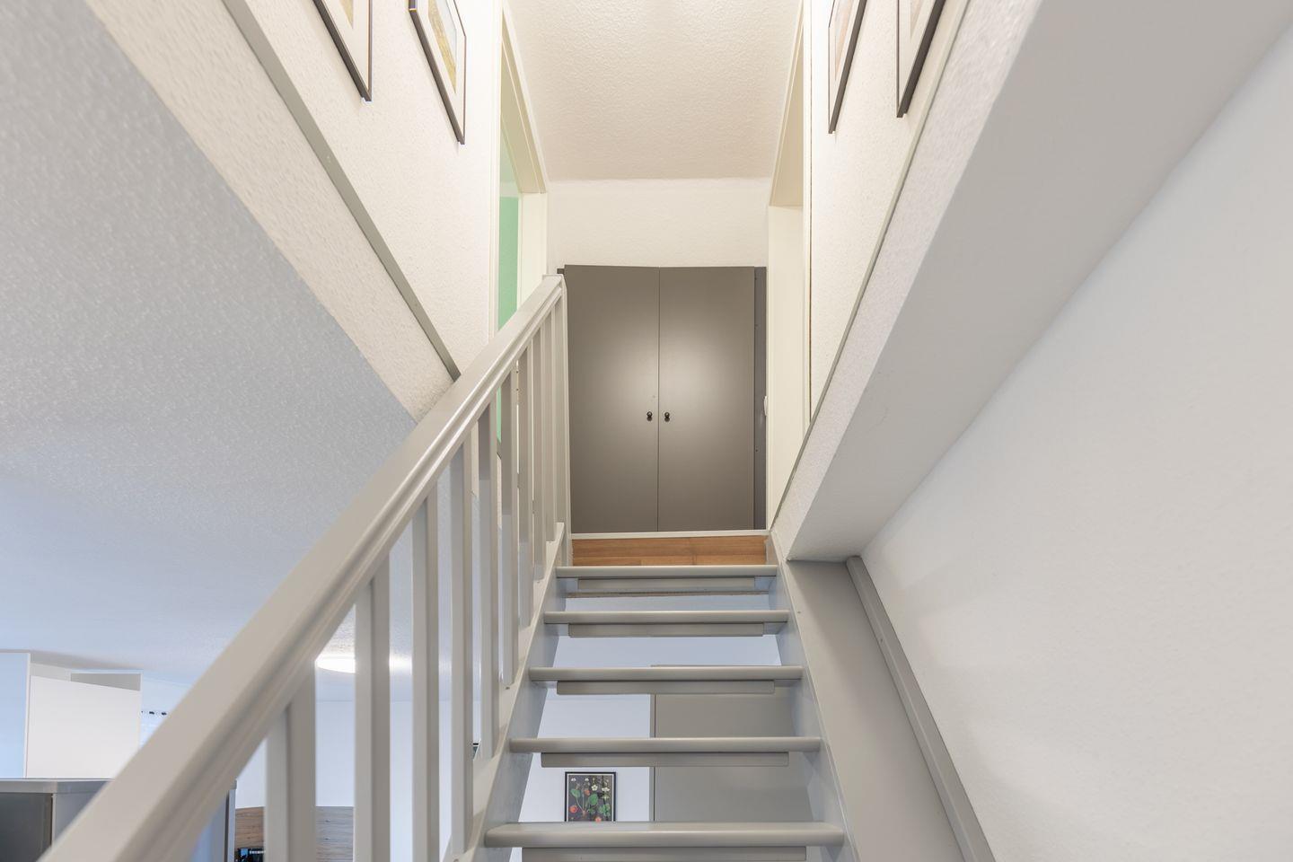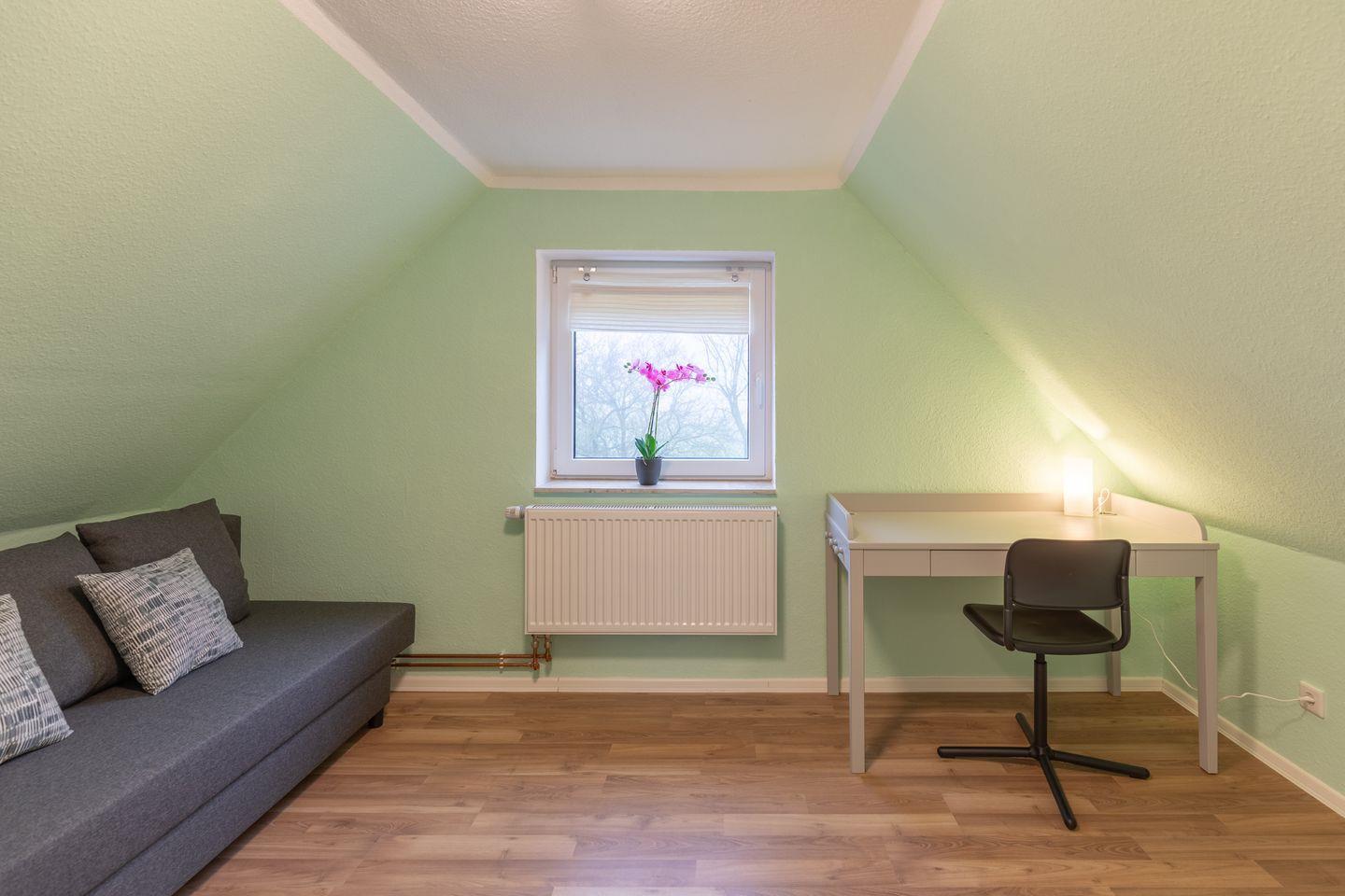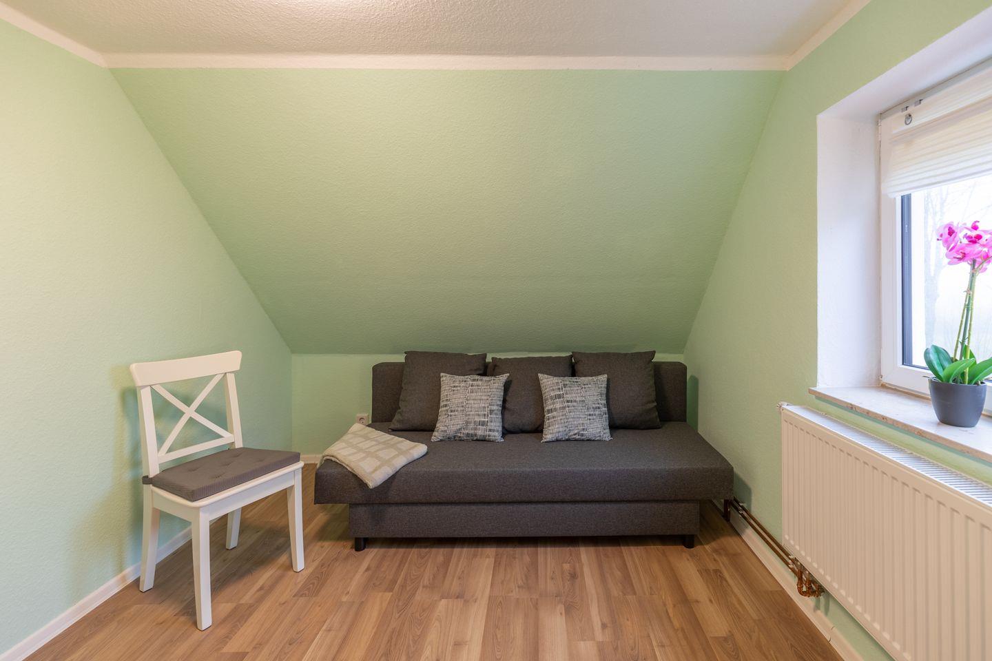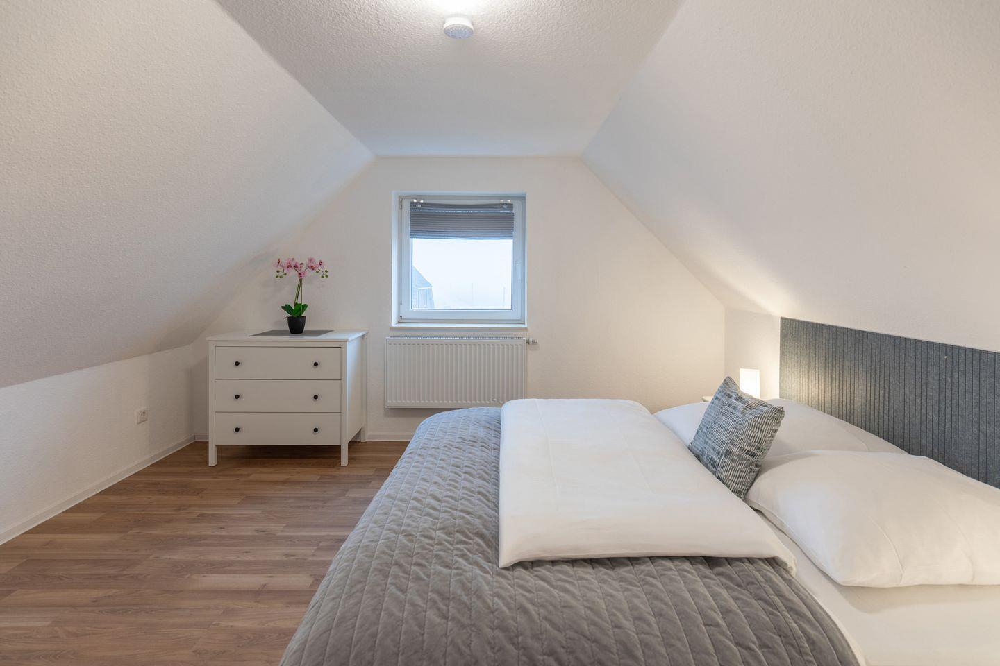 Über eine Treppe gelangen Sie in das Obergeschoss, wo sich zwei gemütliche Schlafzimmer befinden. Das Hauptschlafzimmer ist mit einem großzügigen Doppelbett (160 x 200 cm) ausgestattet und in ruhigen Farbtönen gestaltet. Ein Kleiderschrank und eine Kommode bieten ausreichend Stauraum. Das zweite Schlafzimmer ist flexibel nutzbar und verfügt über ein Schlafsofa, das als zusätzliche Schlafmöglichkeit dient. Ein Schreibtisch und eine Kommode ergänzen die Einrichtung, sodass der Raum auch als Rückzugsort oder Arbeitsbereich genutzt werden kann.