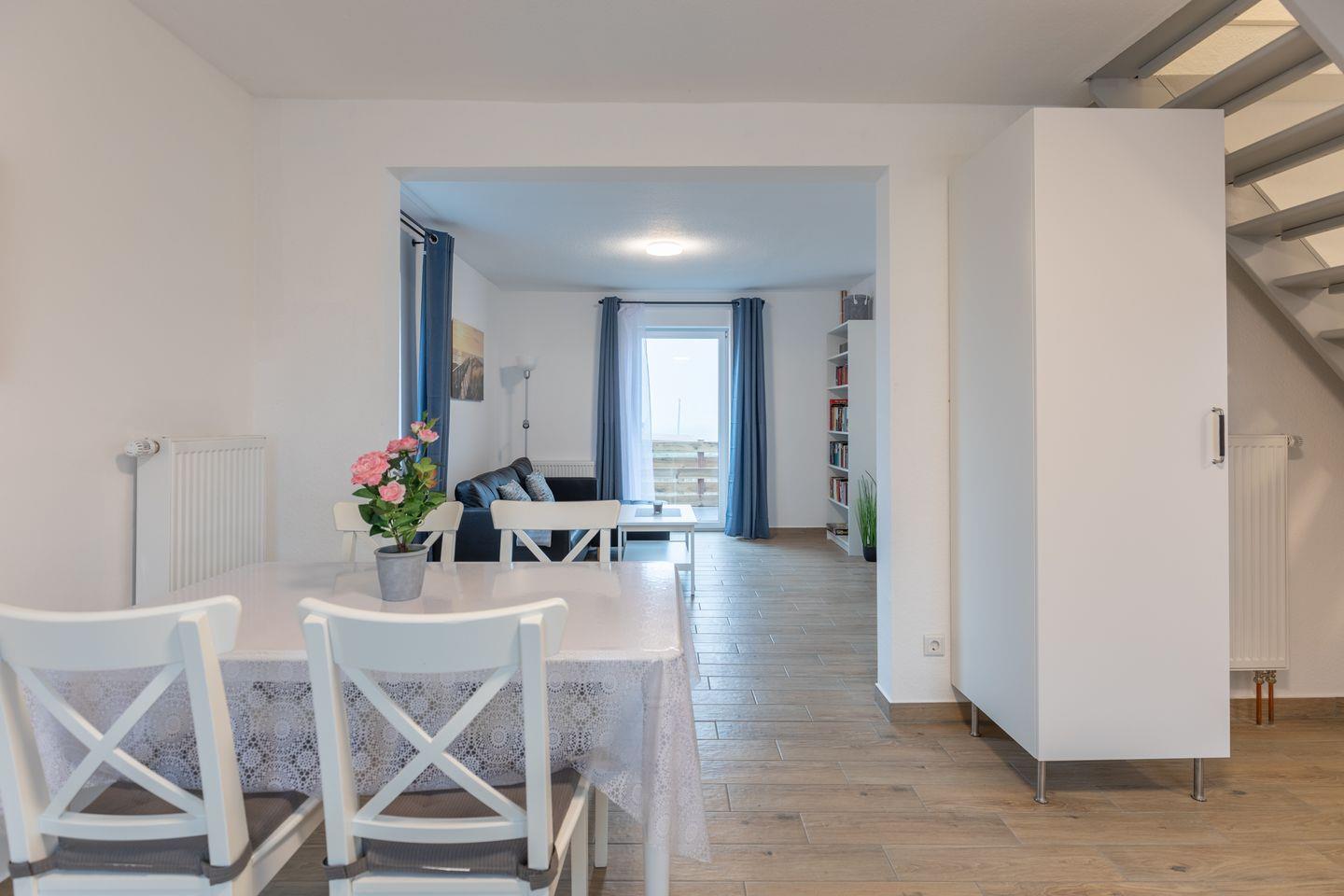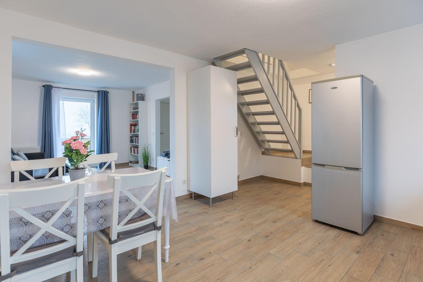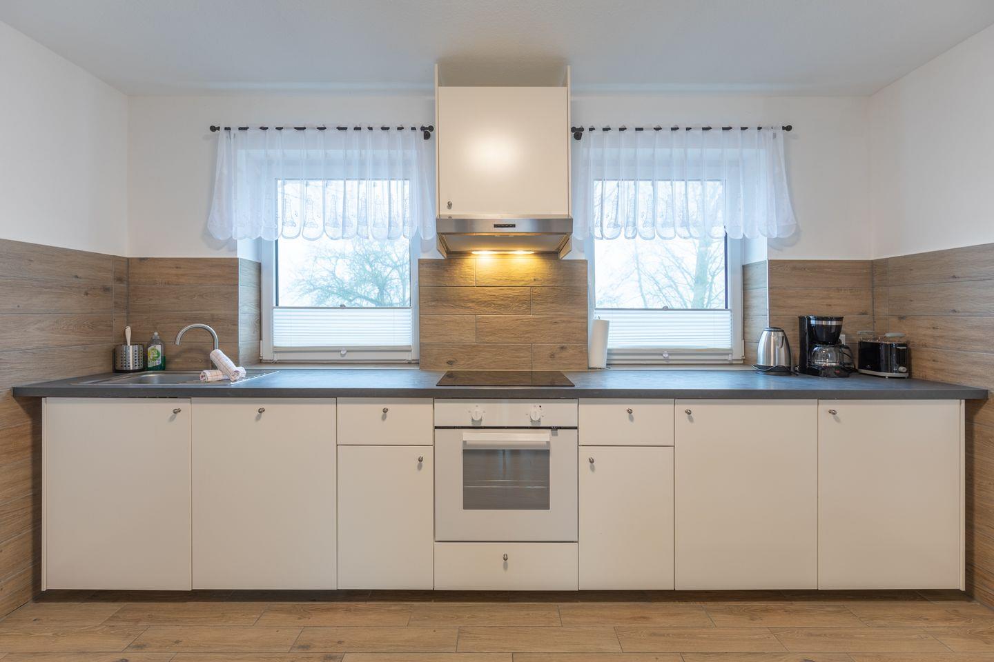 Die offene Küche kombiniert Funktionalität mit Stil: Helle Fronten und eine dunkle Arbeitsplatte schaffen eine moderne, aber gemütliche Atmosphäre. Zur Ausstattung gehören ein Herd, ein Backofen, eine Kaffeemaschine, ein Wasserkocher, ein Toaster und vieles mehr - sodass Sie bestens versorgt sind. Der angrenzende Essbereich fügt sich harmonisch in den offenen Wohnbereich ein.