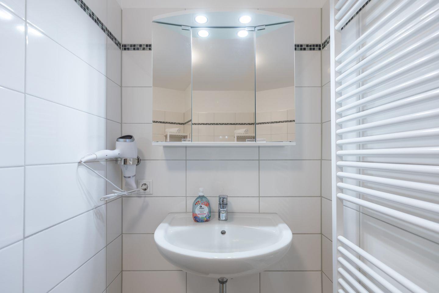Das lichtdurchflutete Badezimmer ist mit einer Dusche, einem Waschbecken mit praktischem Spiegelschrank, einer Waschmaschine und einem Handtuchheizkörper ausgestattet.