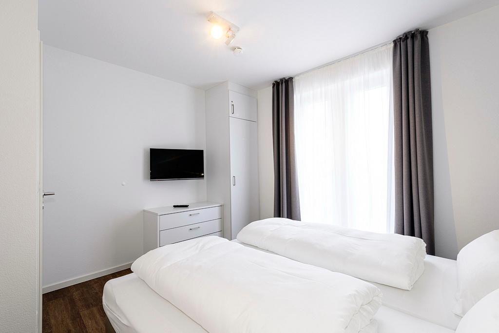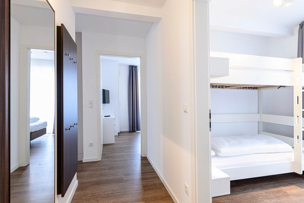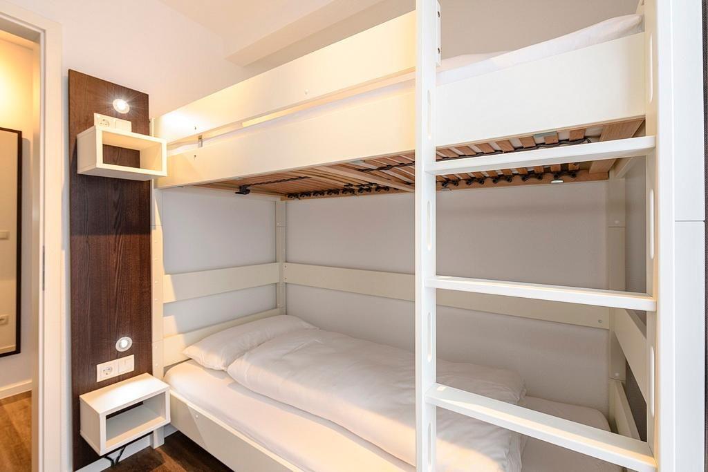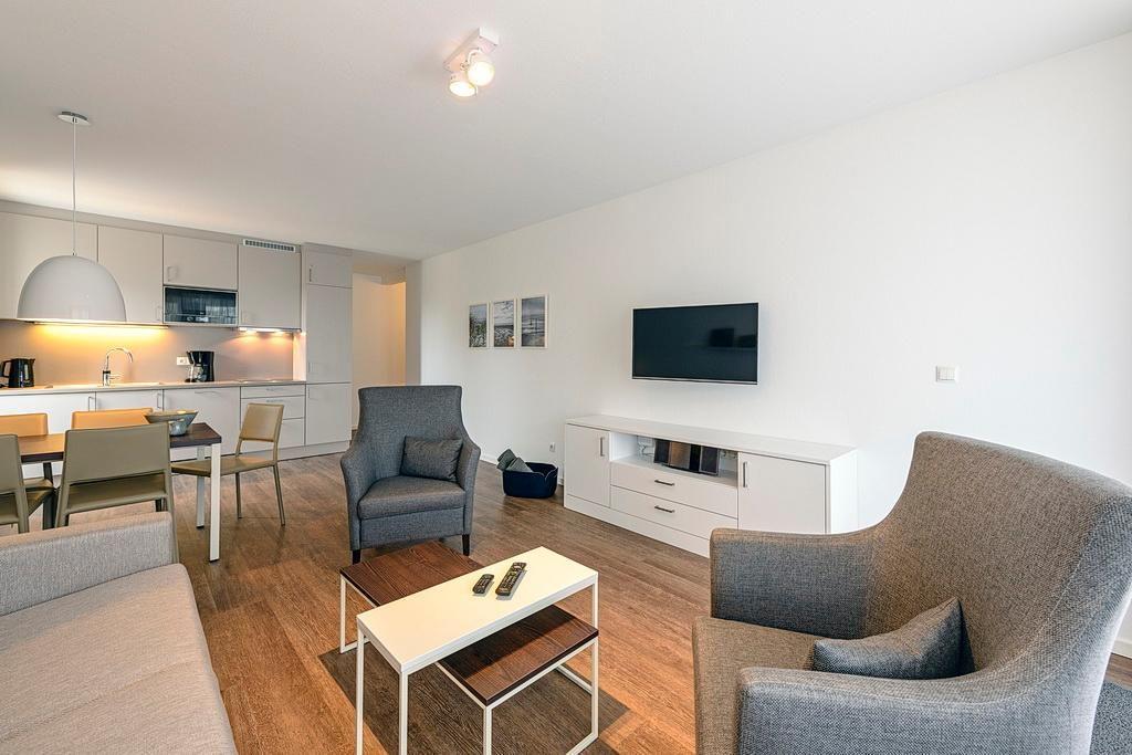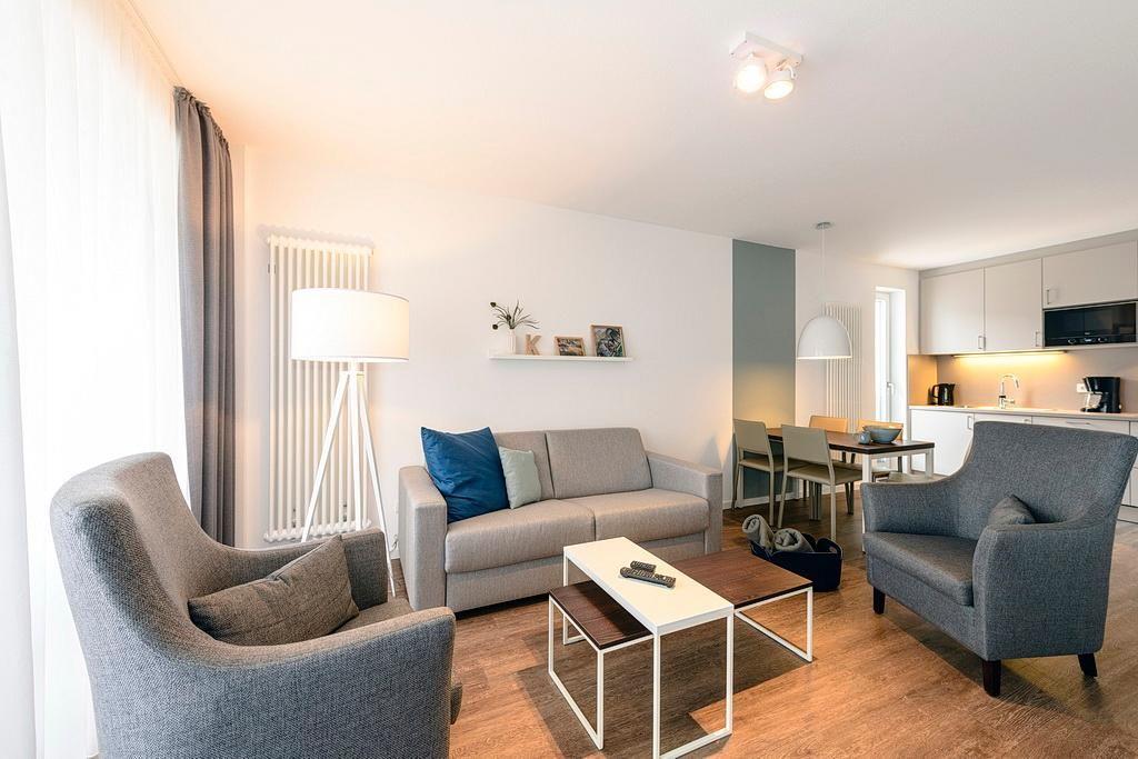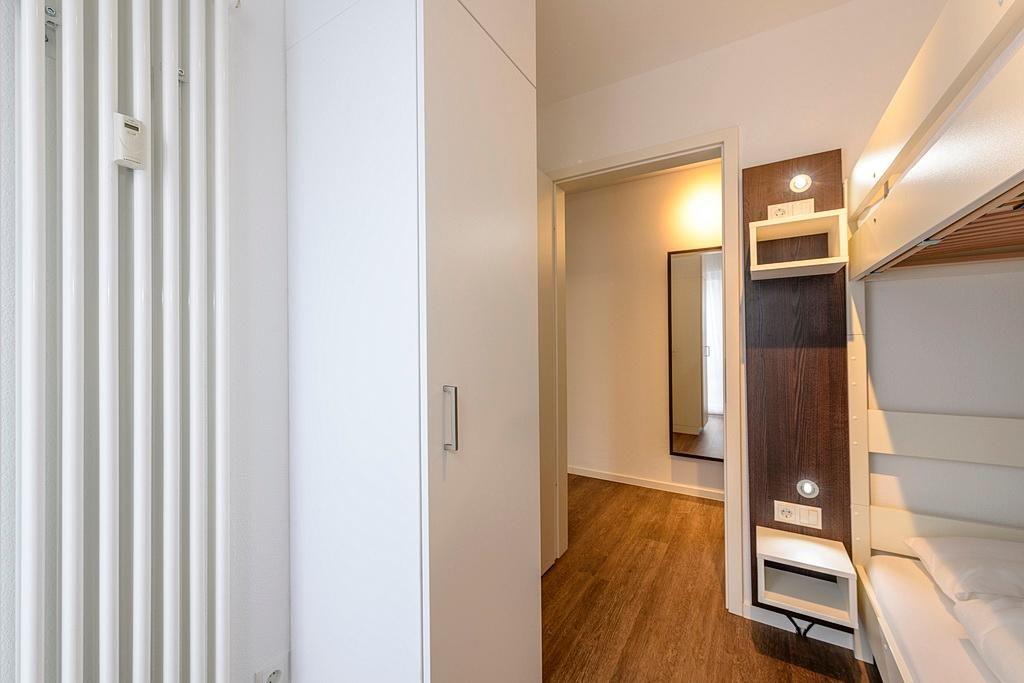 Das geschmackvoll eingerichtete Nichtraucher-Apartment verfügt über kostenfreies WLAN. Der Wohnbereich mit Schlafcouch, bietet eine voll ausgestattete offene Küchenzeile mit Geschirrspüler, Gefrierfach, Kaffeemaschine, Toaster, Wasserkocher und Mikrowelle mit Backfunktion sowie einen großen Flatscreen-TV und ein Radio. Das Apartment verfügt über einen Esstisch für 5 Personen und einen behaglichen Sitzbereich. Zwei separate Schlafzimmer stehen euch zur Verfügung. Eines davon verfügt über ein Doppelbett und einen eigenen Flatscreen-TV, ein weiteres über ein Etagenbett. Ein Kinderbett kann gegen Entgelt aufgestellt werden. Im stilvollen Badezimmer befinden sich eine große begehbare Dusche sowie ein Waschtisch mit Föhn und Kosmetikspiegel. Nach einem erlebnisreichen Urlaubstag lässt sich auf dem überdachten und mit Gartenmöbeln ausgestatteten Balkon wunderbar entspannen.