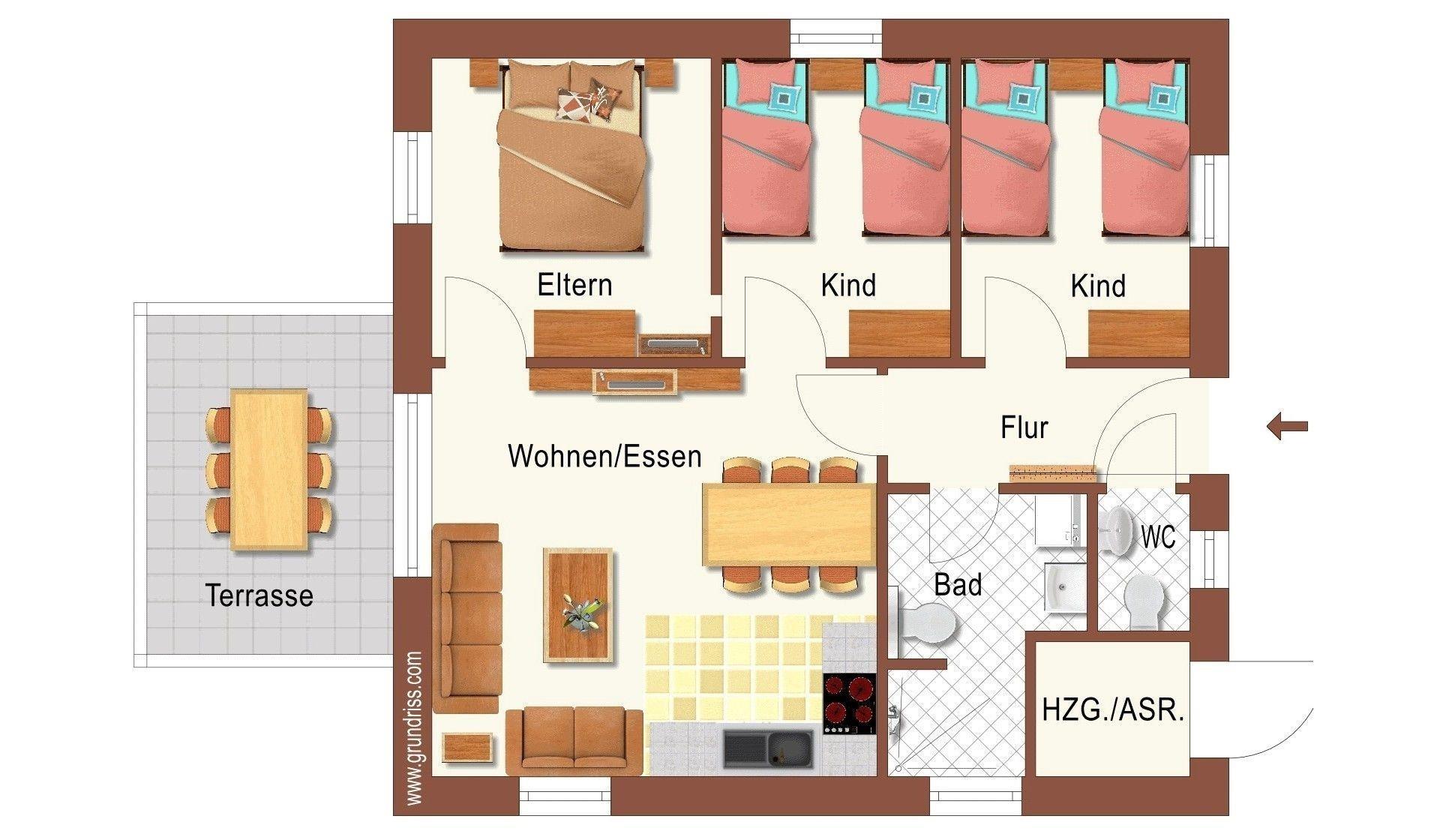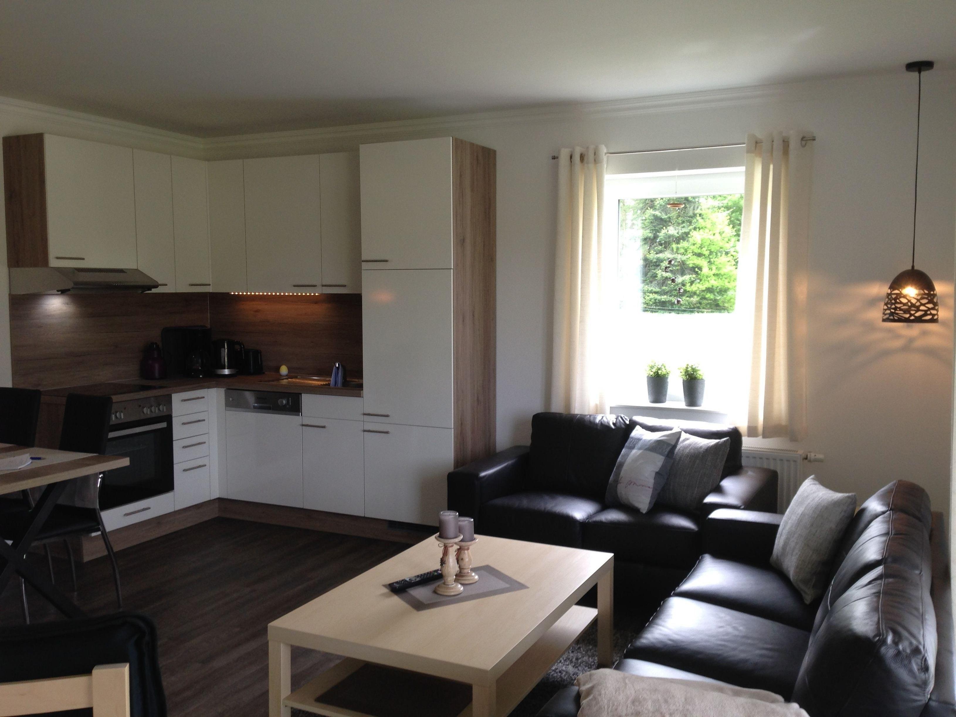 Badezimmer mit WC, Waschmaschine, ebenerdiger Dusche und Fußbodenheizung, Flur, zusätzliches WC, Urgemütlicher Wohnbereich mit Küche, Wohnlandschaft, Essbereich und TV. 2 Schlafzimmer mit je 2 Boxspringbetten, ein Schlafzimmer mit Doppel-Boxspringbett und TV. Alle Betten haben eine Leselampe. Zusätzlich gibt es einen Geräte- und Lagerraum z. B. für den Grill.
