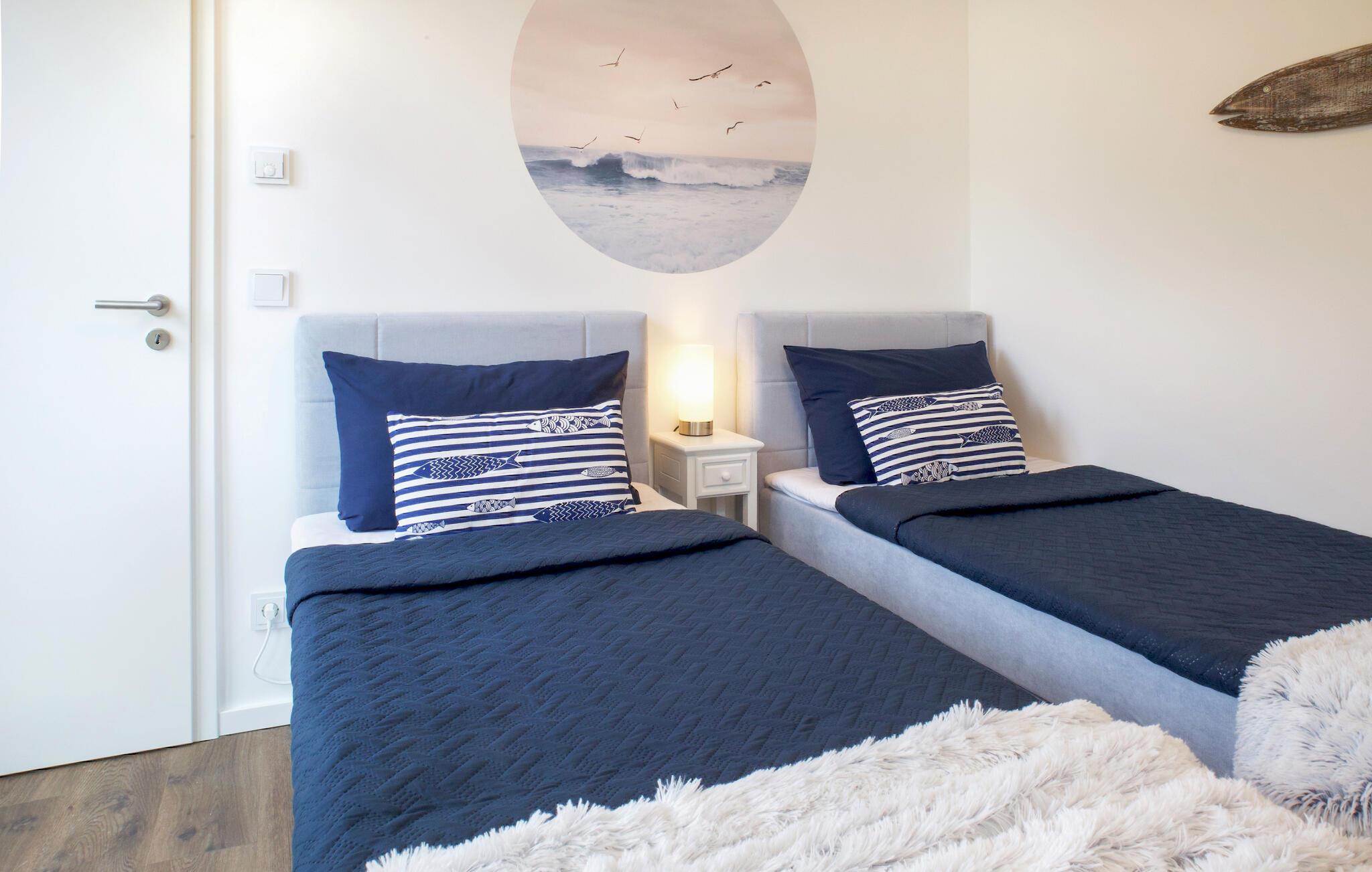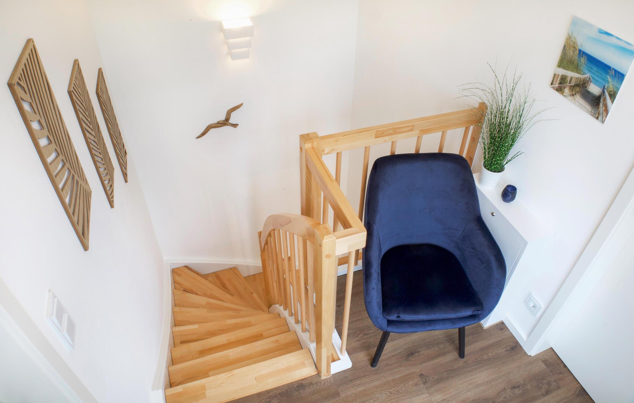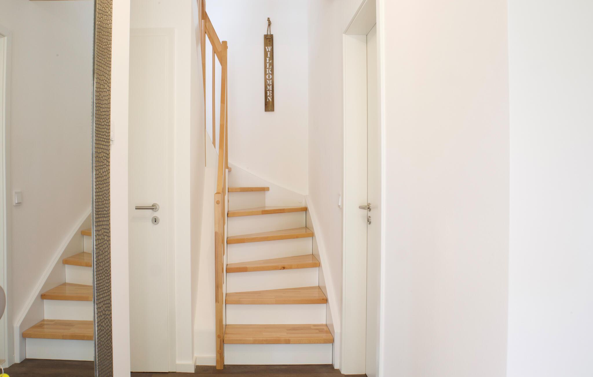 Ihr Haus erstreckt sich über zwei Etagen. Im Erdgeschoss befindet sich ein offener, gemütlicher Wohnbereich mit angrenzender Gartenterrasse und einer modernen Einbauküche, welche durch bodentiefe Fenster zum Verweilen einlädt. An kalten Tagen können Sie es sich vor dem eingebauten Kamin gemütlich machen. Neben dem Wohnbereich befindet sich ein helles Badezimmer mit Duschkabine und Infrarotsauna. Vom Erdgeschoss gelangt man über eine geschwungene Treppe in das Obergeschoss des Doppelhauses, wo zwei geräumige Schlafzimmer auf Sie warten. Für eine erholsame Nachtruhe und Ihren Komfort finden Sie im ganzen Haus Verdunklungsrollos und Insektenschutz an den Fenstern. Für eine erholsame Nachtruhe und Ihren Komfort finden Sie im ganzen Haus Plissées, im Obergeschoss auch mit Verdunklungsfunktion, und Insektenschutz an den Fenstern. Genießen Sie die schöne Nordseeluft von dem umlaufenden Balkon, welcher von beiden Schlafzimmern aus zugänglich ist. Hochwertige Möbel und eine gelungene Raumaufteilung machen dieses Ferienhaus zu einem traumhaften Urlaubsdomizil.