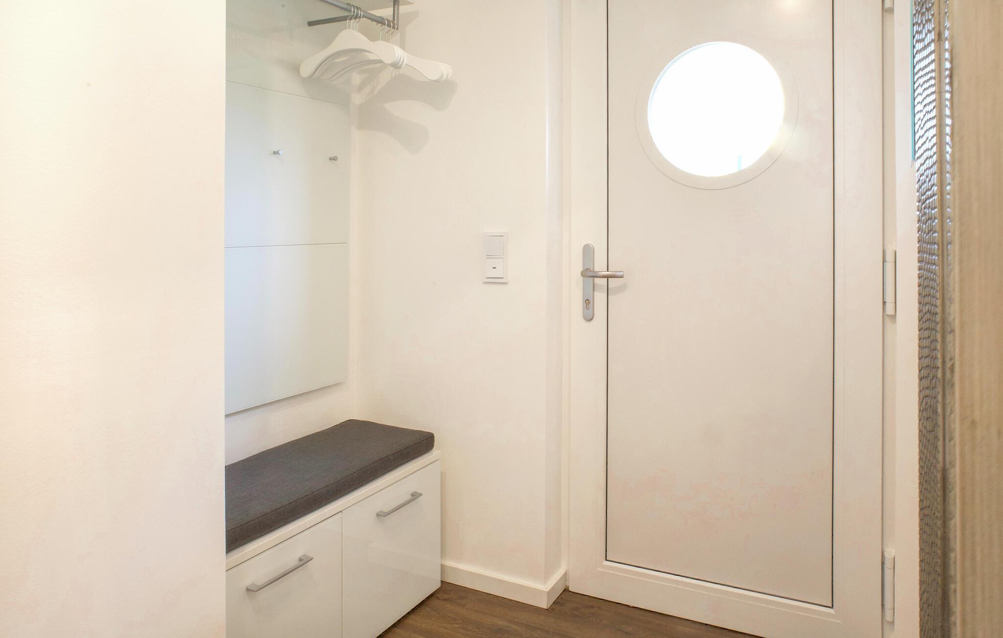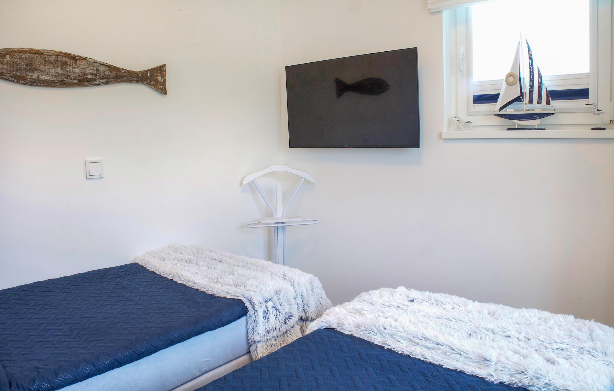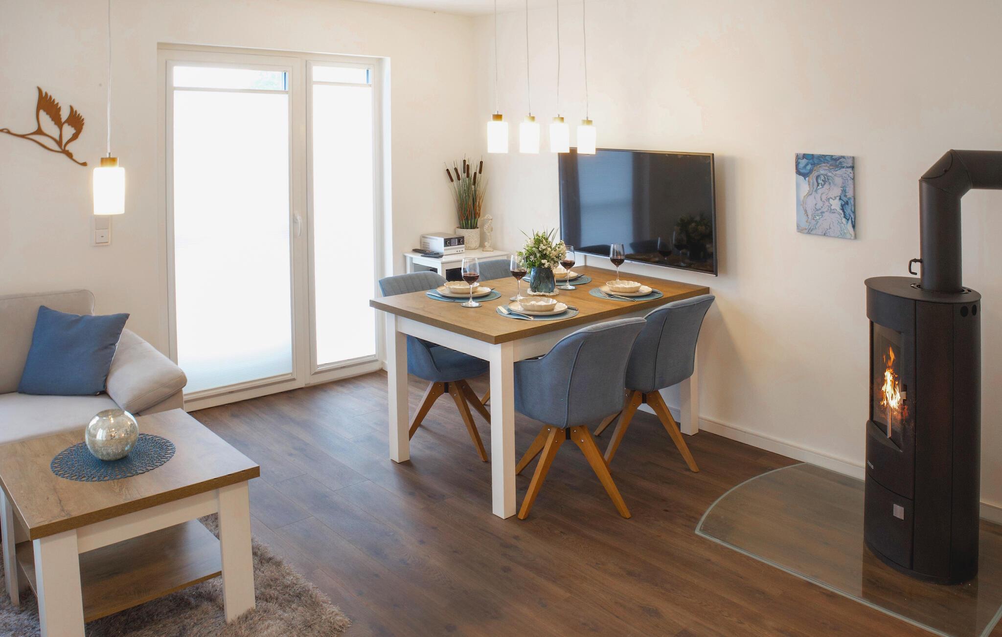 Ihr Haus erstreckt sich über zwei Etagen. Im Erdgeschoss befindet sich ein offener, gemütlicher Wohnbereich mit angrenzender Gartenterrasse und einer modernen Einbauküche, welche durch bodentiefe Fenster zum Verweilen einlädt. An kalten Tagen können Sie es sich vor dem eingebauten Kamin gemütlich machen. Neben dem Wohnbereich befindet sich ein helles Badezimmer mit Duschkabine und Infrarotsauna. Vom Erdgeschoss gelangt man über eine geschwungene Treppe in das Obergeschoss des Doppelhauses, wo zwei geräumige Schlafzimmer auf Sie warten. Für eine erholsame Nachtruhe und Ihren Komfort finden Sie im ganzen Haus Verdunklungsrollos und Insektenschutz an den Fenstern. Für eine erholsame Nachtruhe und Ihren Komfort finden Sie im ganzen Haus Plissées, im Obergeschoss auch mit Verdunklungsfunktion, und Insektenschutz an den Fenstern. Genießen Sie die schöne Nordseeluft von dem umlaufenden Balkon, welcher von beiden Schlafzimmern aus zugänglich ist. Hochwertige Möbel und eine gelungene Raumaufteilung machen dieses Ferienhaus zu einem traumhaften Urlaubsdomizil.