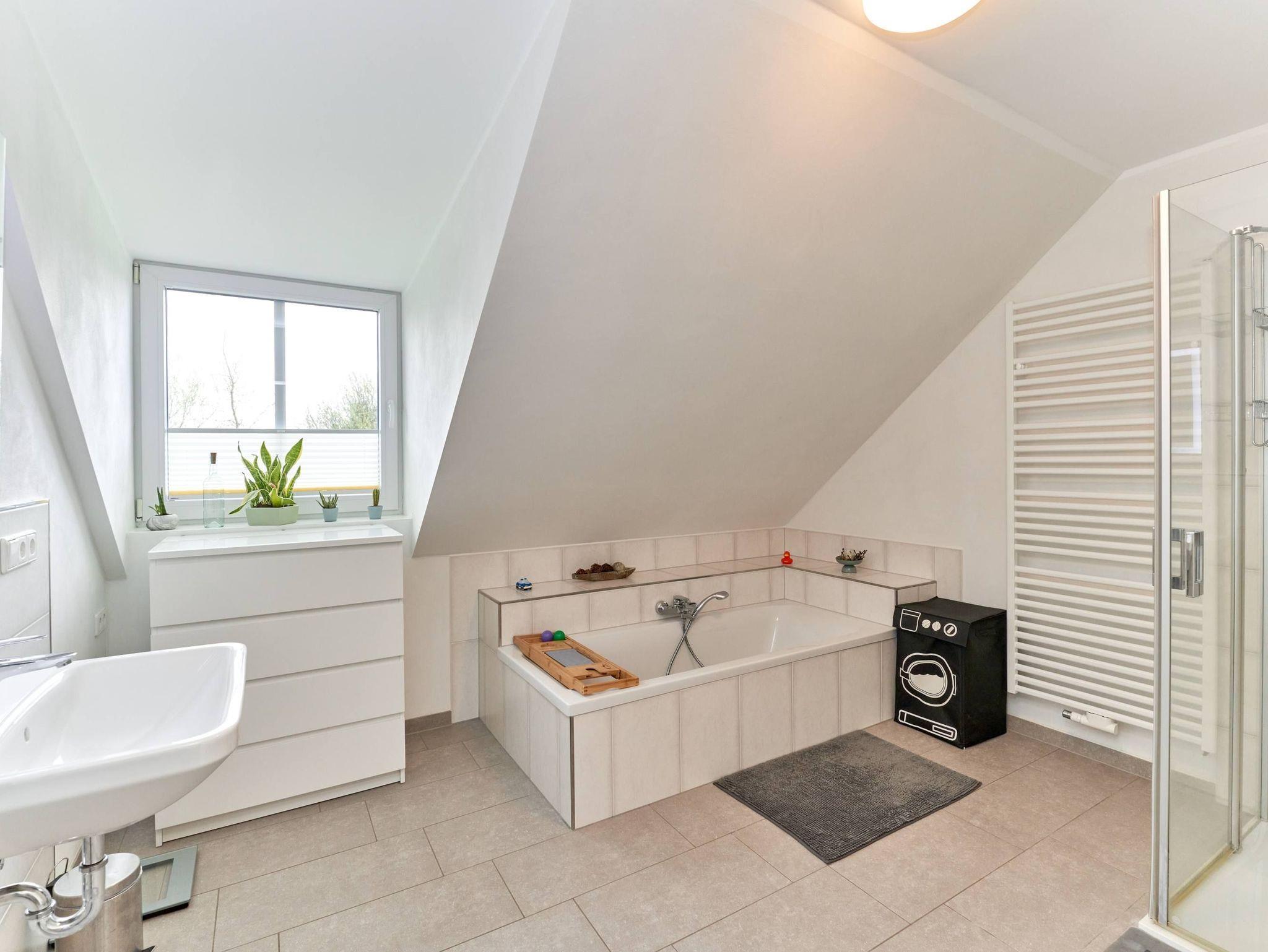 Im Dachgeschoss befinden sich zwei gemütliche Schlafzimmer, die Ihnen eine erholsame Nachtruhe garantieren. Zudem erwartet Sie ein großes Badezimmer mit separater Badewanne und Dusche, Toilette und Waschbecken ? ideal für entspannende Wellnessmomente nach einem aktiven Tag an der Nordsee. Ein Ankleidezimmer bietet Ihnen zusätzlichen Stauraum für Ihre Kleidung und persönlichen Dinge.