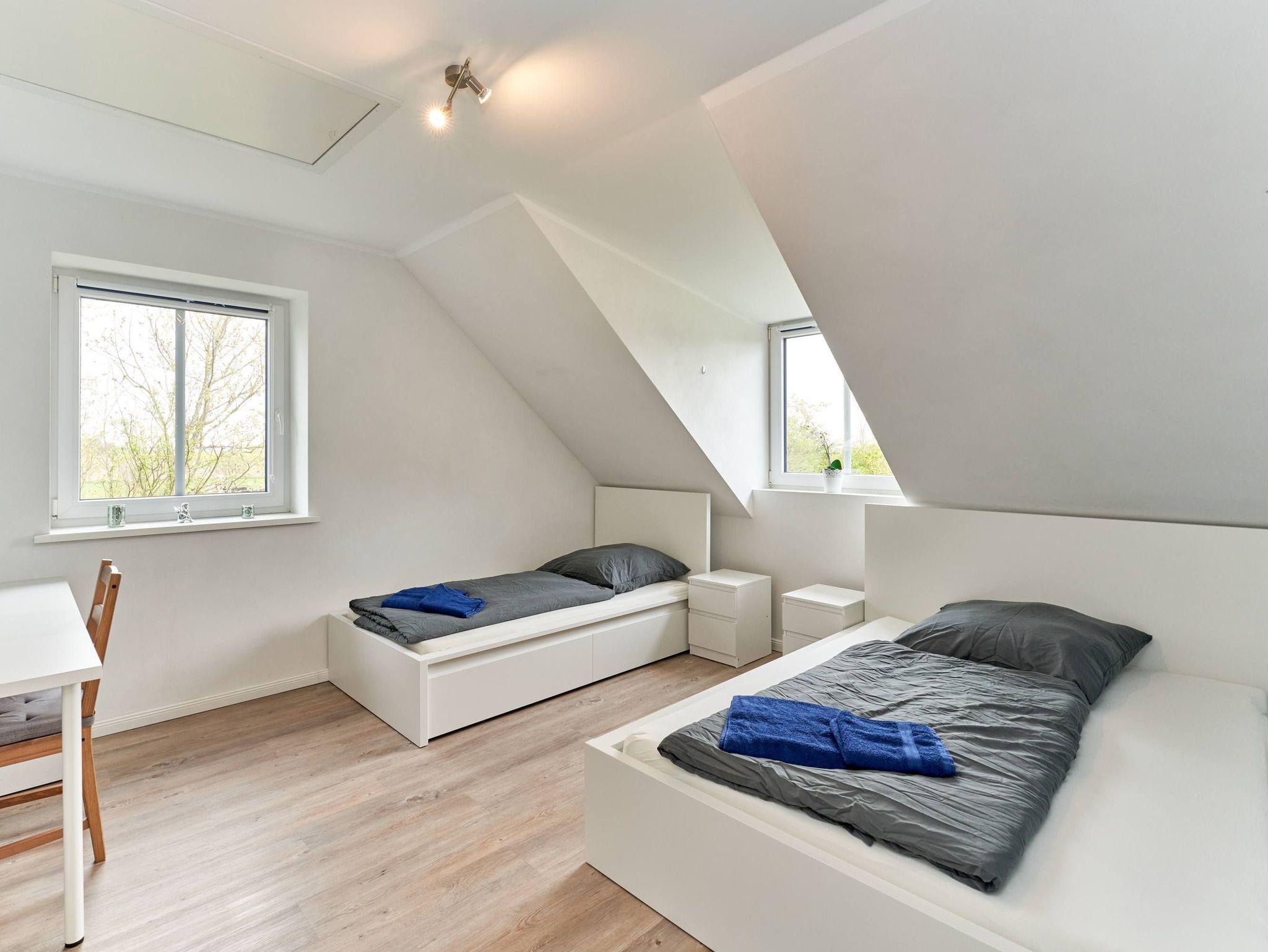 Im Dachgeschoss befinden sich zwei gemütliche Schlafzimmer, die Ihnen eine erholsame Nachtruhe garantieren. Zudem erwartet Sie ein großes Badezimmer mit separater Badewanne und Dusche, Toilette und Waschbecken ideal für entspannende Wellnessmomente nach einem aktiven Tag an der Nordsee. Ein Ankleidezimmer bietet Ihnen zusätzlichen Stauraum für Ihre Kleidung und persönlichen Dinge.